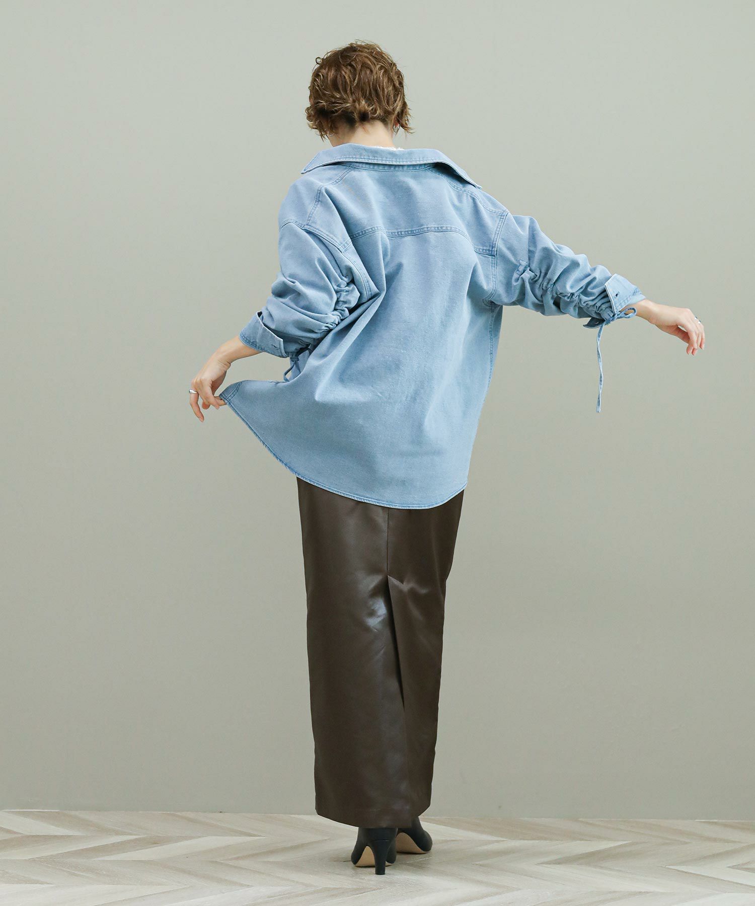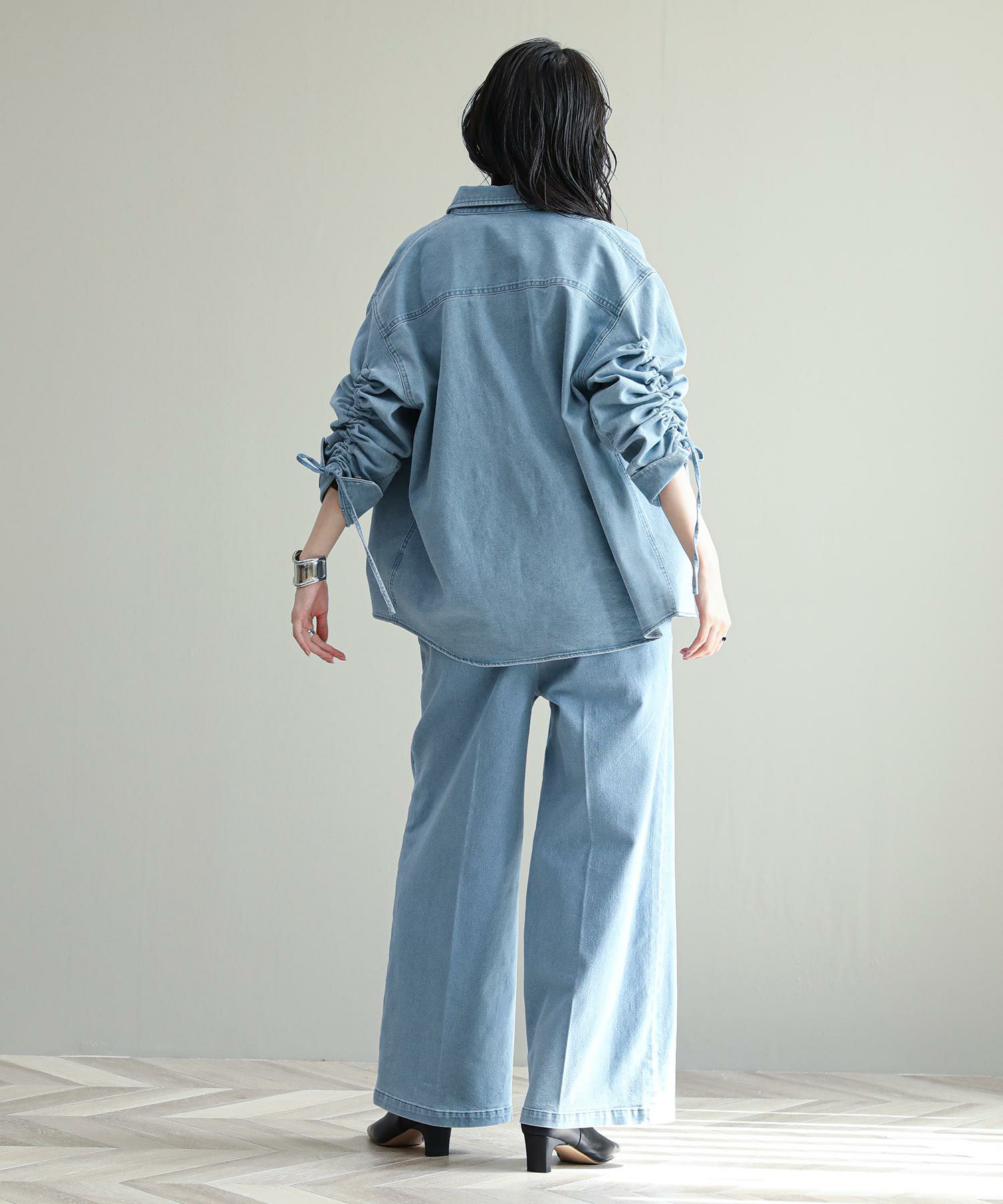 袖のドローコードでシャーリングを作り、袖のフォルムをアレンジできます。程よい肉厚のデニム生地がジャケット代わりにも。デニムはブリーチとボールバイオ加工でヴィンテージライクな風合いに仕上がっています。