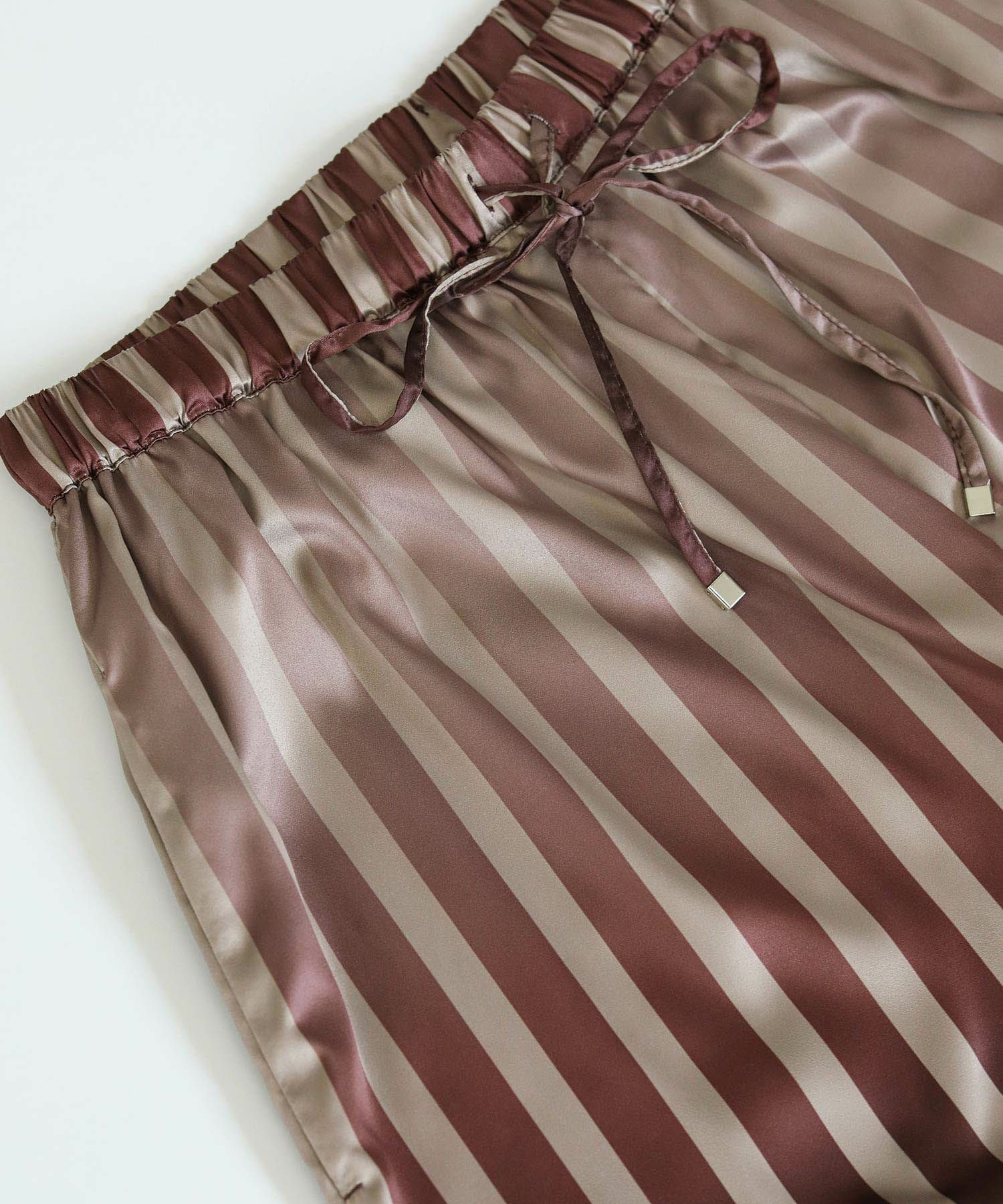 ストライプ柄がすっきりとした縦のラインを強調してくれます。柔らかくしなやかな素材感で脚のラインを自然に拾わないのも嬉しいポイント。上品な光沢感が際立ち女性らしい雰囲気を引き立ててくれます。着心地も良く、華やかなシーンにもデイリーにも使いやすい万能な生地感です。