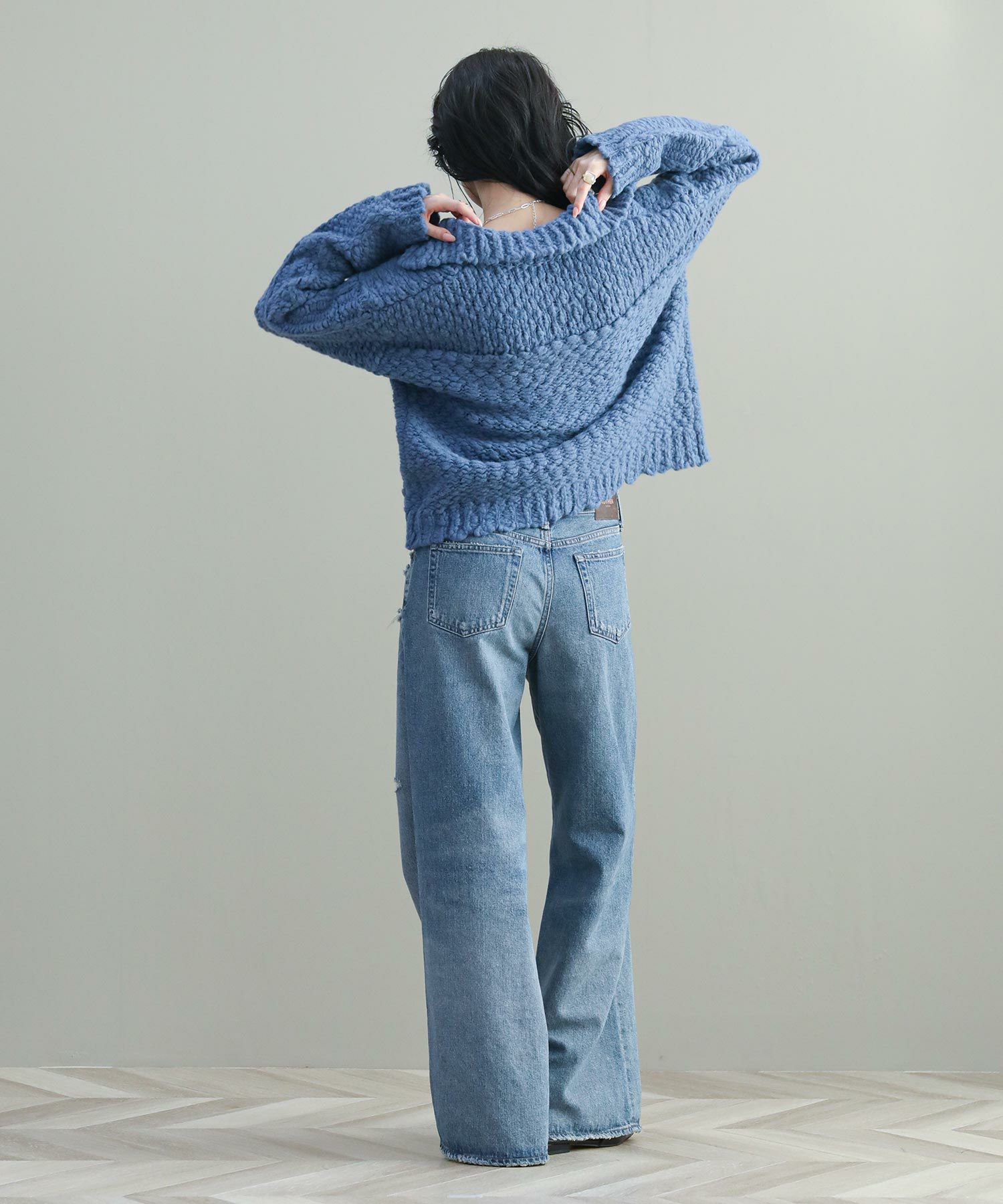 太番手で表情のあるウール混のスラブ糸を使用。スラブ糸の凹凸感と編地の切替がポイントです。程よいサイジングでボトムとバランスが取りやすく、さらっと羽織るだけでサマになります。裾だけ釦を閉じて、衿を抜いてきるとトレンド感もアップ◎
