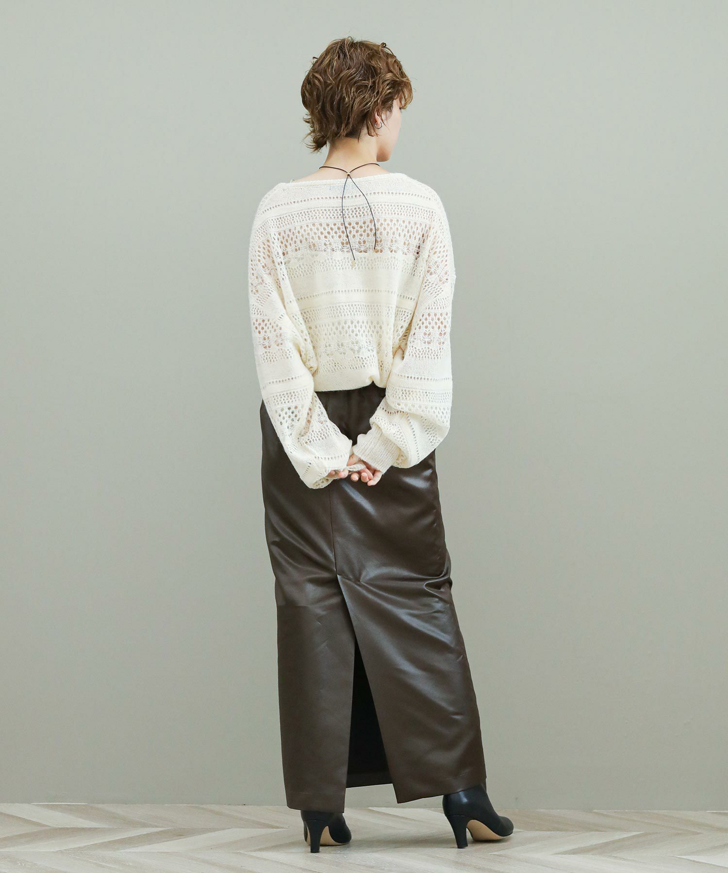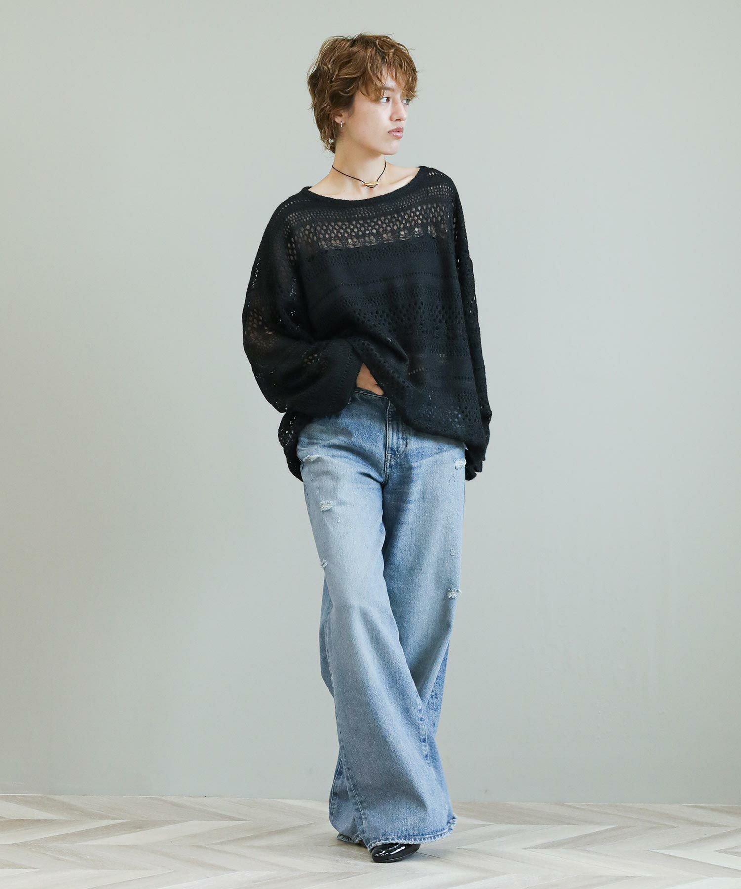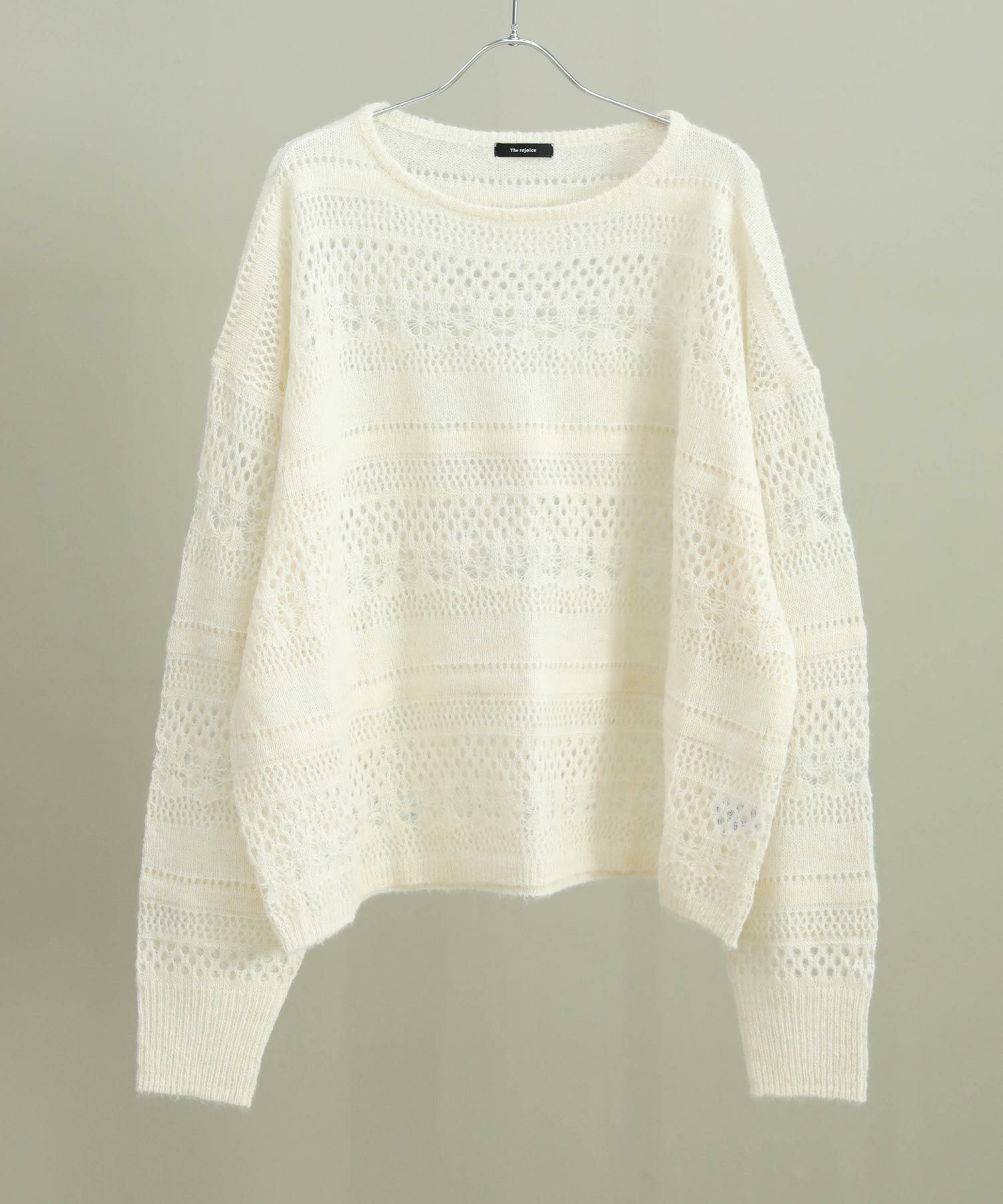 Tシャツやシャツとレイヤードスタイルを楽しめます。繊細なすかし柄が女性らしい雰囲気でデニムスウェットなどカジュアルボトムとも好相性。デコルテをきれいに見せてくれる衿の開きもポイントです。