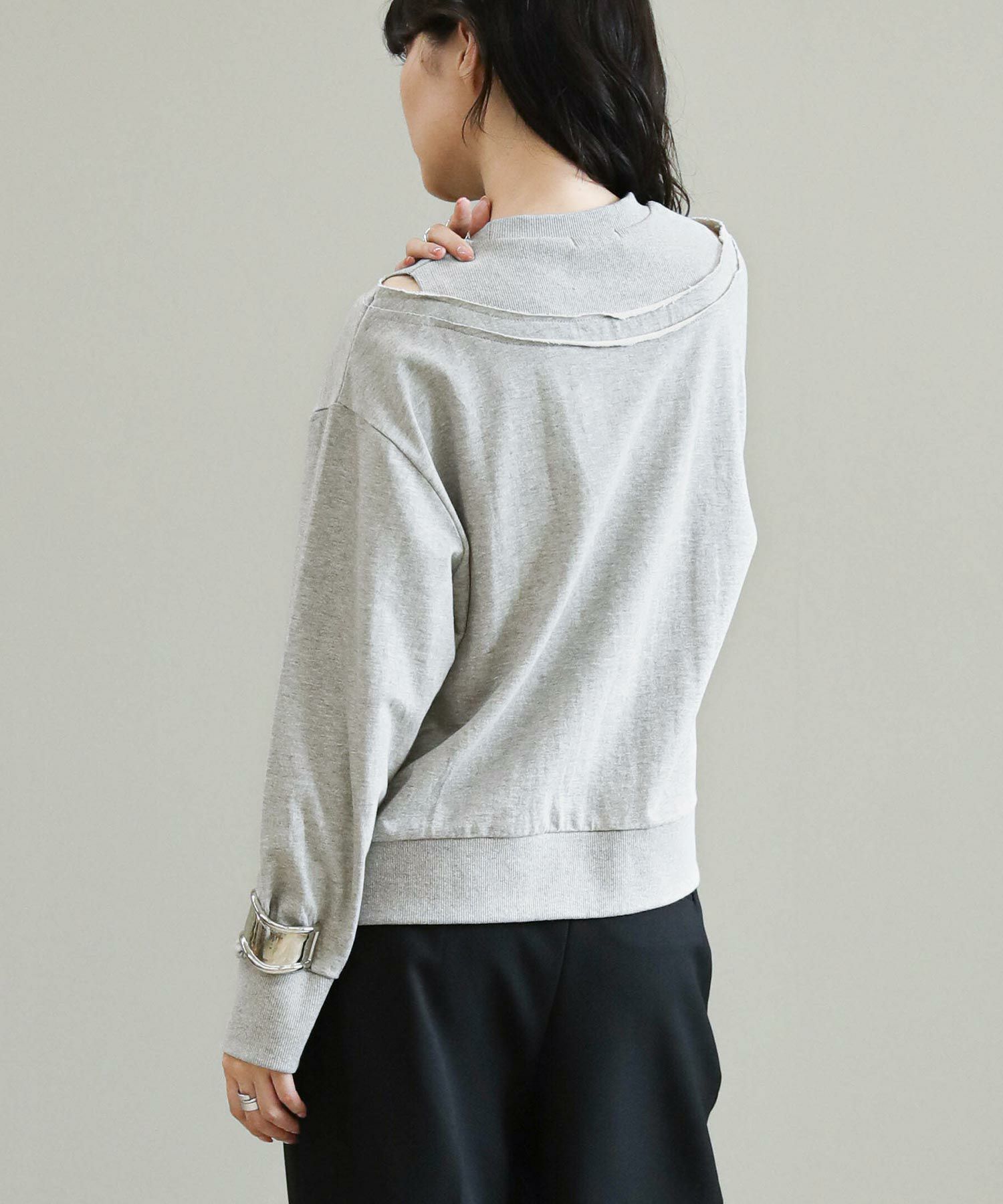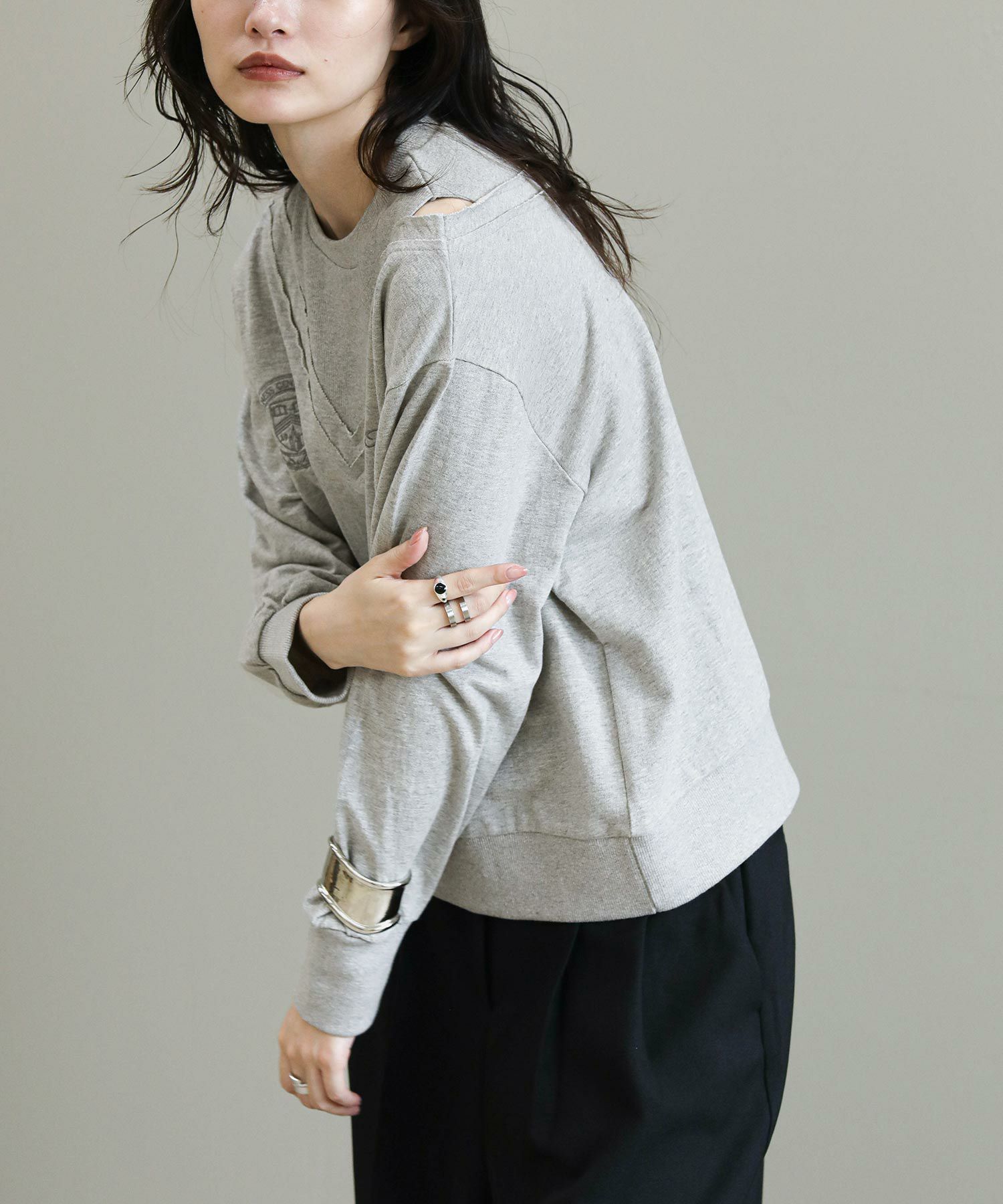 肩部分のさりげない肌見せがポイント。刺繍のエンブレムとロゴがカジュアルすぎず大人ぽい雰囲気に。ベーシックなボトムと合わせてもスタイルが決まるデザイントップスです。