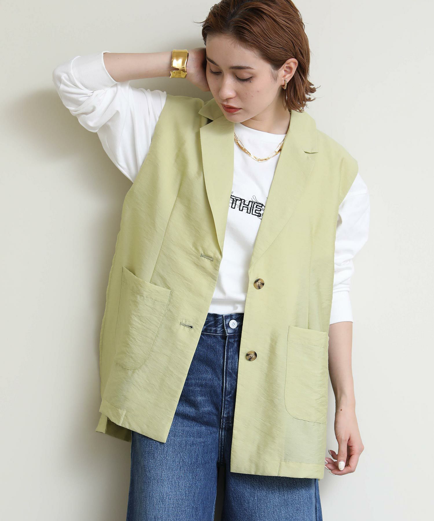 シンプルなインナーやカットソーの上から合わせるだけでワンランク上のスタイリングが完成します。