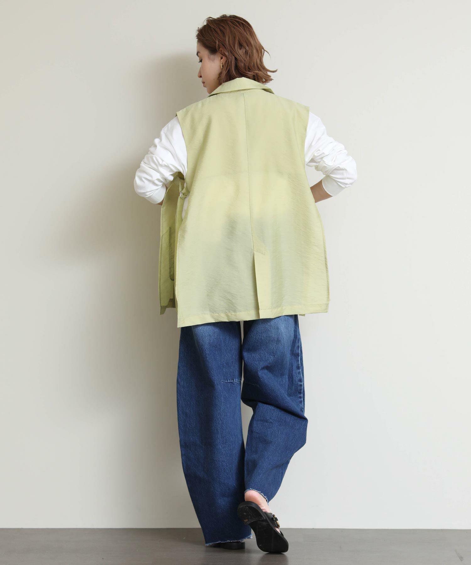両サイドのバックルがポイントのジレ。
