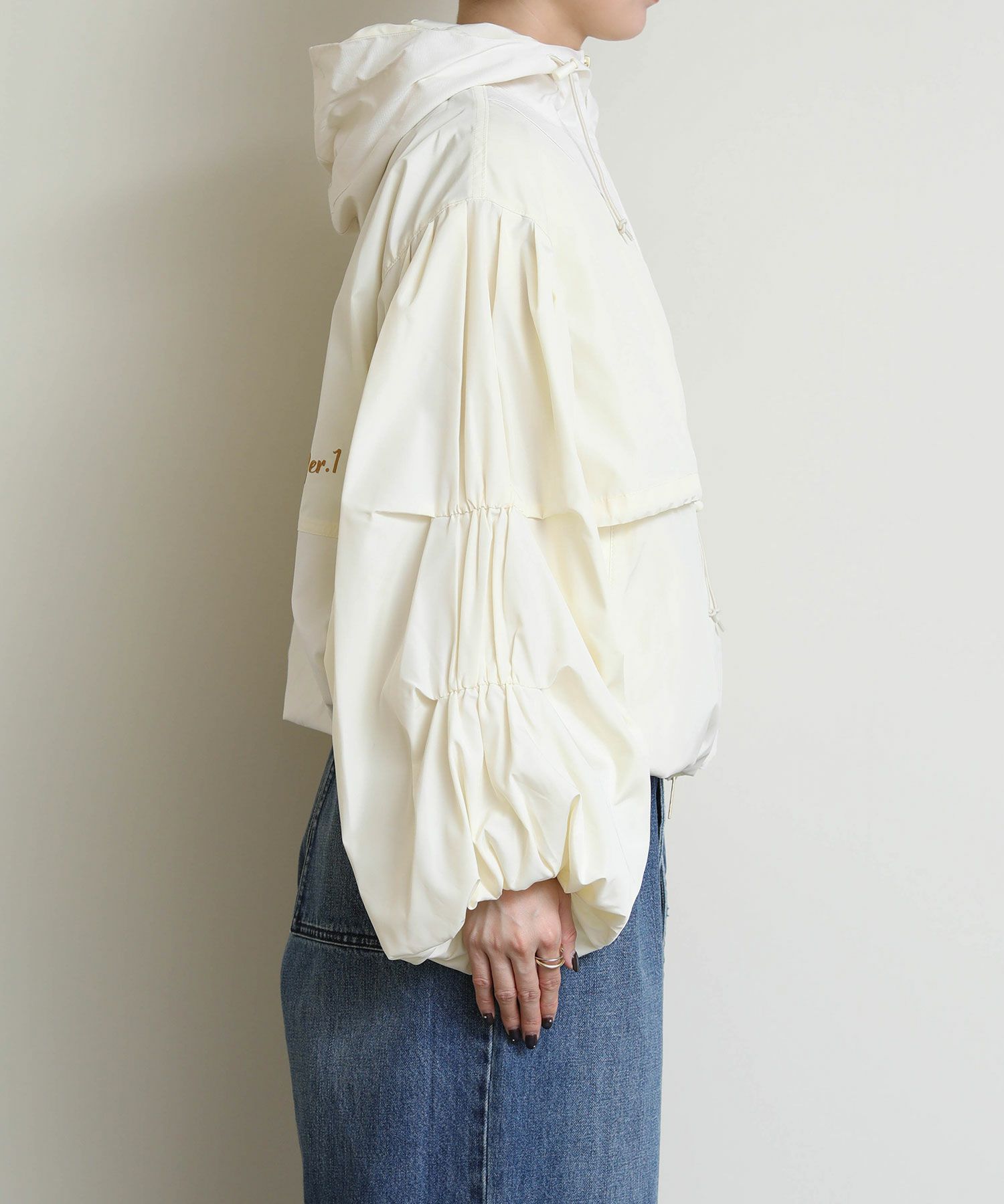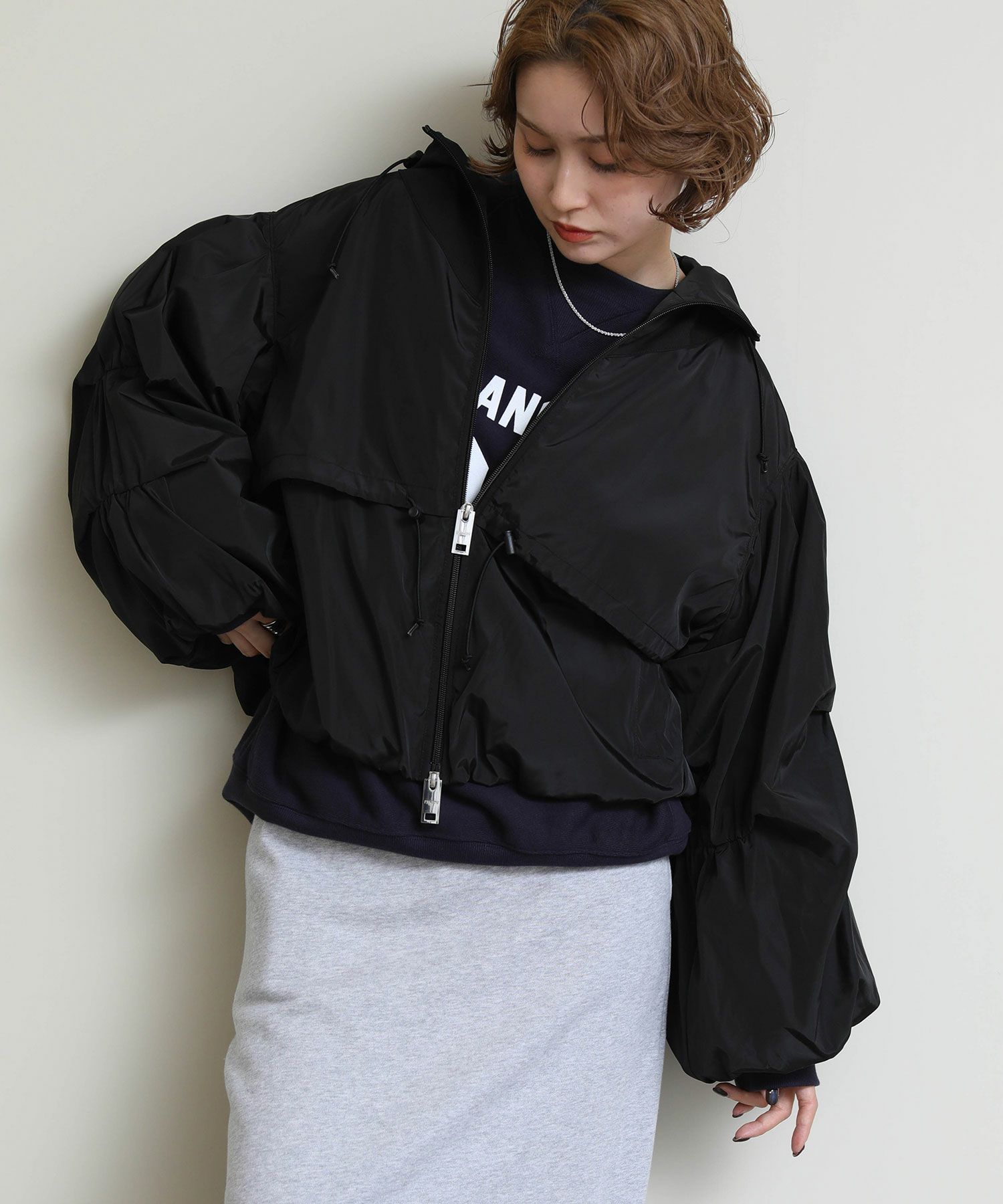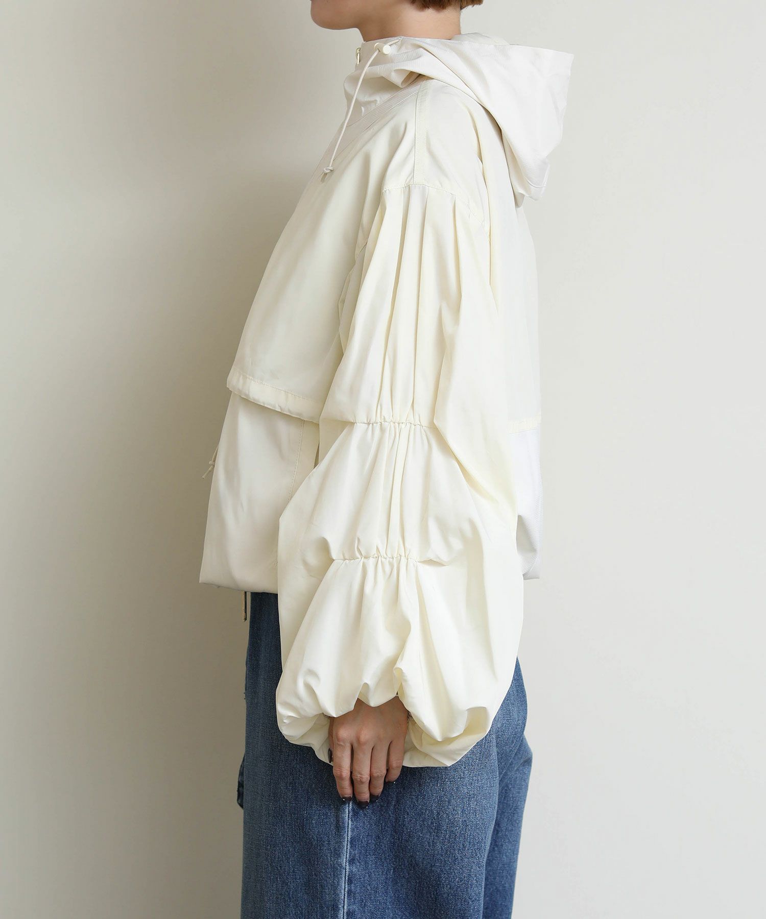 さらりとした軽やかな生地感で、春や秋の羽織りにちょうど良い一枚です。 胸下位置に配したドローストリングを絞ることで、ふんわりとしたボリューム感からコンパクトなシルエットまで自在にアレンジ可能。 裾に向かってゆるやかに広がるバルーンラインが立体的なフォルムを生み出し、軽く羽織るだけでスタイリングに動きをプラスします。 ワンピースやスカートと合わせて女性らしく、パンツスタイルでモードにまとめても◎季節の変わり目に活躍する、存在感のあるライトアウターです。