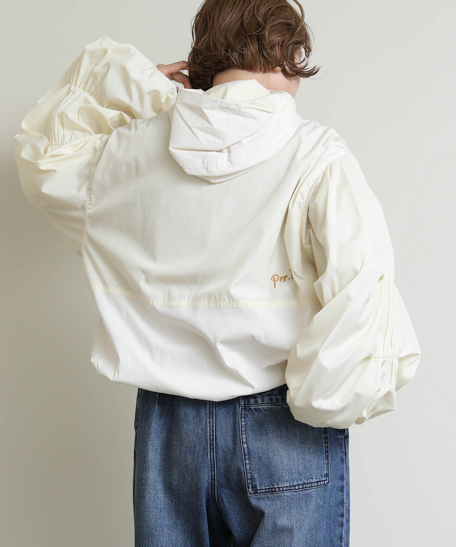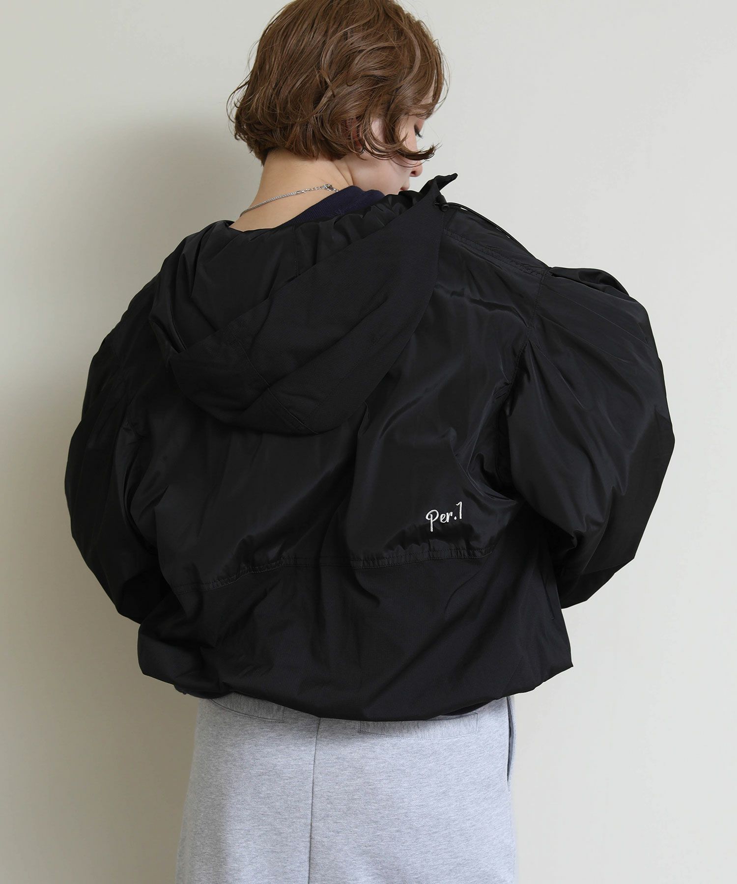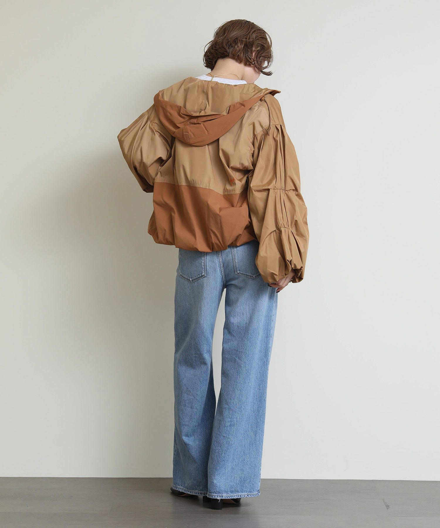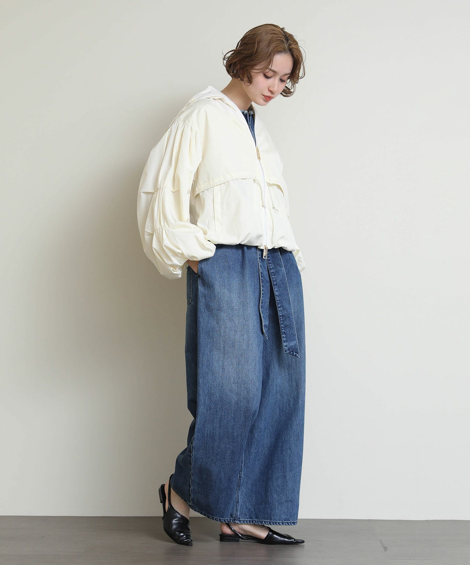 さらりとした軽やかな生地感で、春や秋の羽織りにちょうど良い一枚です。 胸下位置に配したドローストリングを絞ることで、ふんわりとしたボリューム感からコンパクトなシルエットまで自在にアレンジ可能。 裾に向かってゆるやかに広がるバルーンラインが立体的なフォルムを生み出し、軽く羽織るだけでスタイリングに動きをプラスします。 ワンピースやスカートと合わせて女性らしく、パンツスタイルでモードにまとめても◎季節の変わり目に活躍する、存在感のあるライトアウターです。