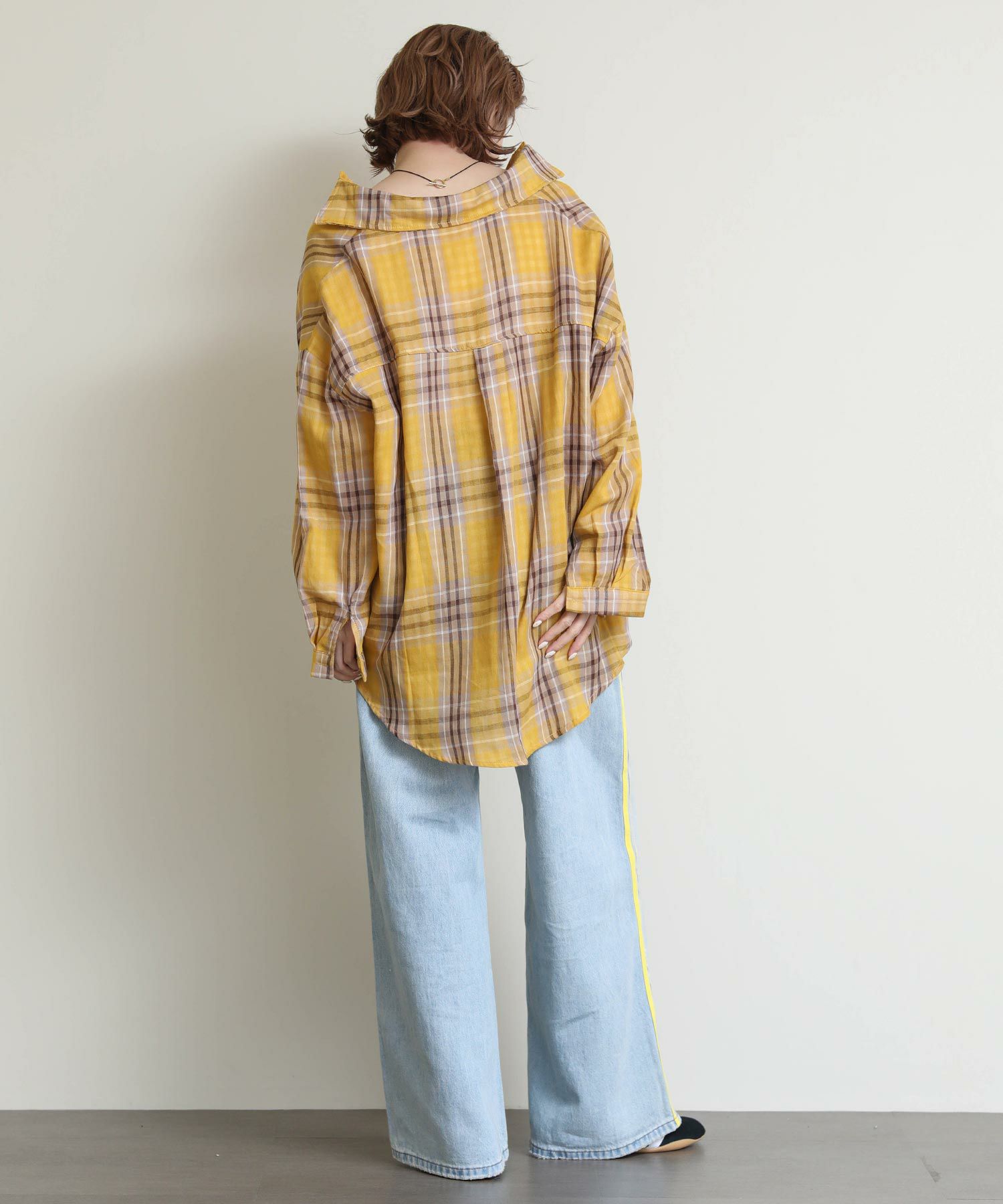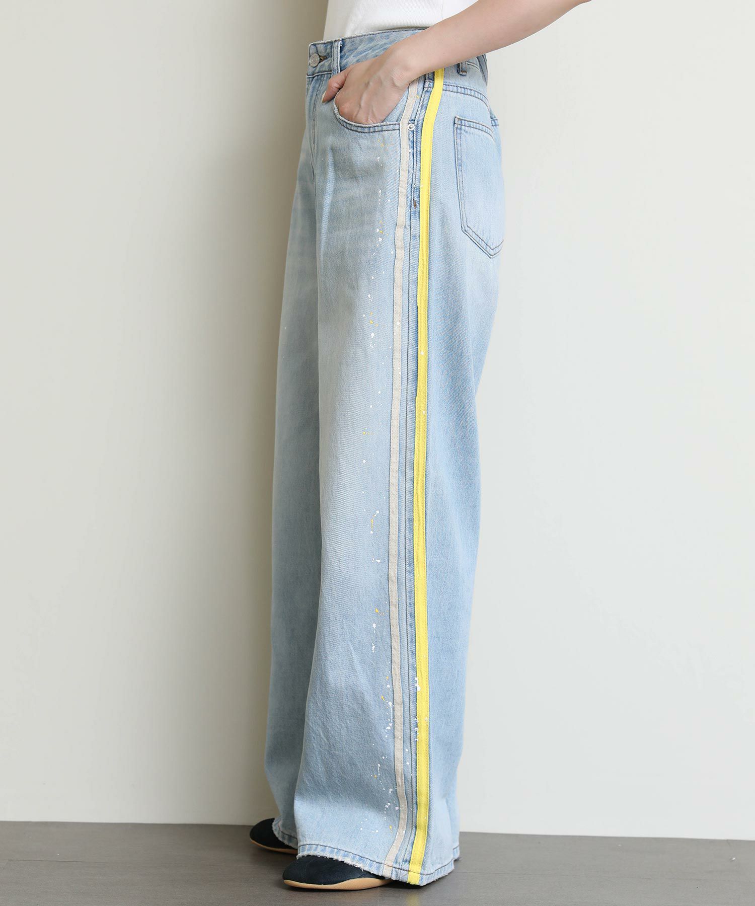 ルーズなシルエットとサイドに入ったイエローのラインがポイントのデニム。