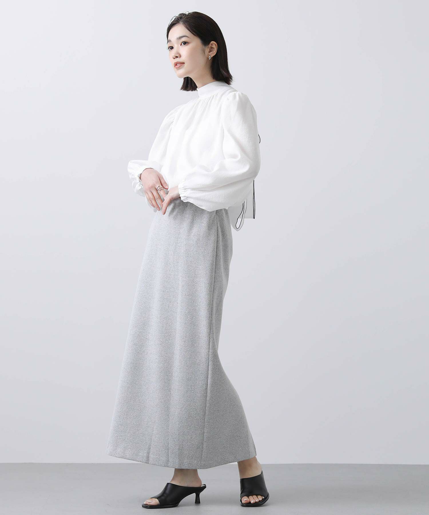 肩幅をコンパクトにデザインし、ギャザ-でたっぷりと分量をだしたパフスリーブがフェミニンさをプラスし大人かわいい装いに。
