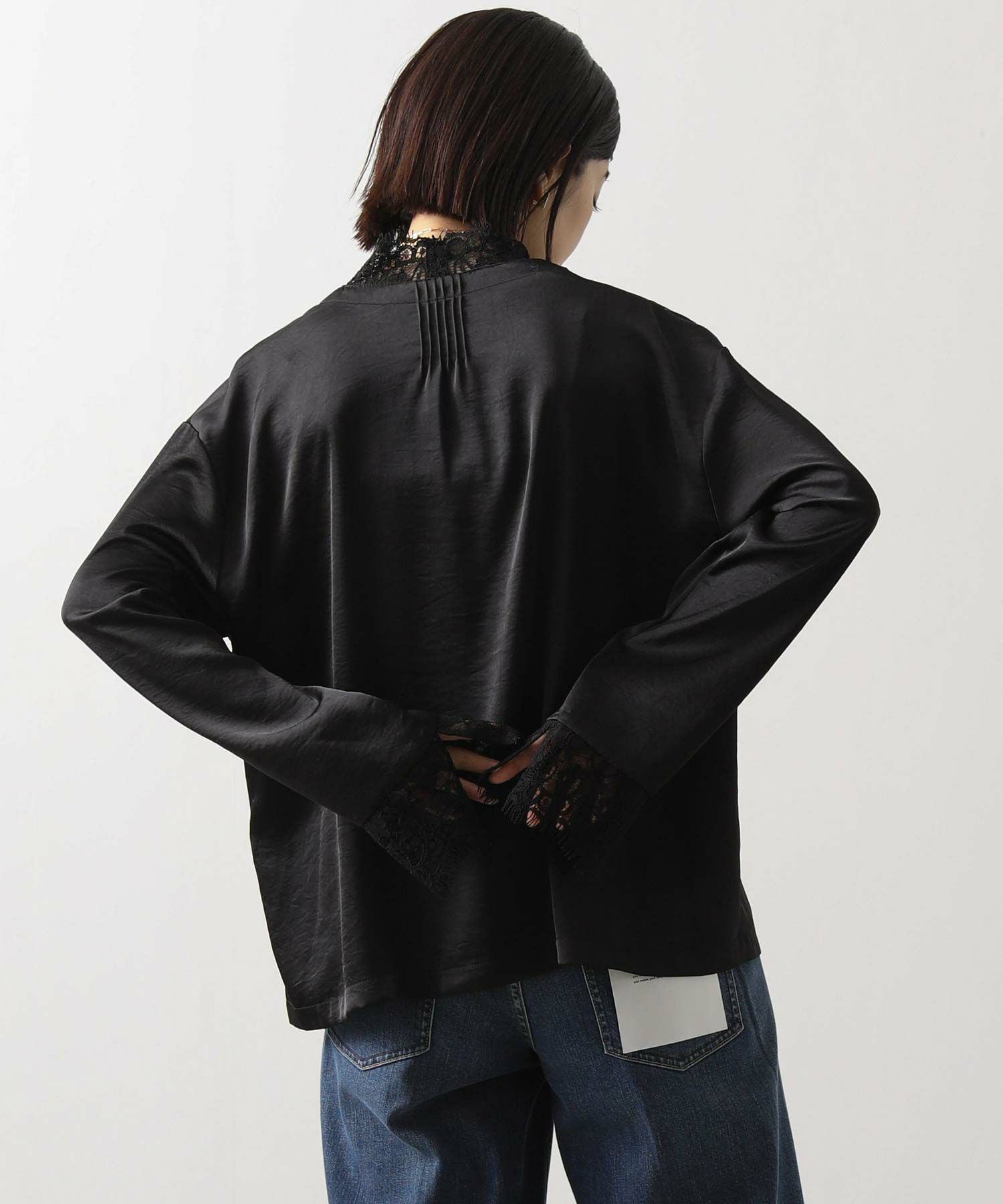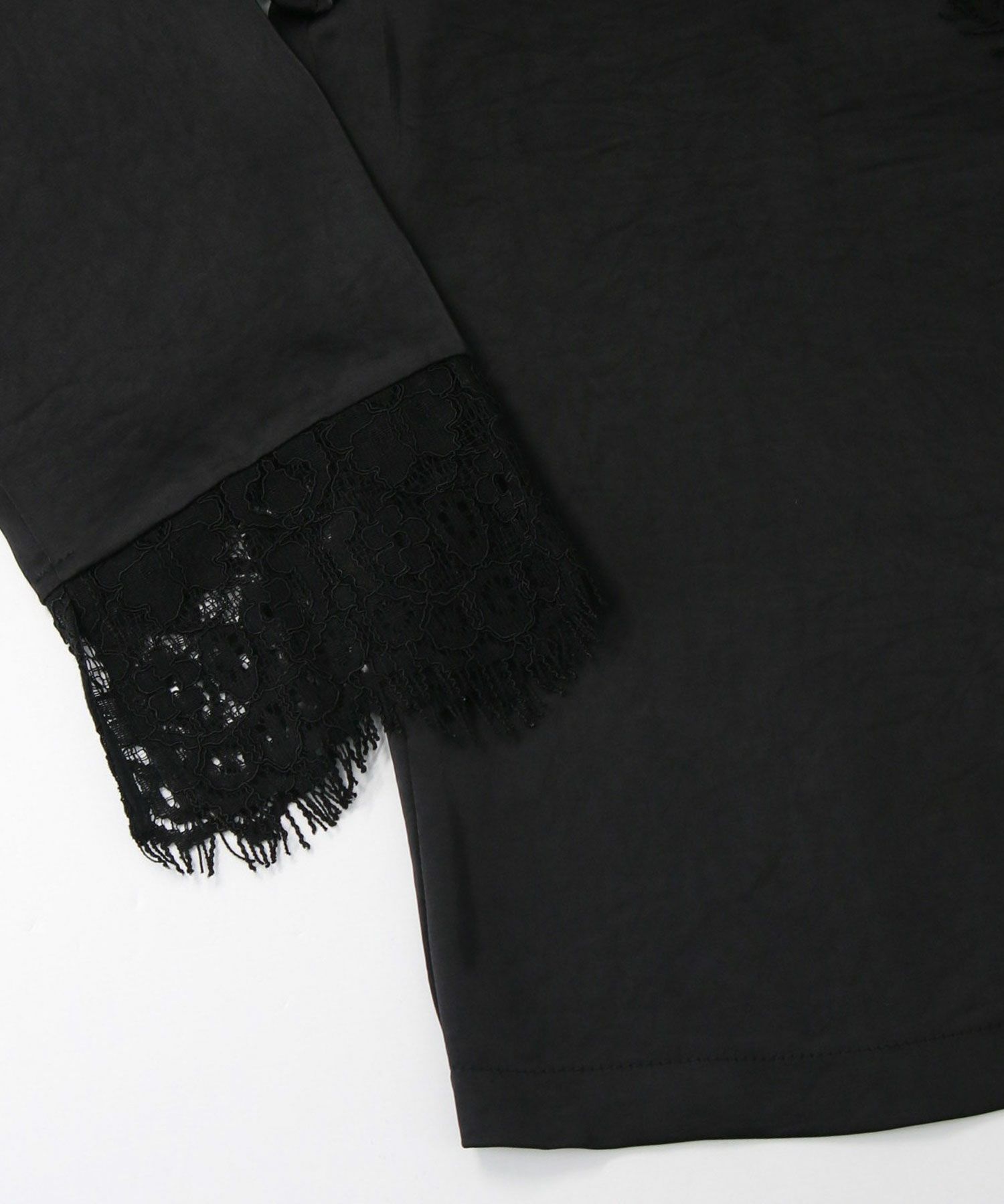 シルクのようななめらかな手ざわりと、自然な落ち感が大人っぽいレース使いブラウス。