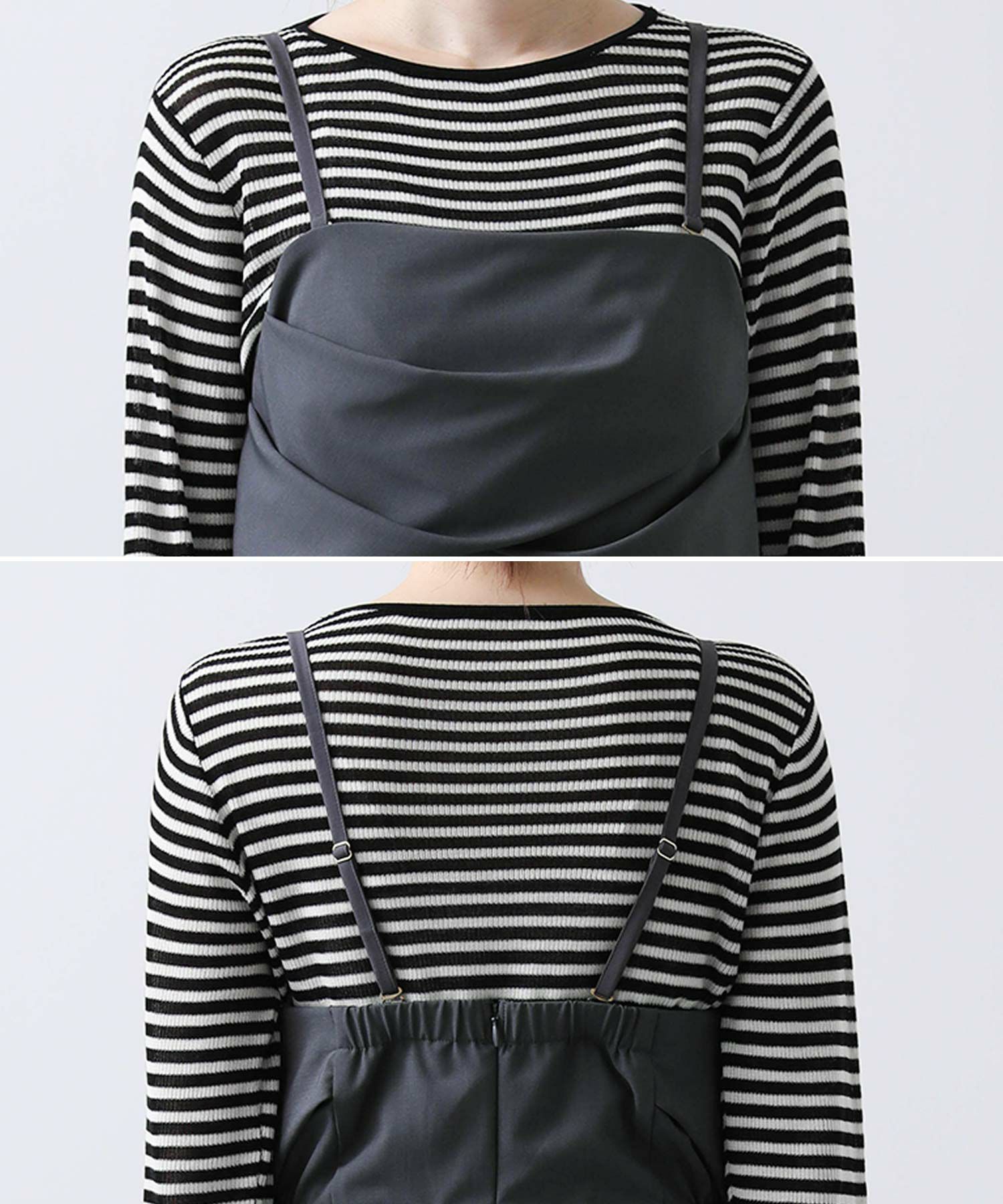 肩ヒモだけ外してベアトップで着ることも可能。着回しの幅も広がります。