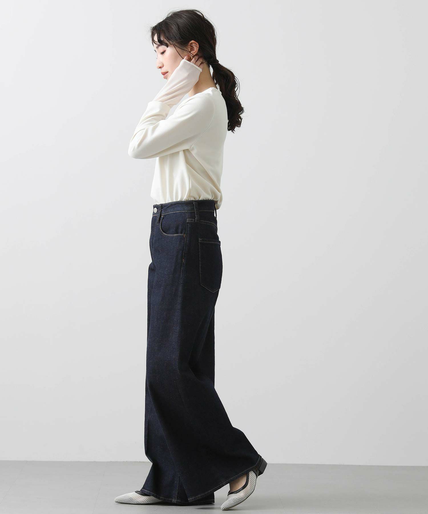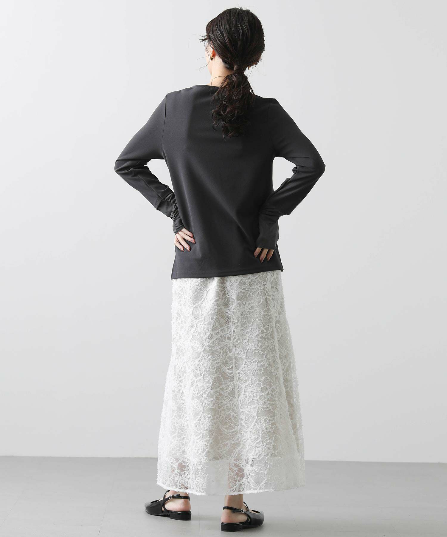 肌寒い季節のレイヤードアイテムとして、季節が進めば1枚着としてもお使い頂けます。程よい厚みのカットジョーゼット素材なので身体のラインを拾いにくく、肌離れも良いのが特徴です。