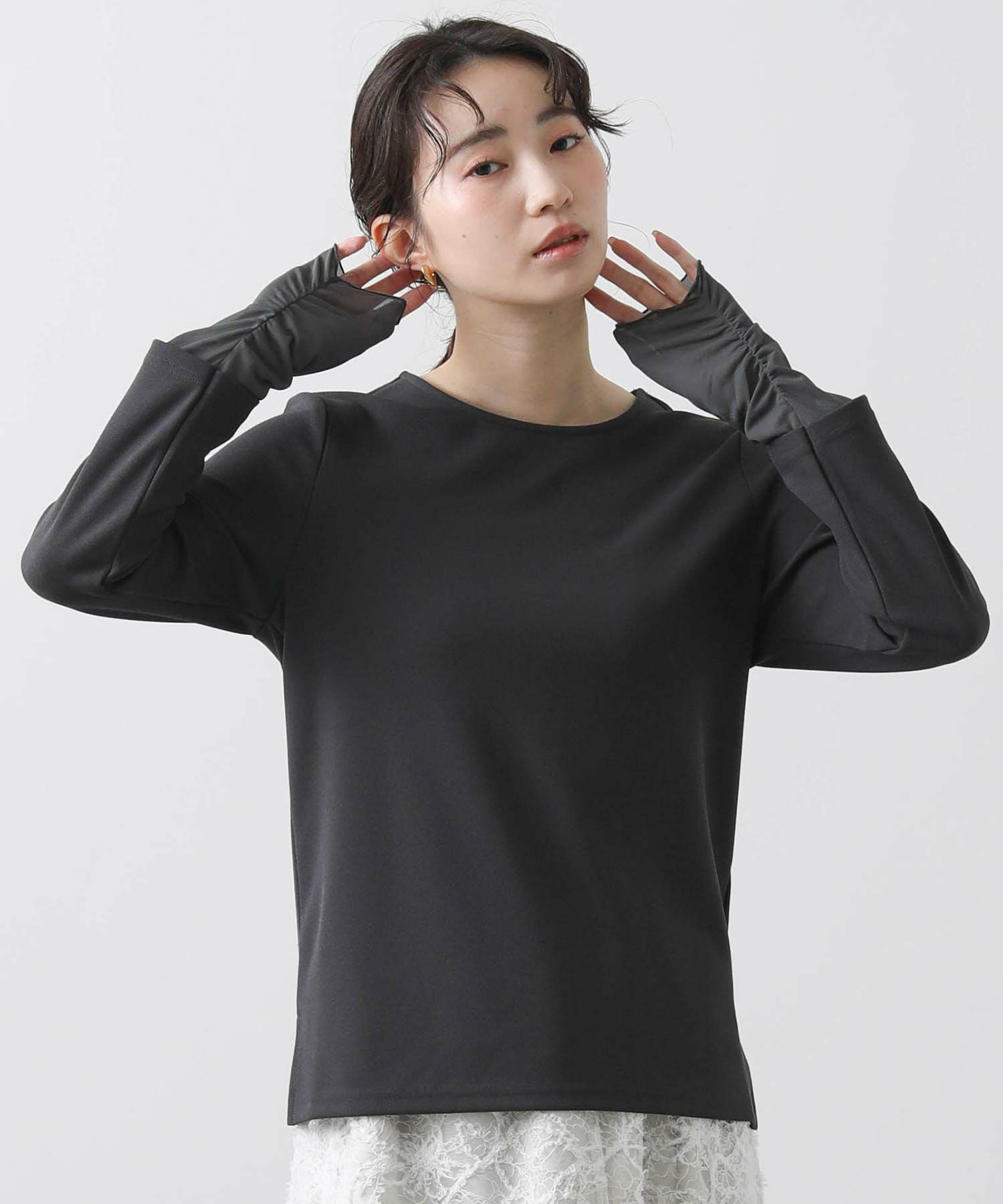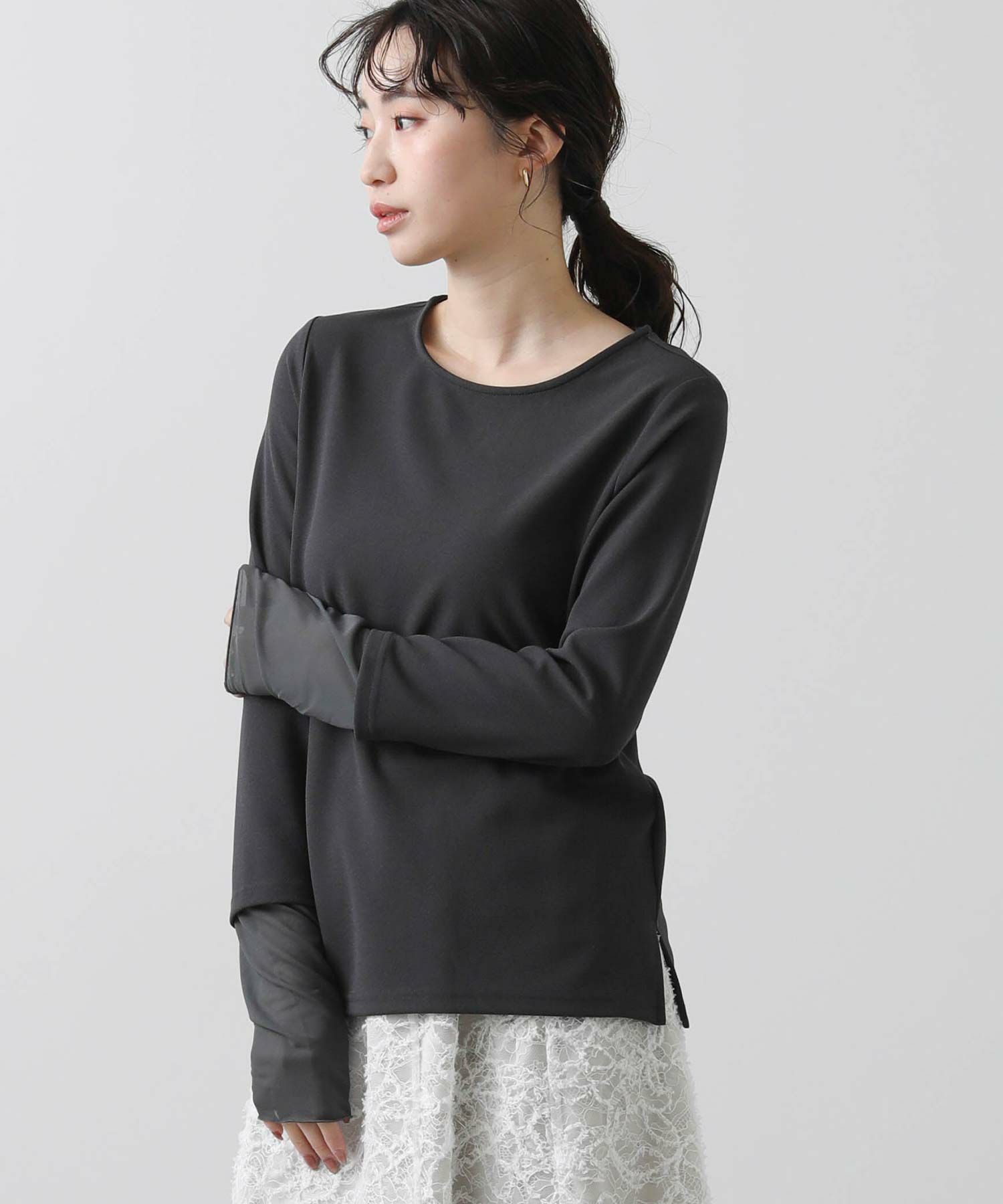 ジョーゼットの軽い素材感でロングシーズン着られる1枚。袖口をシアー素材で切り替えたデザインがポイントです。
