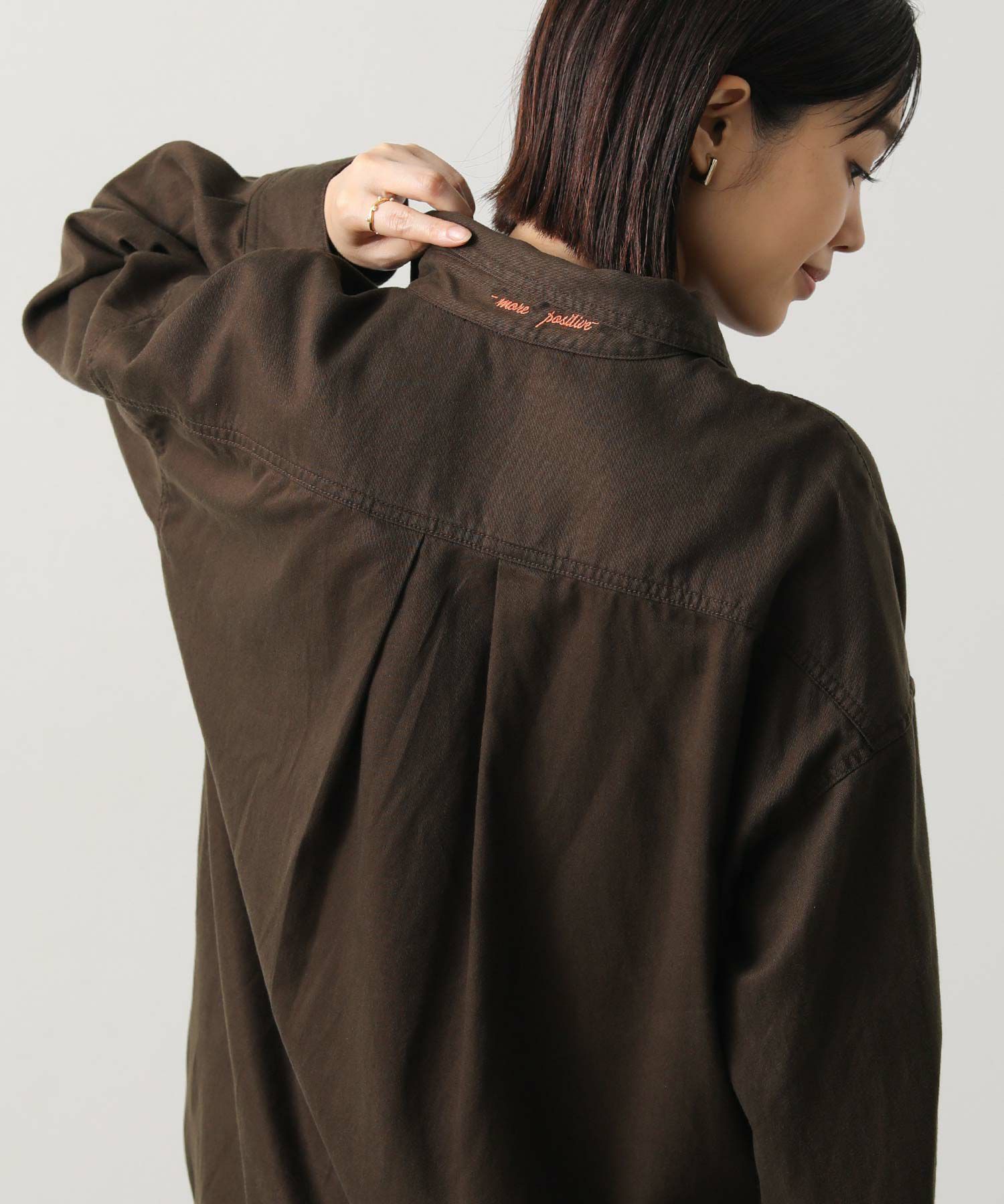台衿に刺繍ロゴをポイントで入れているので、ラフに襟を立てて刺繍を見せる着こなしがオススメ。