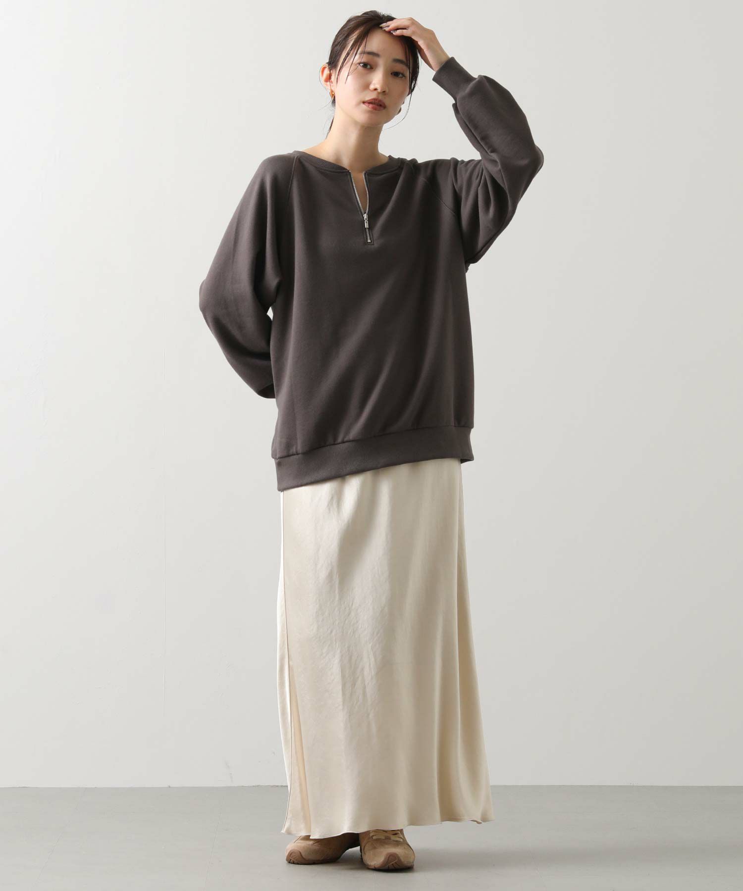 ZIPを少し開け、首を抜かせてデコルテを覗かせる着こなしも女性らしくてオススメ。