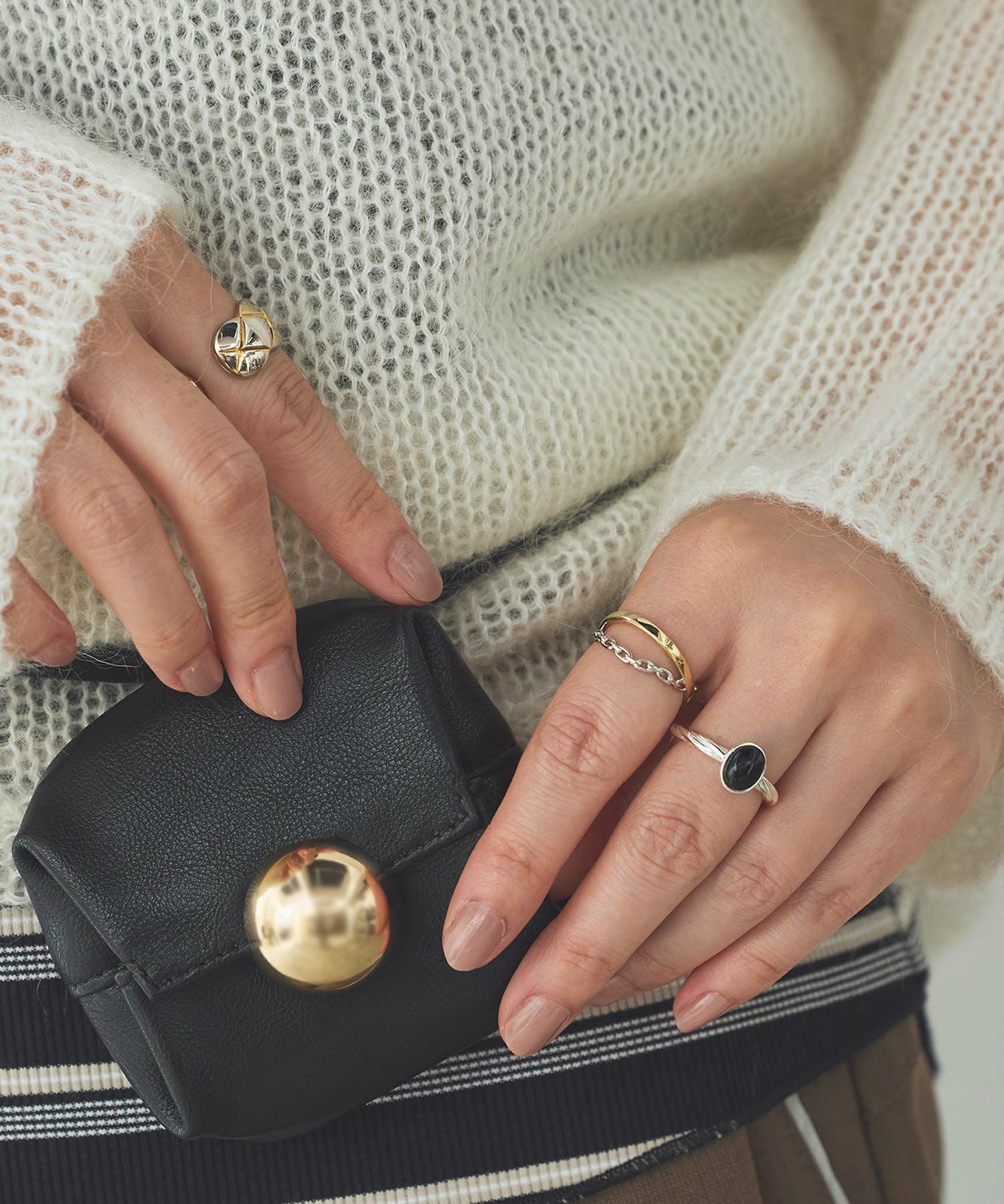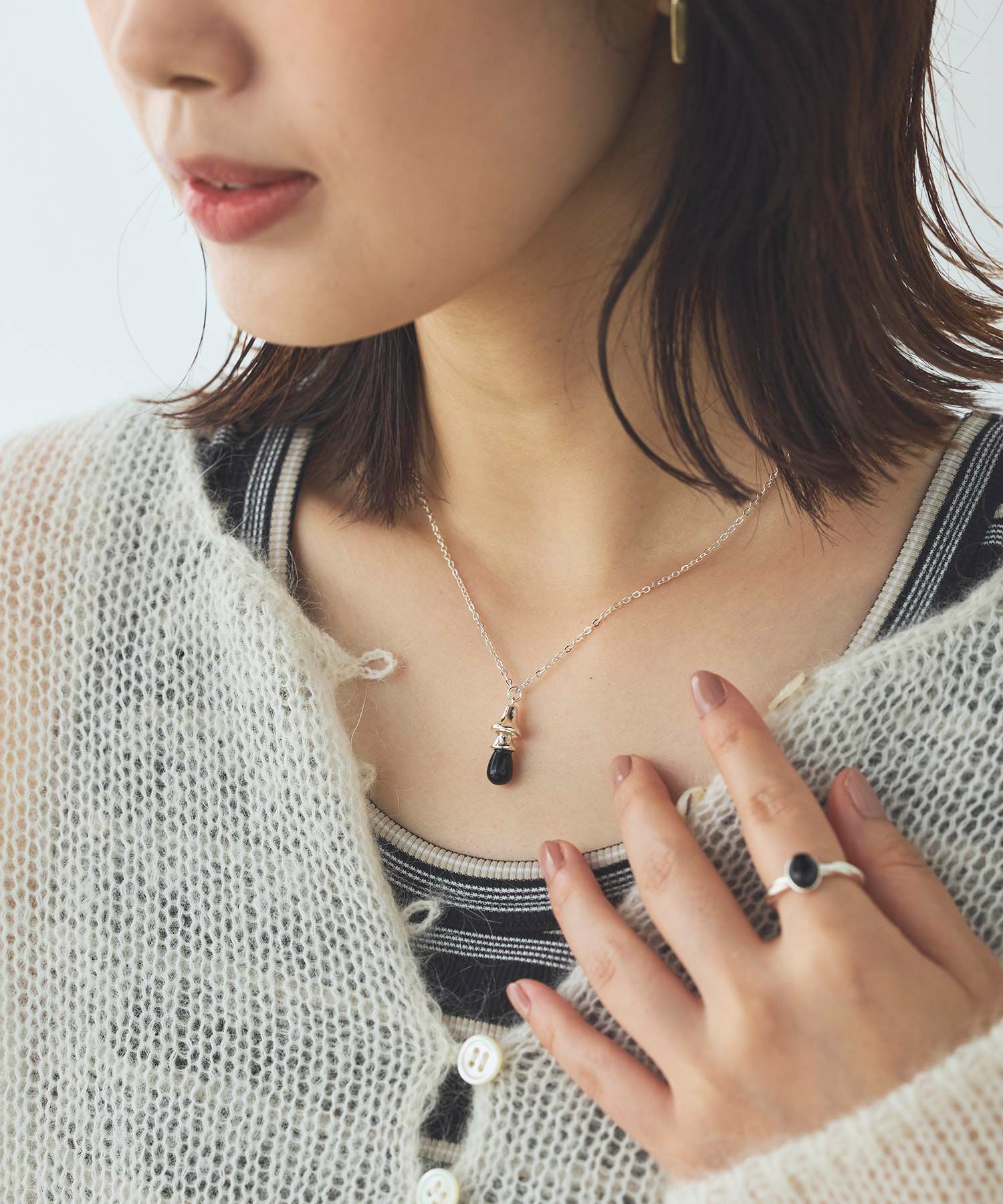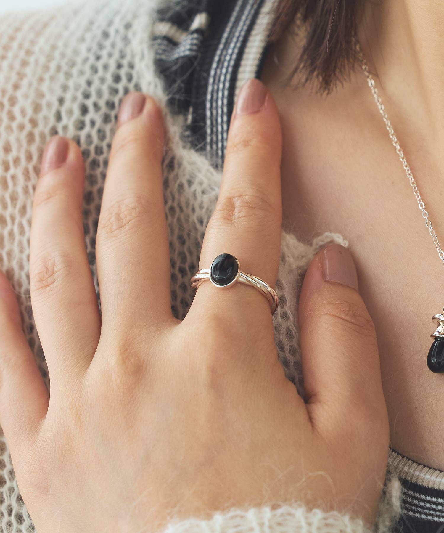 リング部分がねじれたデザインで主張しすぎないオニキスが手元のポイントに。