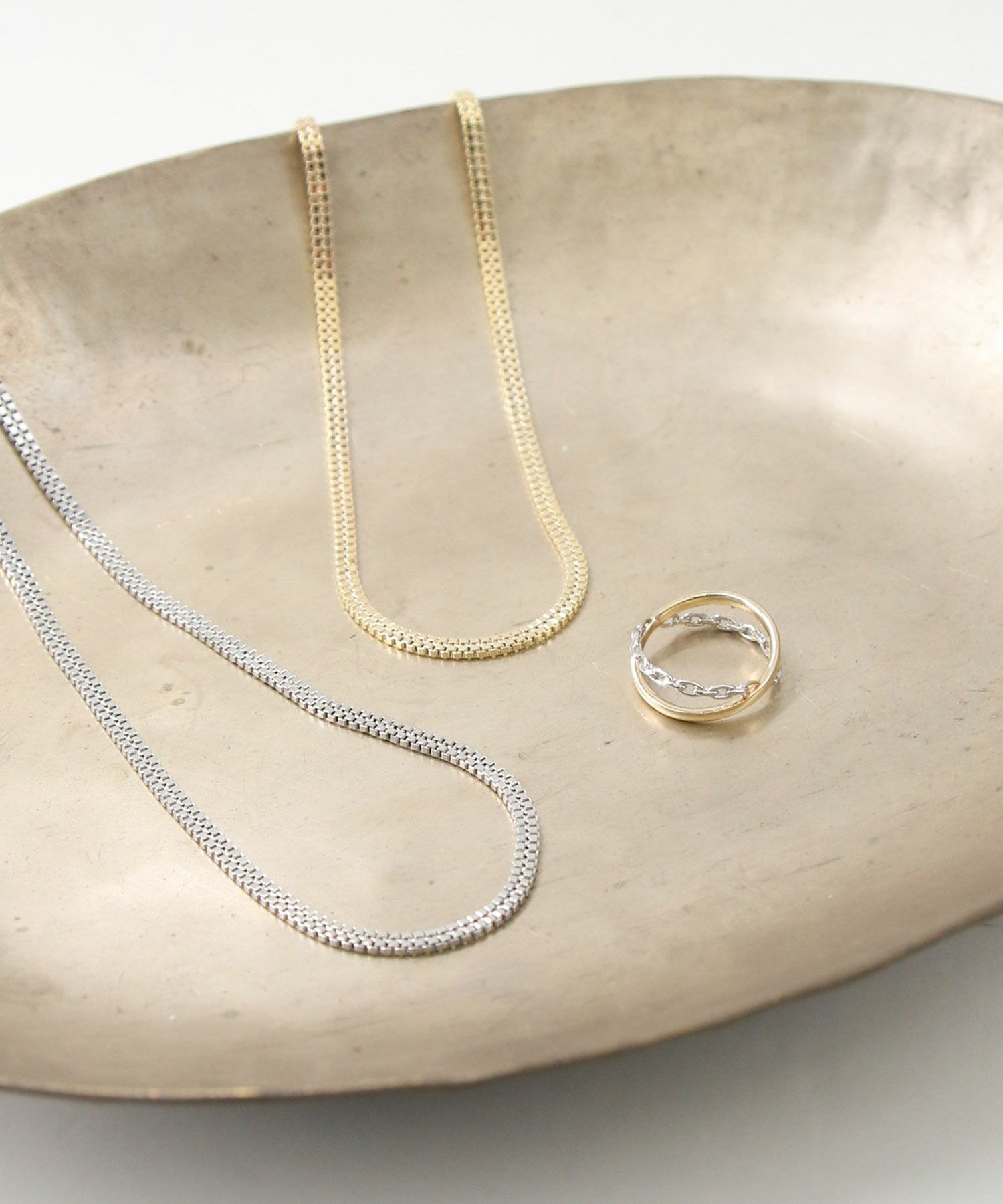 ゴールドのリングとシルバーのチェーンがクロスしたお洒落なリング。