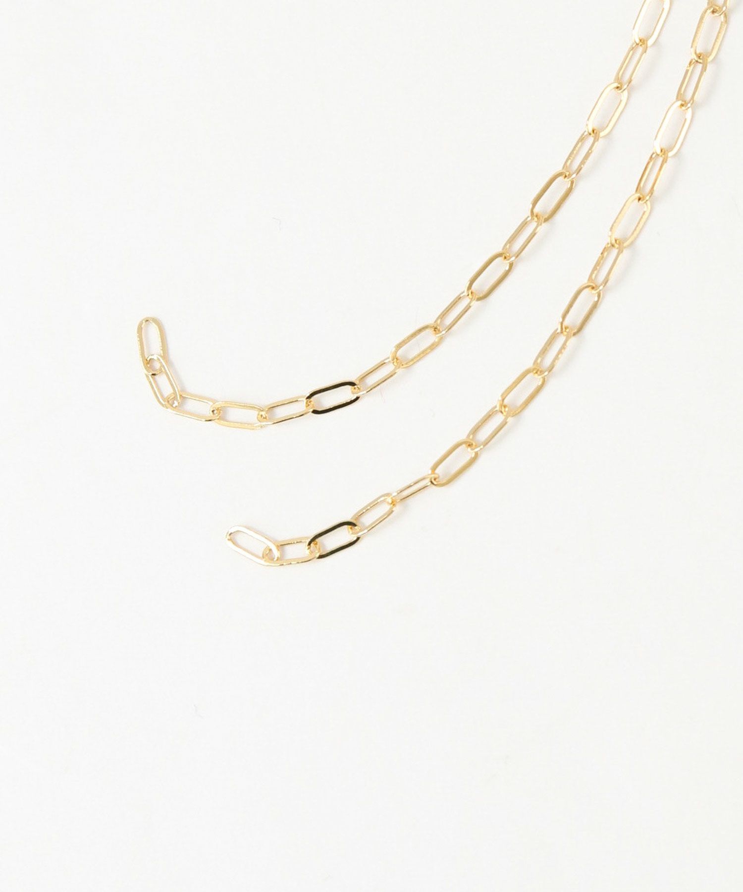 付けたときにチェーンが内側と外側から出る仕様、シンプルなデザインながら存在感のあるアイテム。