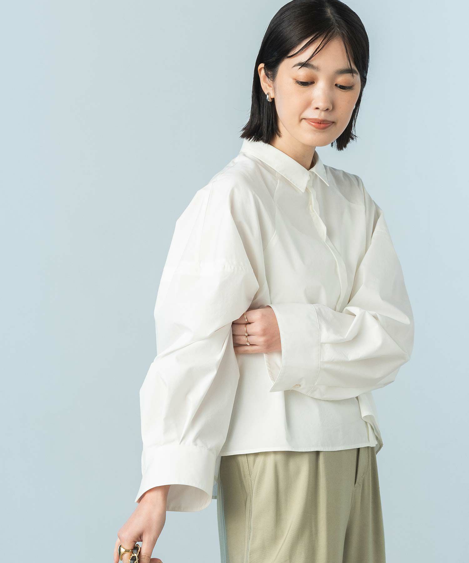 今年らしいクロップド丈のシャツ。
