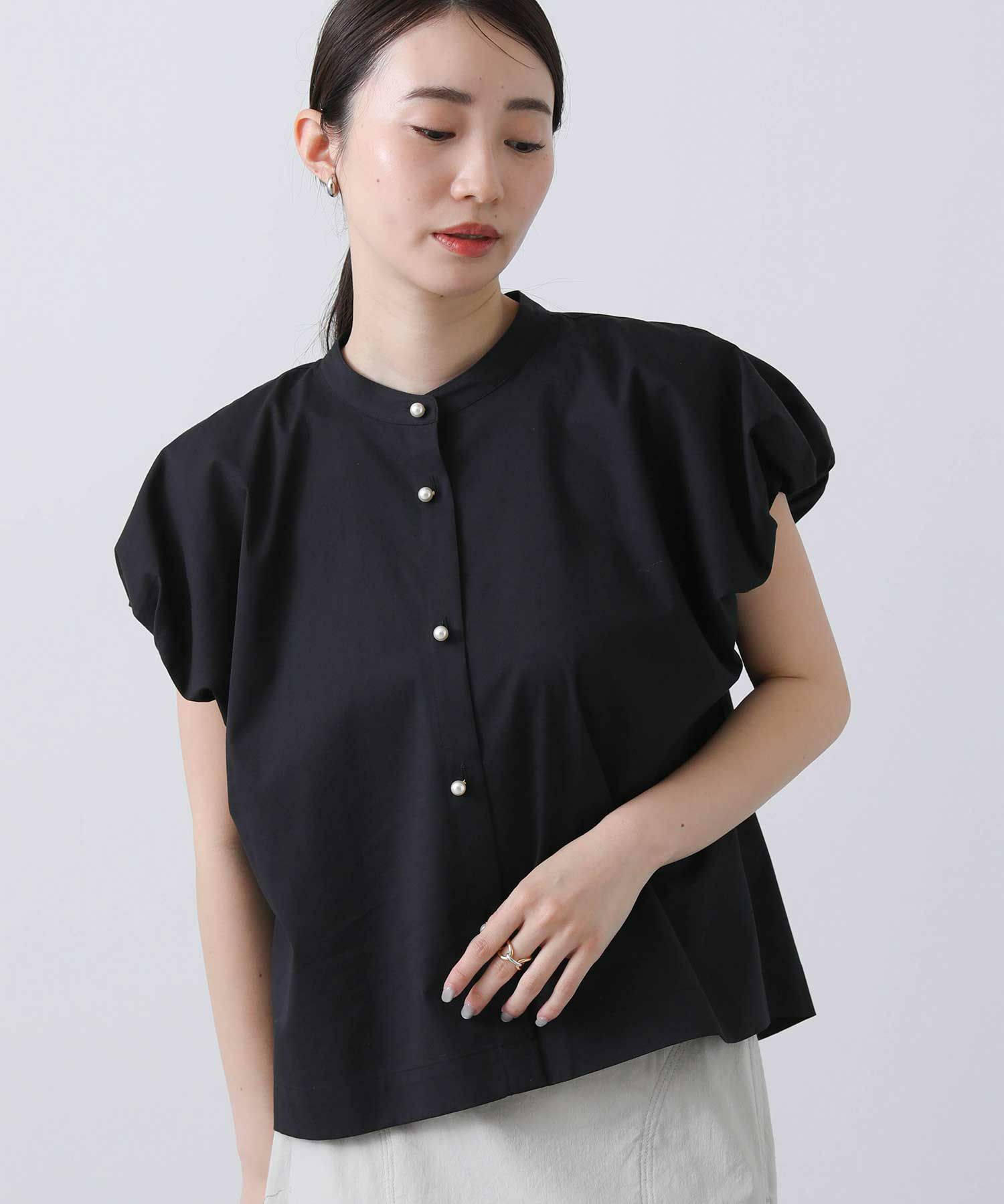 パールボタンが着こなしのアクセント。