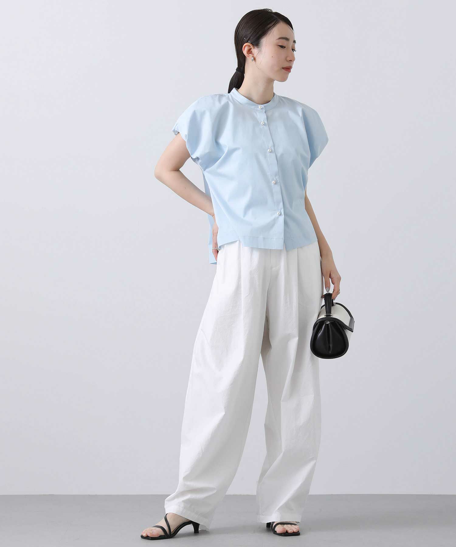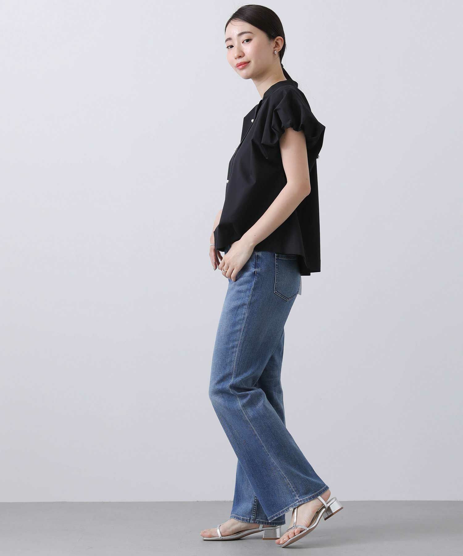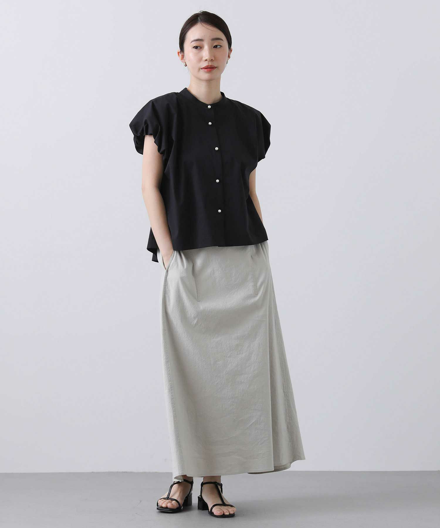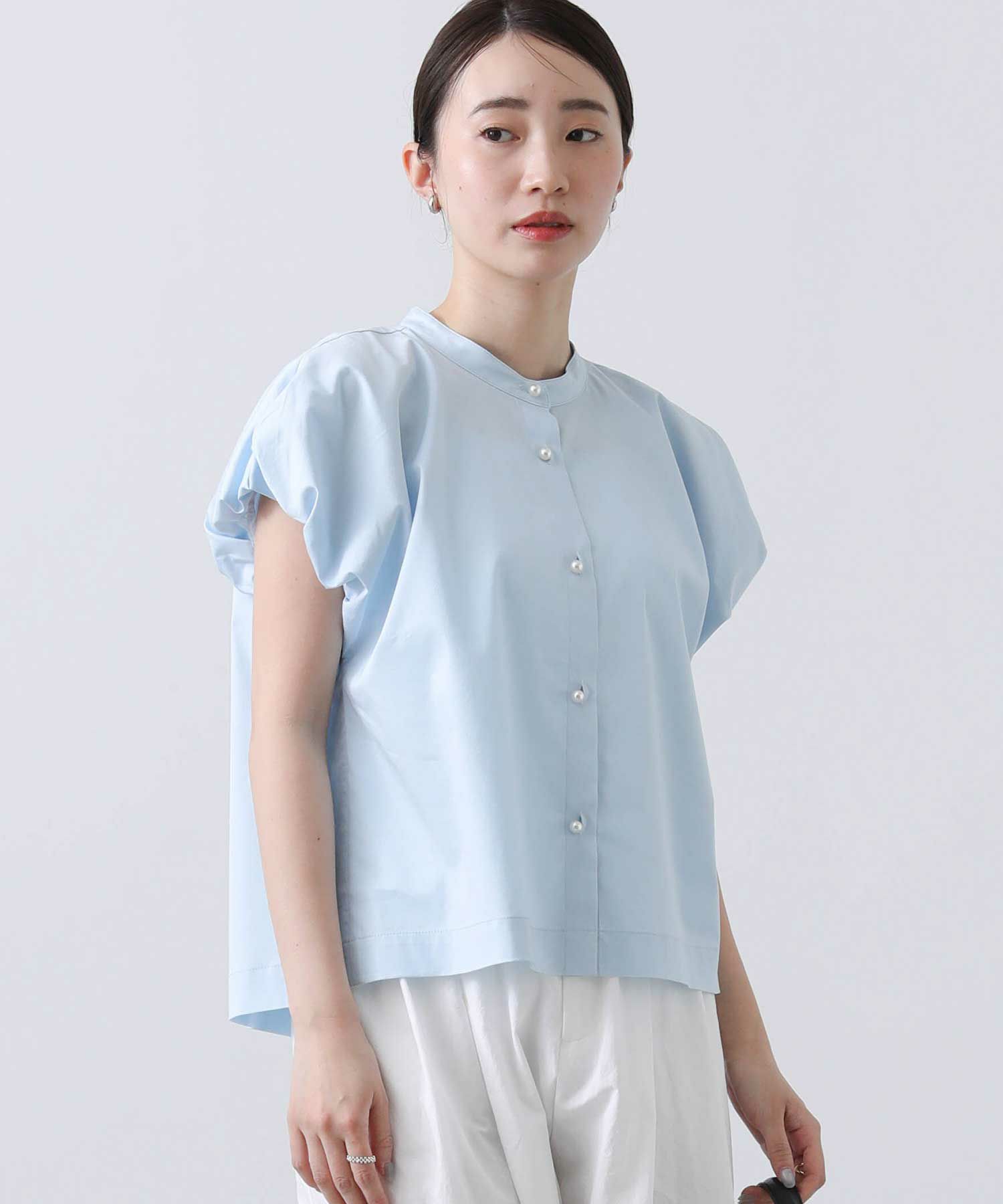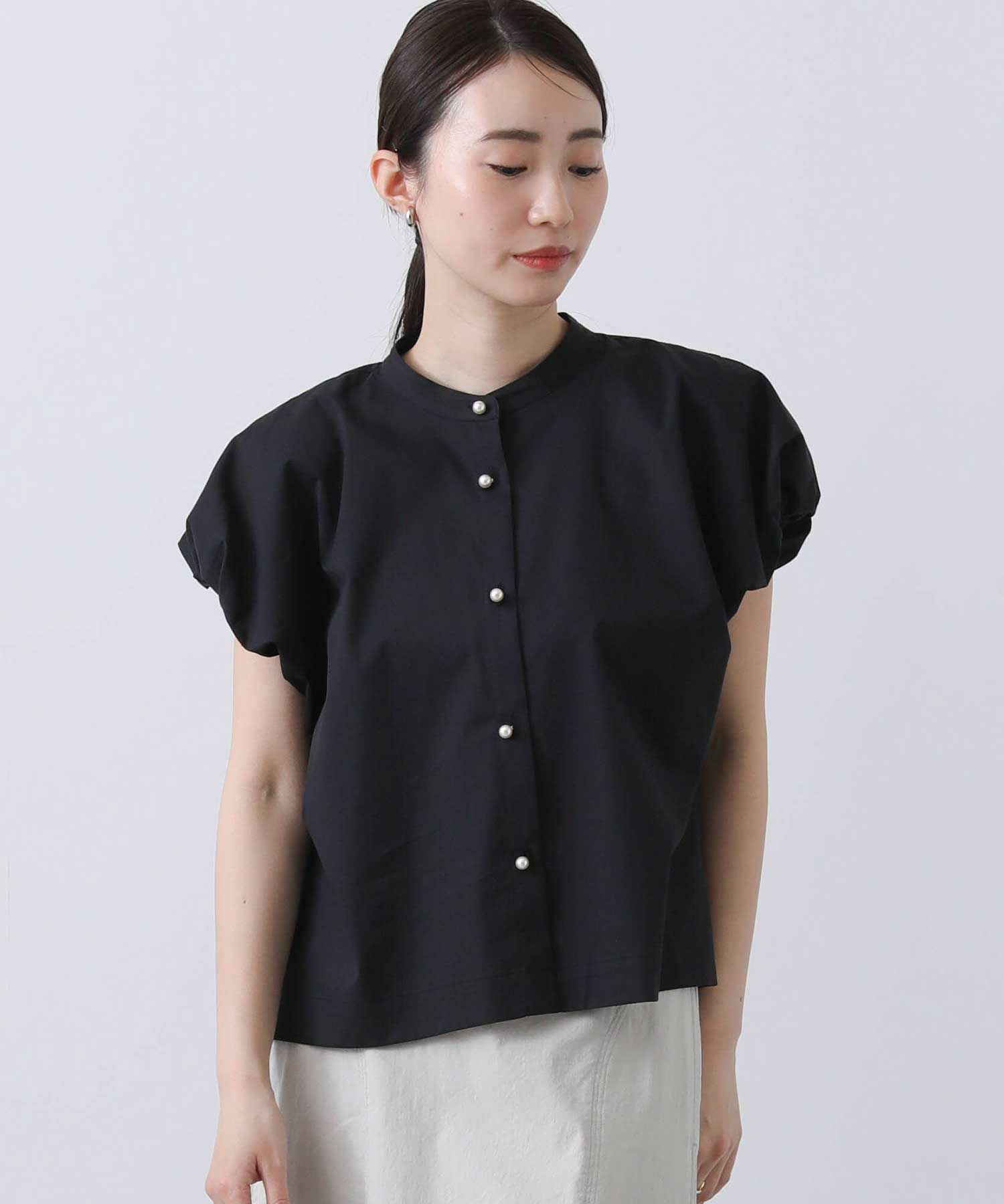 スタンドカラーで首周りをすっきりさせ、バルーン袖の甘さを抑えたデザインが魅力の一着。