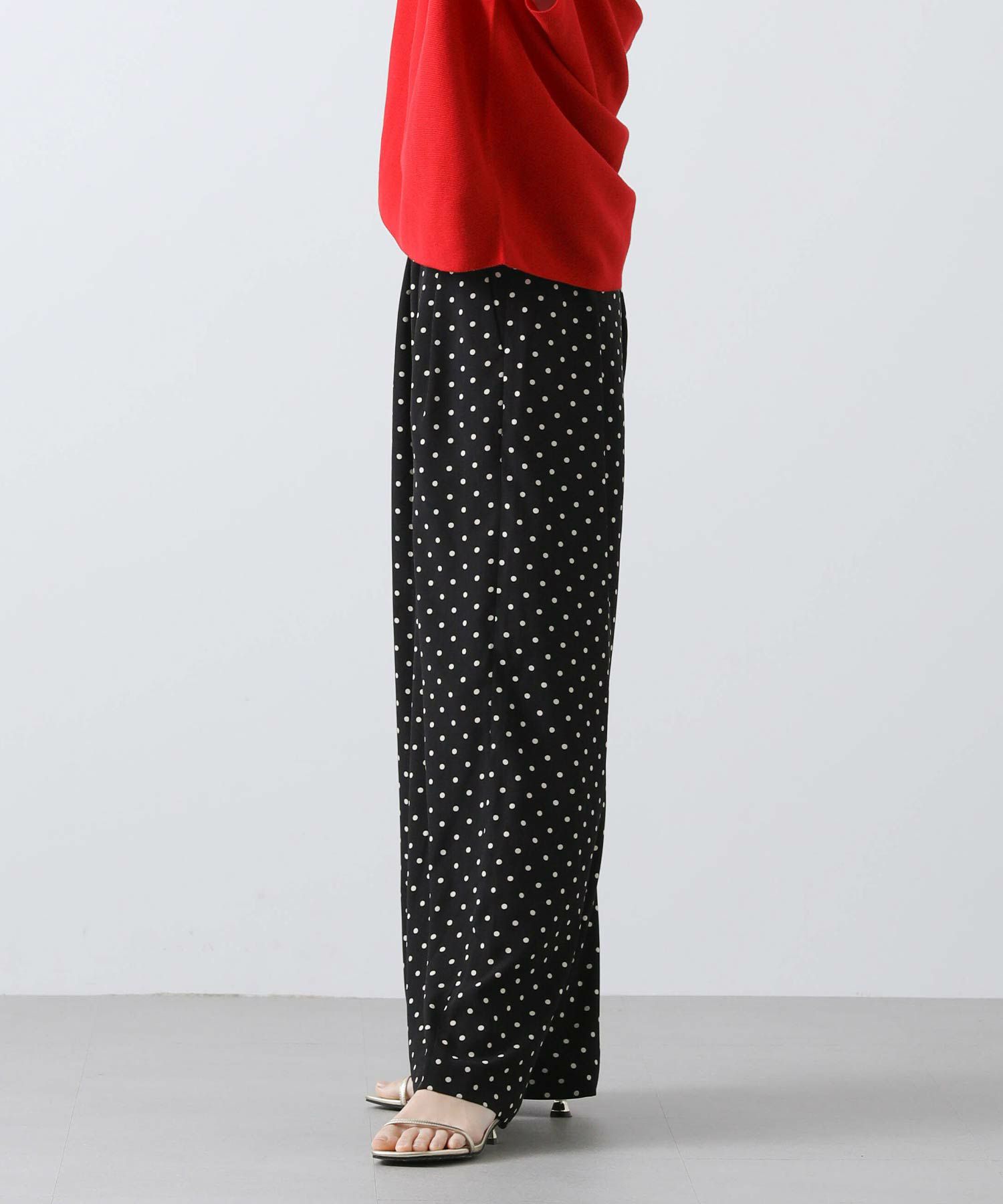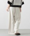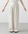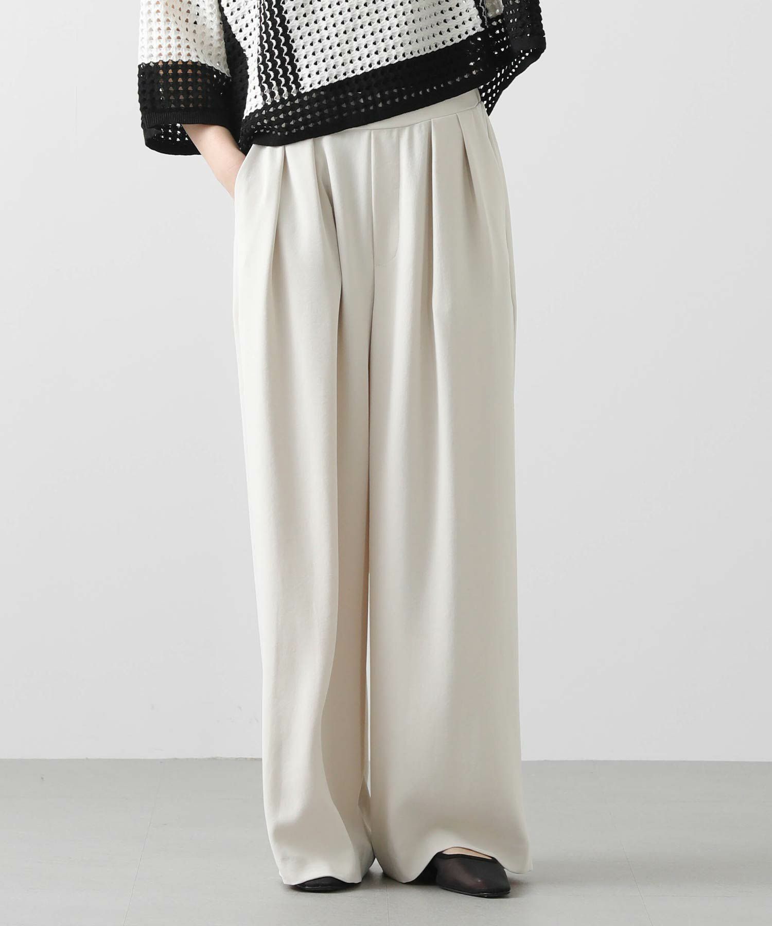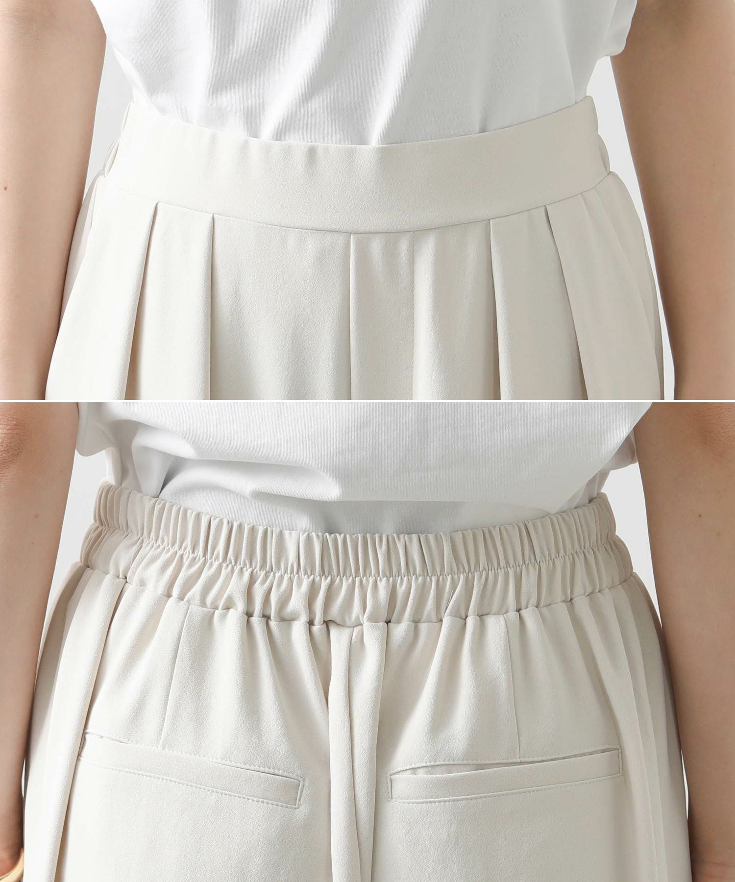 今回は着丈4㎝違いの2サイズ展開(ウエストヒップ寸等は同じ)で、高身長の方にも対応できるようにしています。フロントに入れた2タックが腰回りをカバーし、すとんと落ちるきれいなシルエットです。