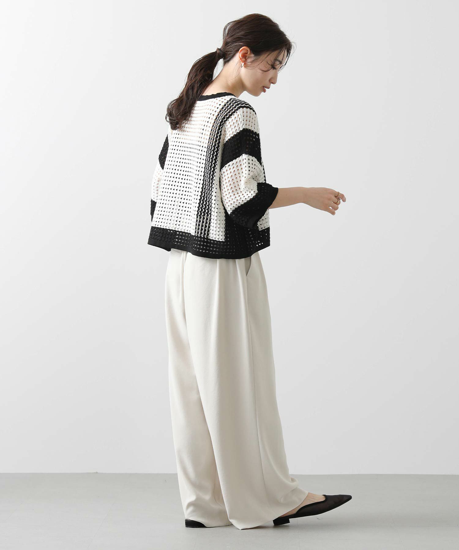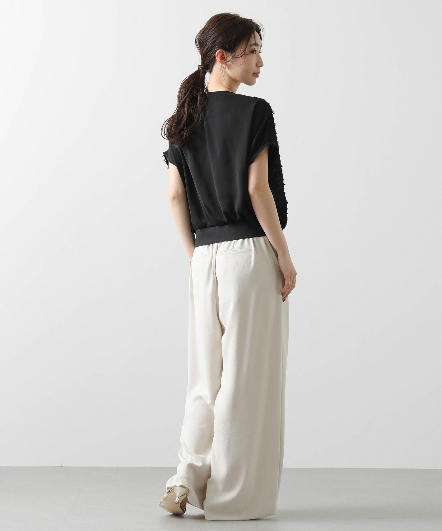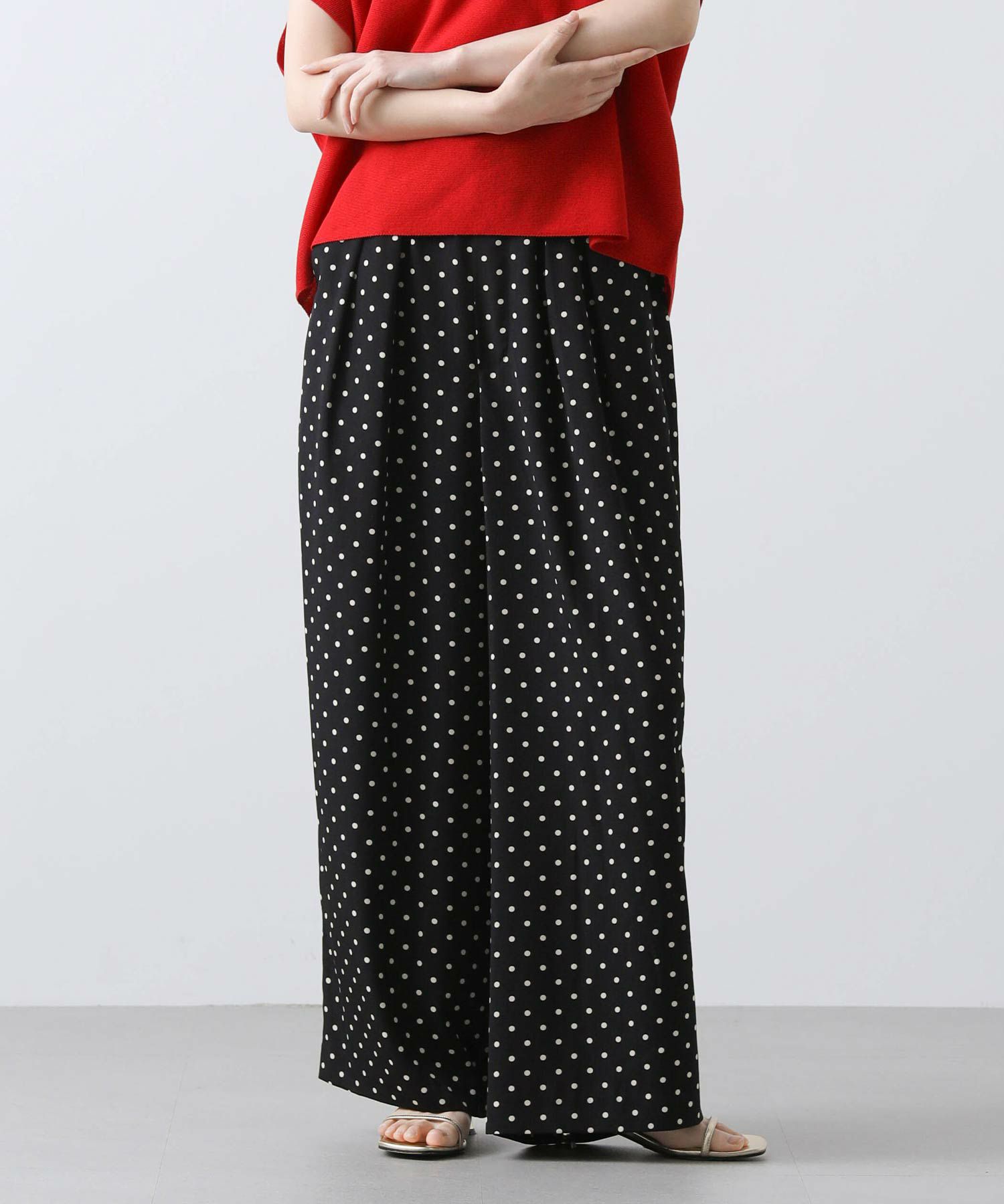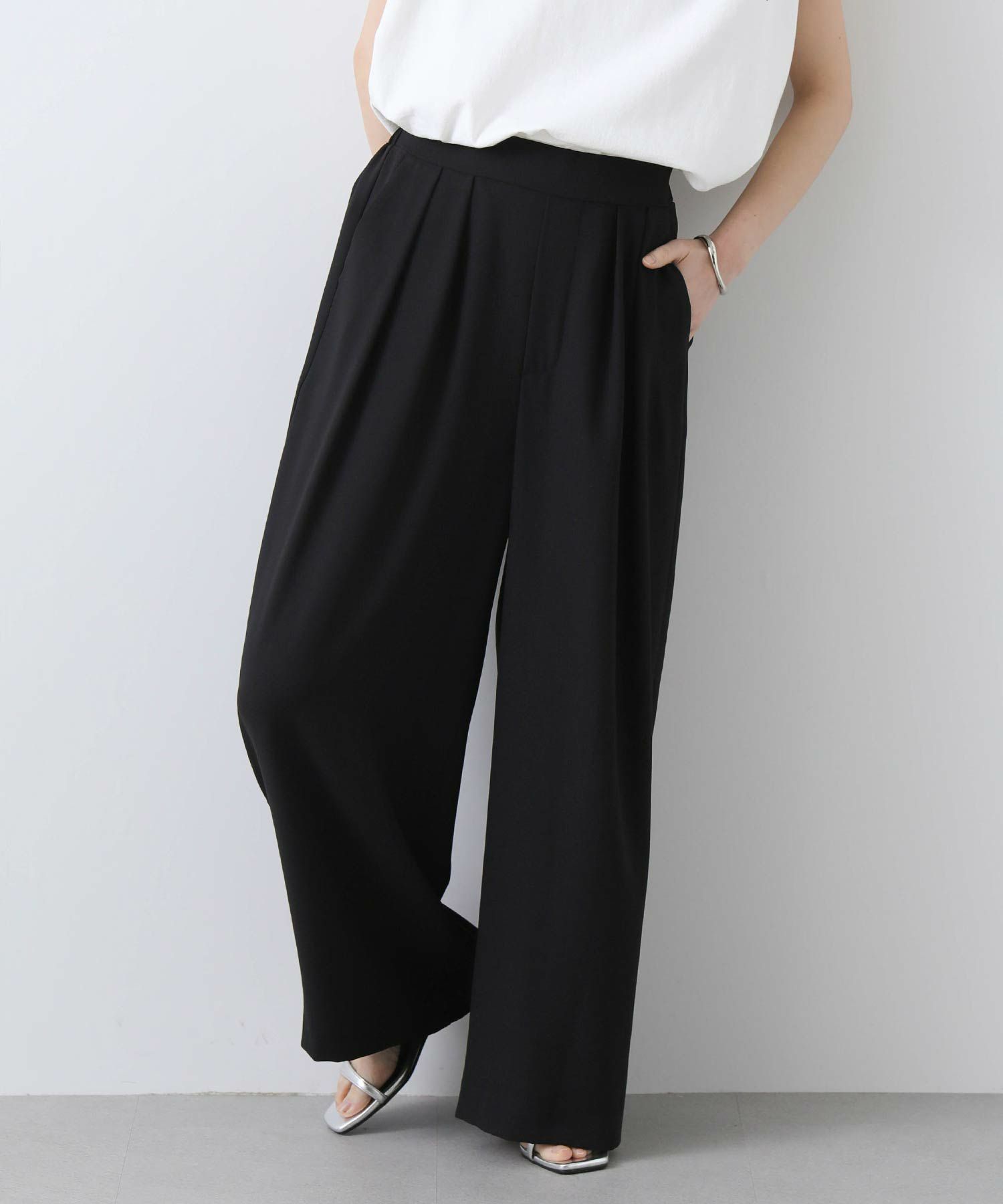今回は着丈4㎝違いの2サイズ展開(ウエストヒップ寸等は同じ)で、高身長の方にも対応できるようにしています。フロントに入れた2タックが腰回りをカバーし、すとんと落ちるきれいなシルエットです。