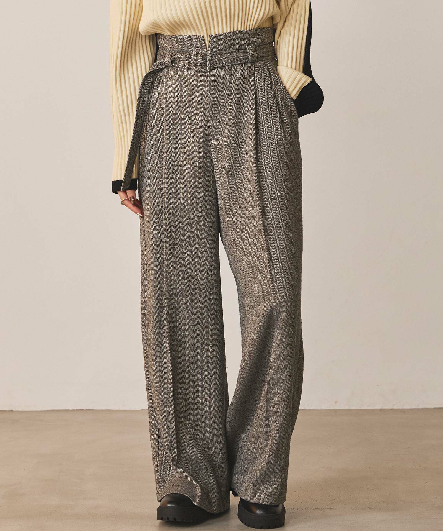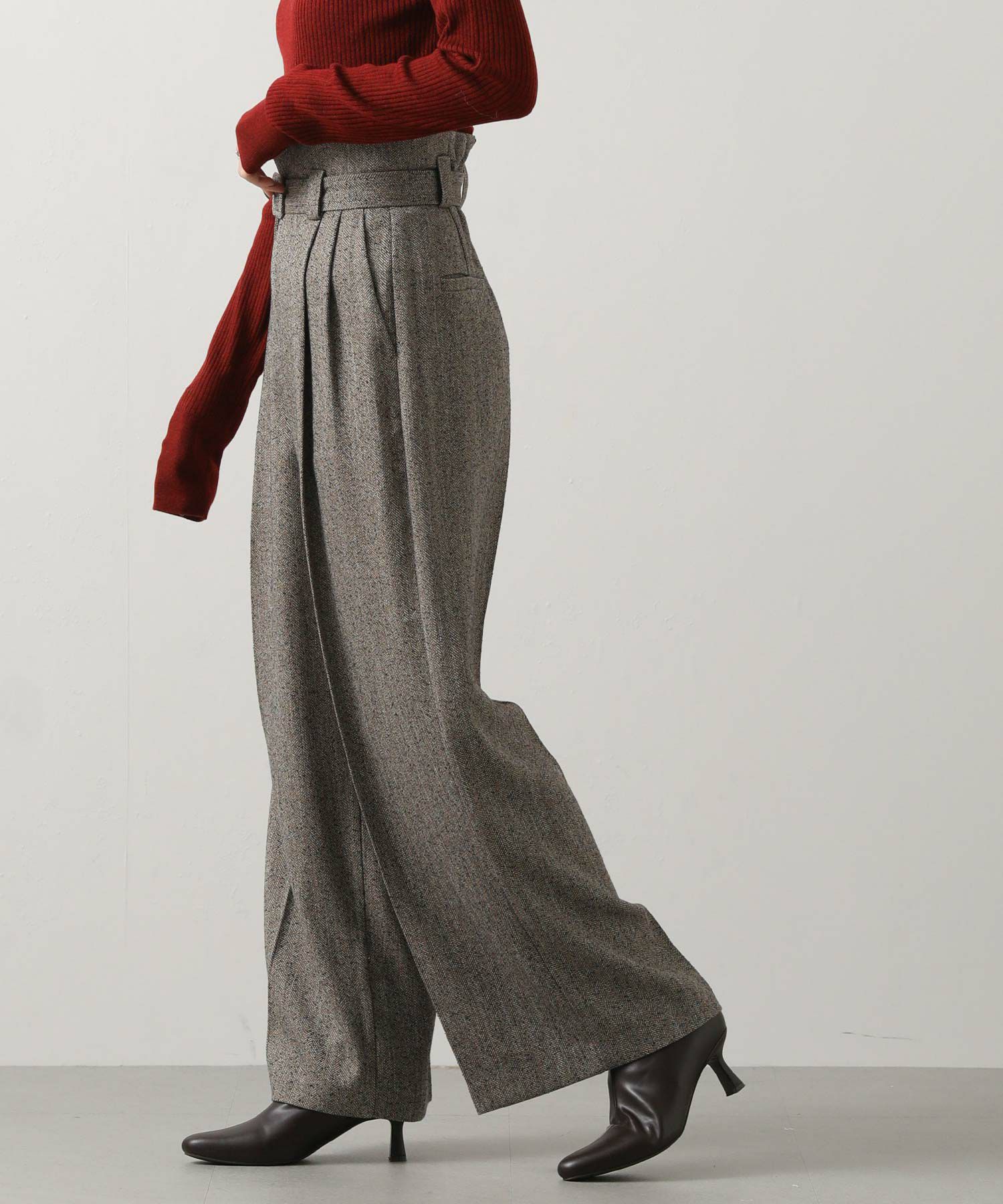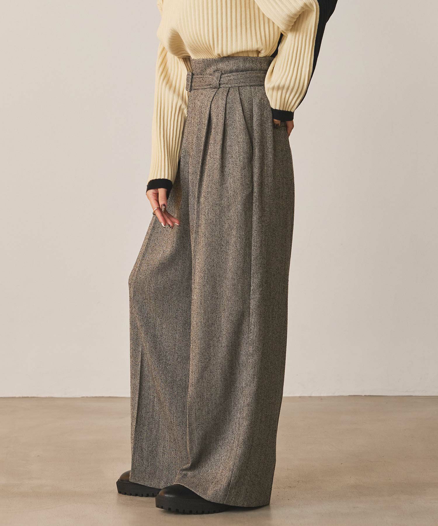 ハイウエストで脚長効果があり、フロントのタックとセンタープレスが美しいシルエットを強調、スッキリとしたラインを演出。