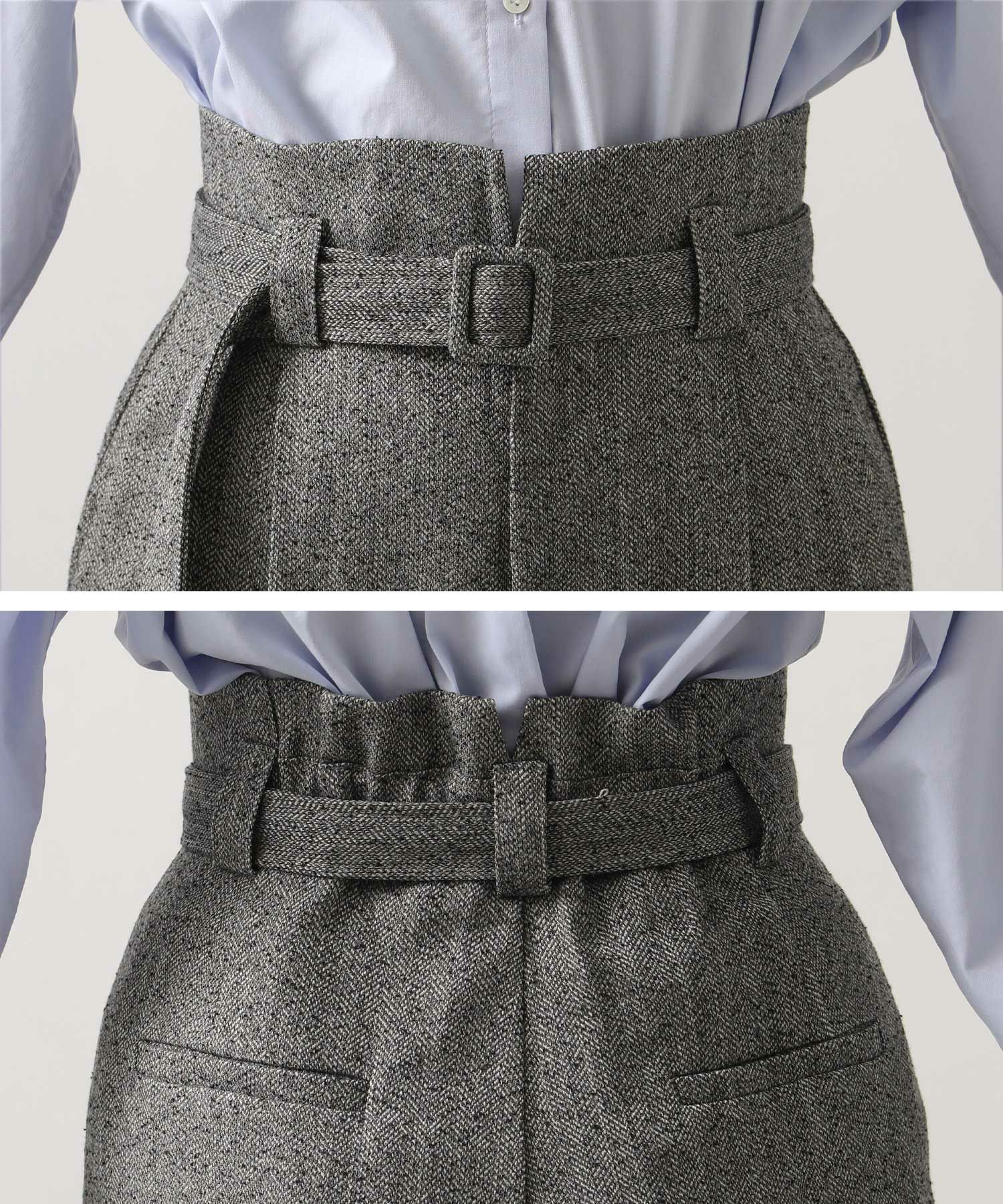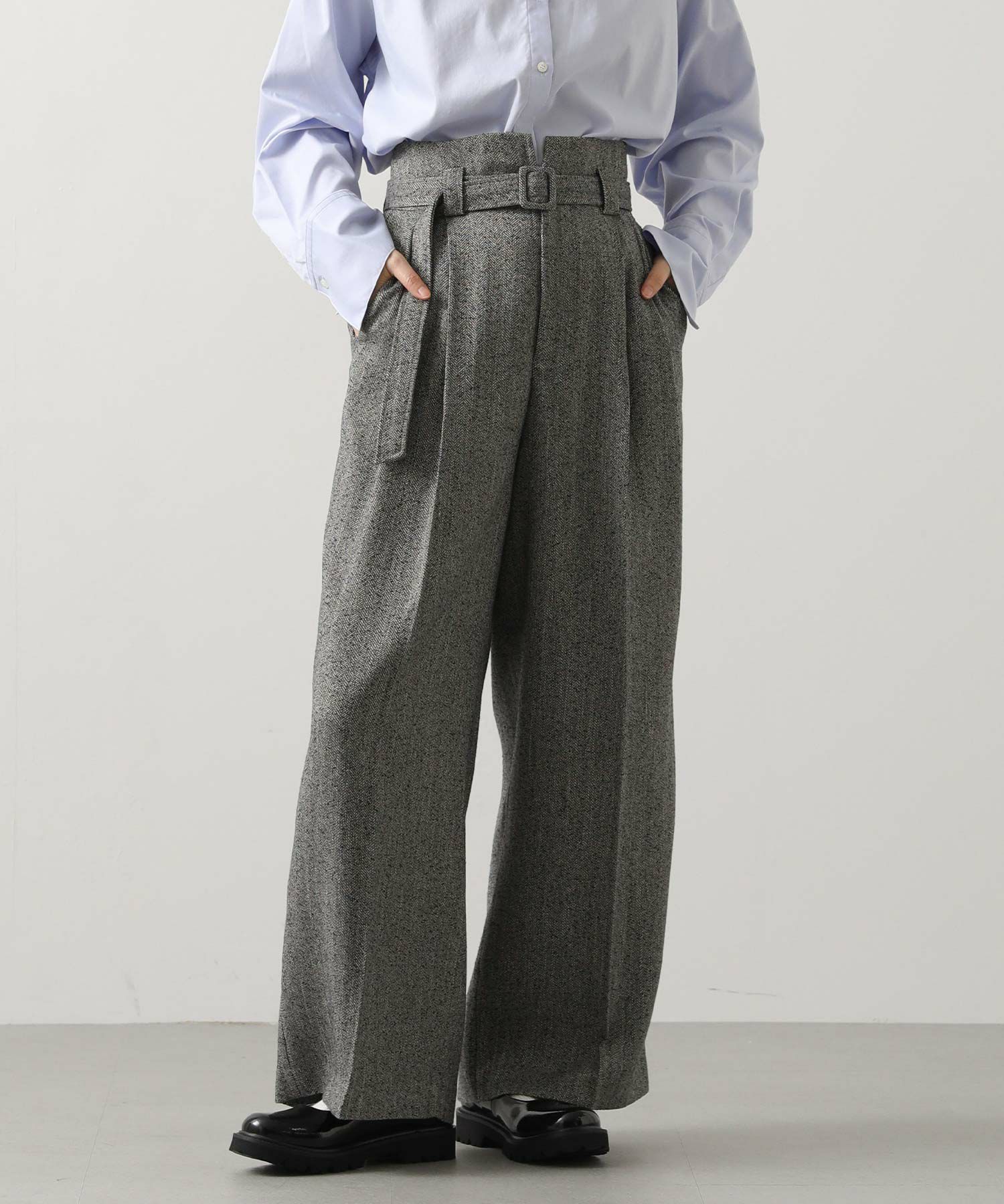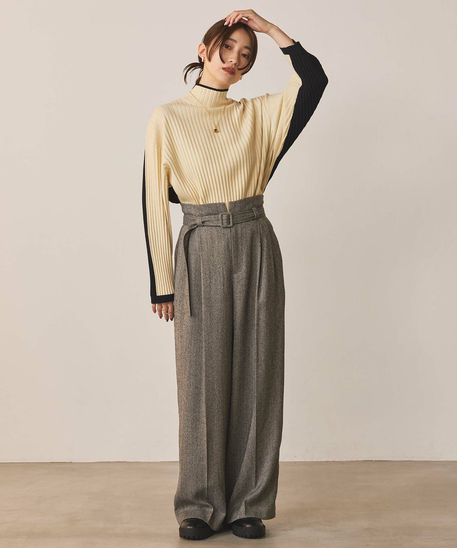 ハイウエストで脚長効果があり、フロントのタックとセンタープレスが美しいシルエットを強調、スッキリとしたラインを演出。
