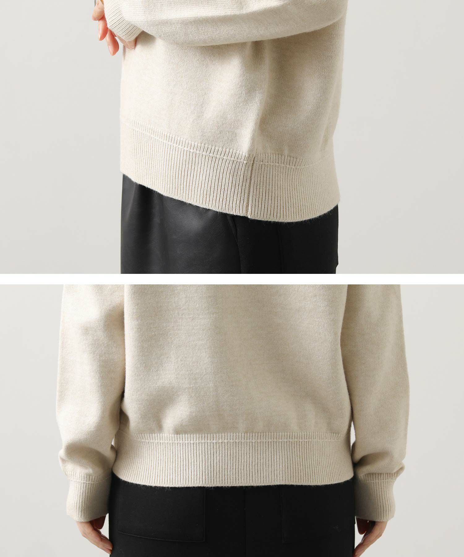衿ぐりは程よく詰まったクルーネックで、首元をきれいに見せながら安心感のある着心地。