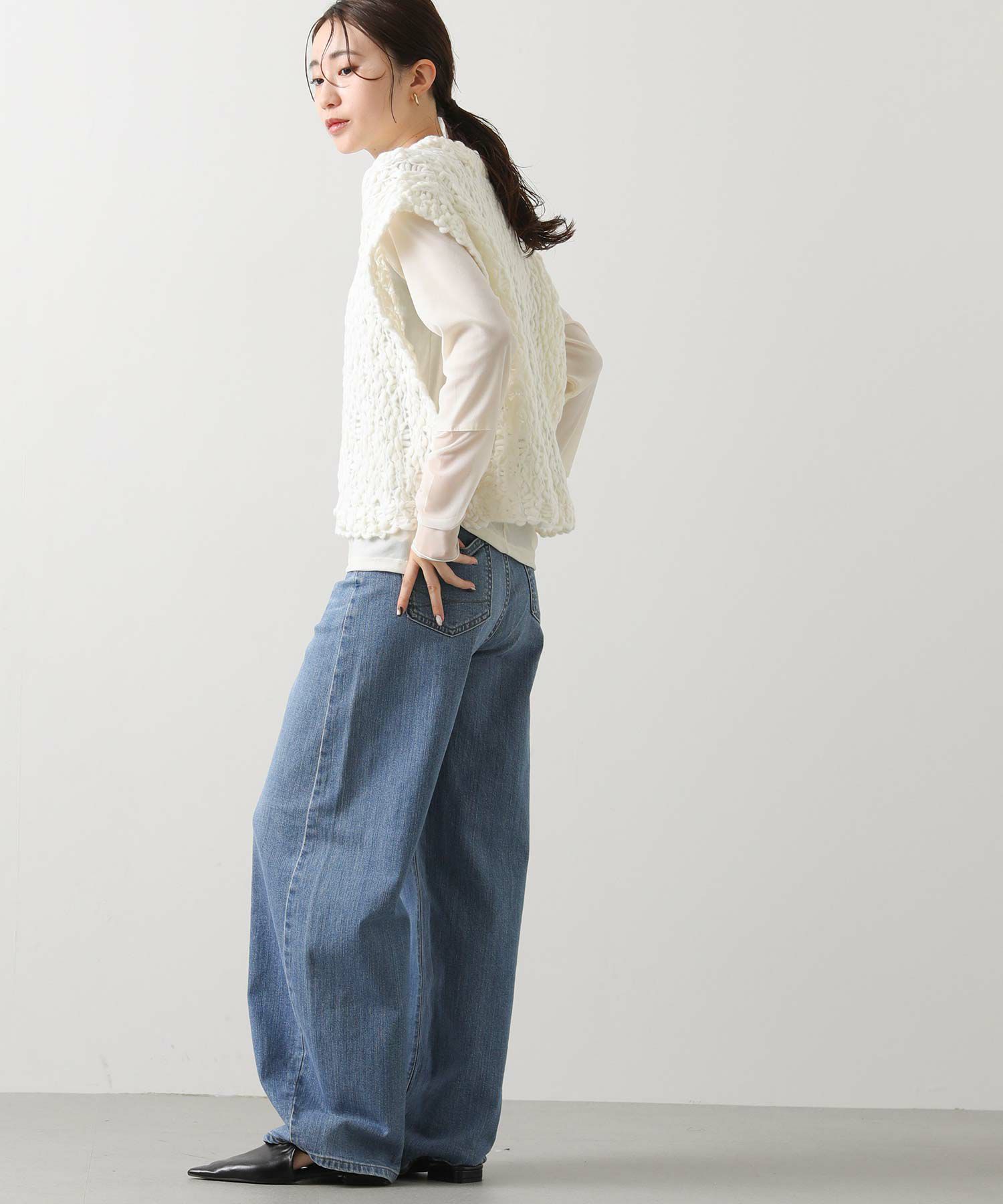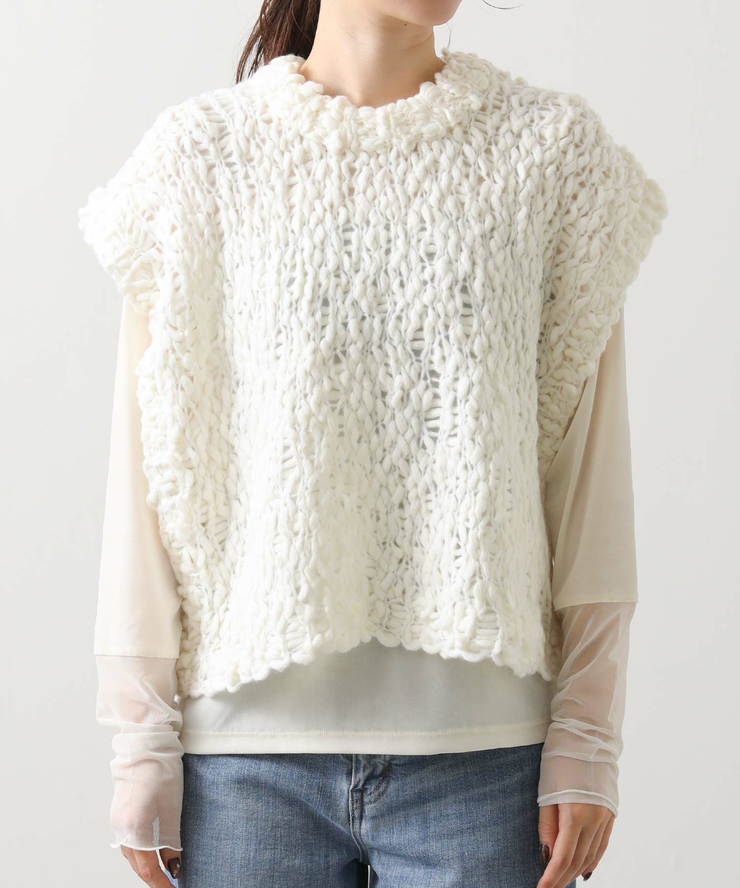 スラブ糸自体に表情があり、手編みであえて軽く編み上げたニットベストは、ざっくり感がとても可愛い1着。
