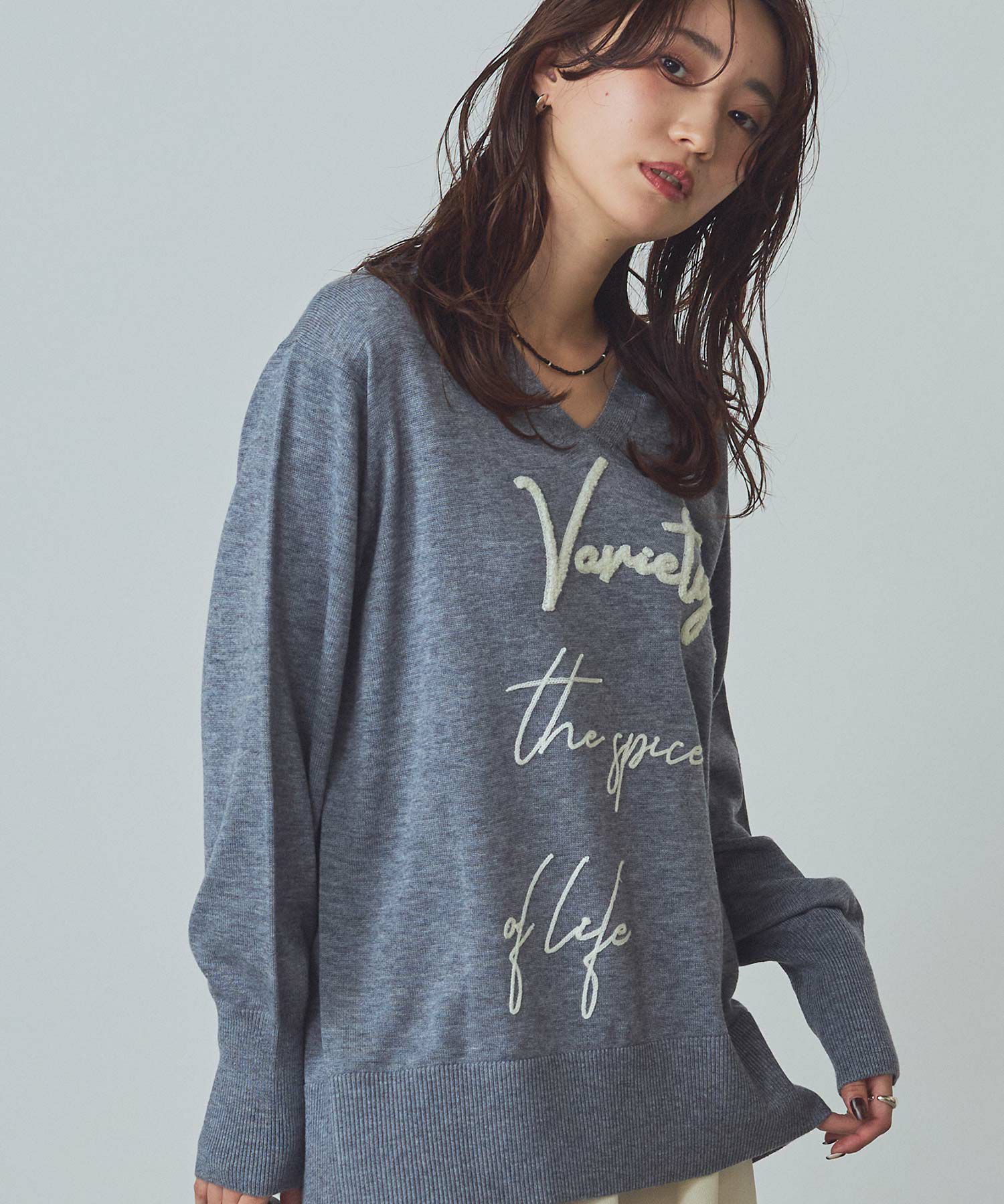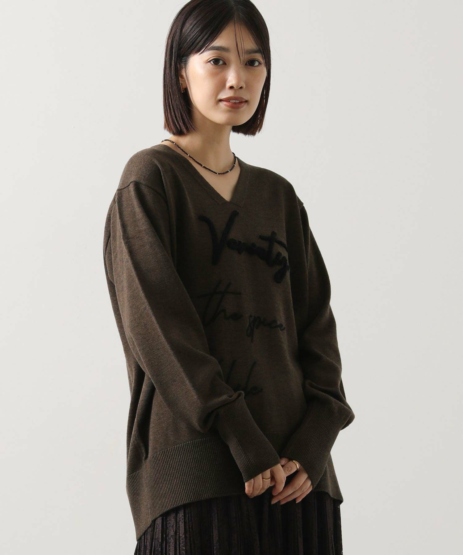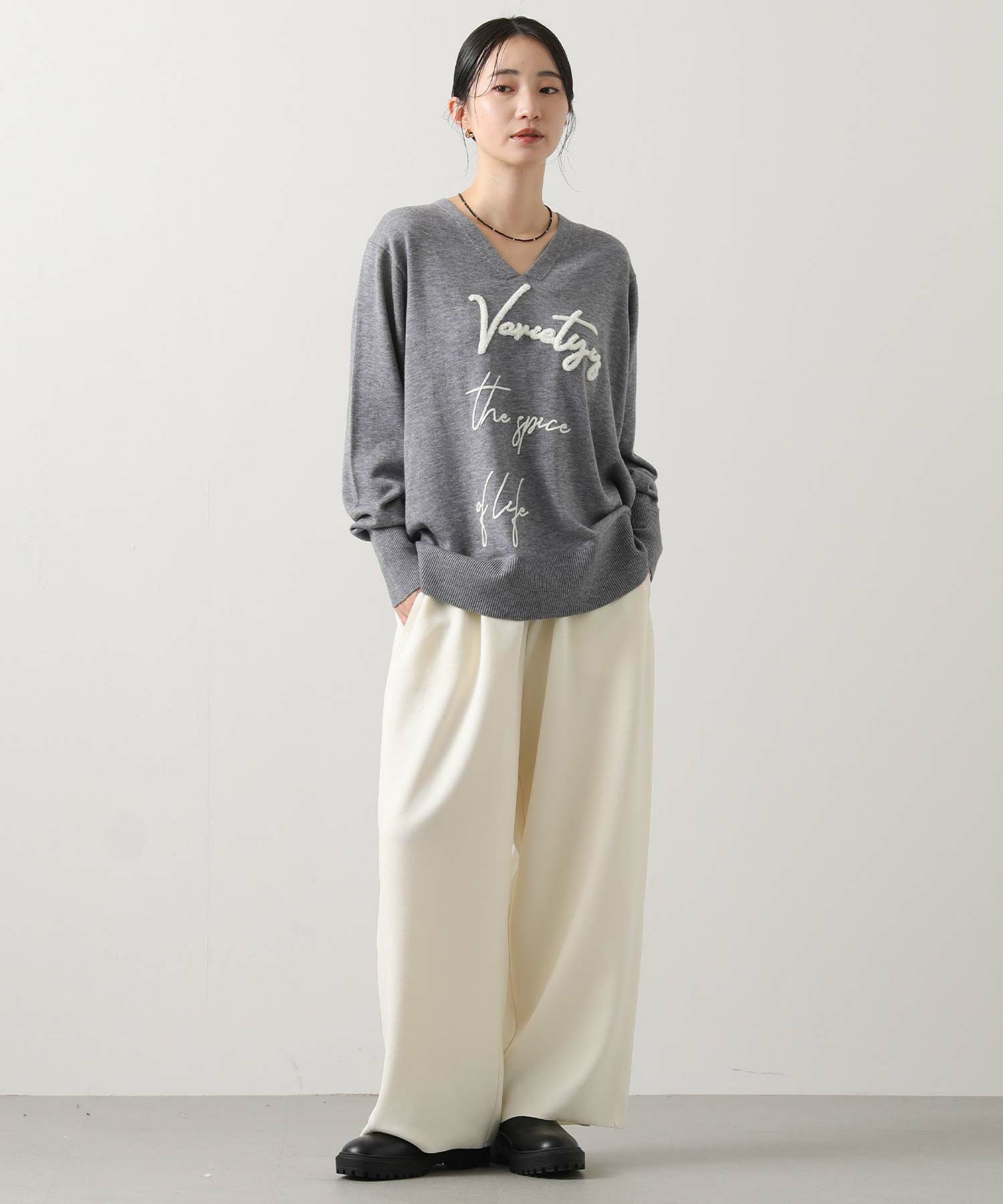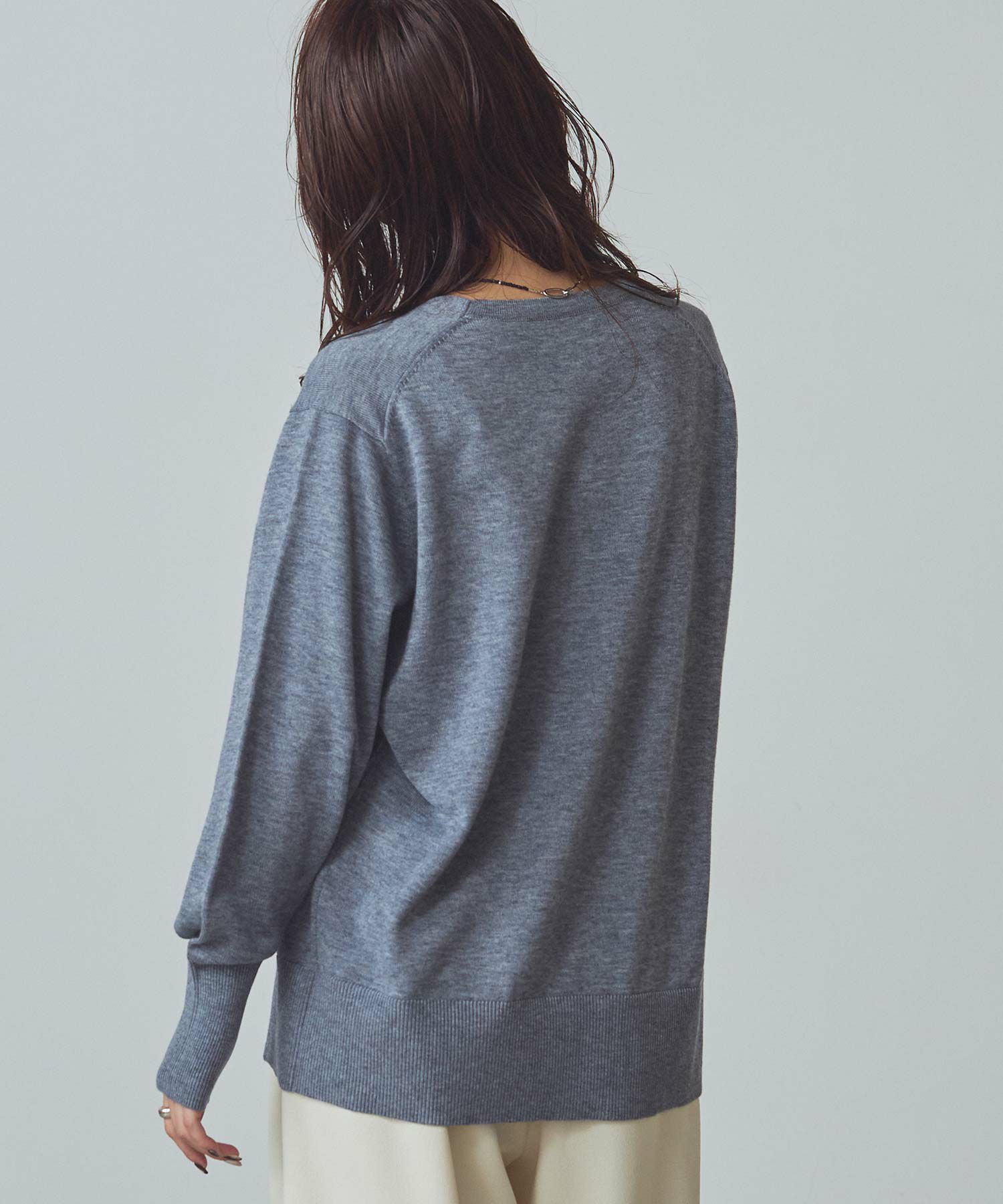 デコルテを美しく魅せるVネックの首元もポイント。