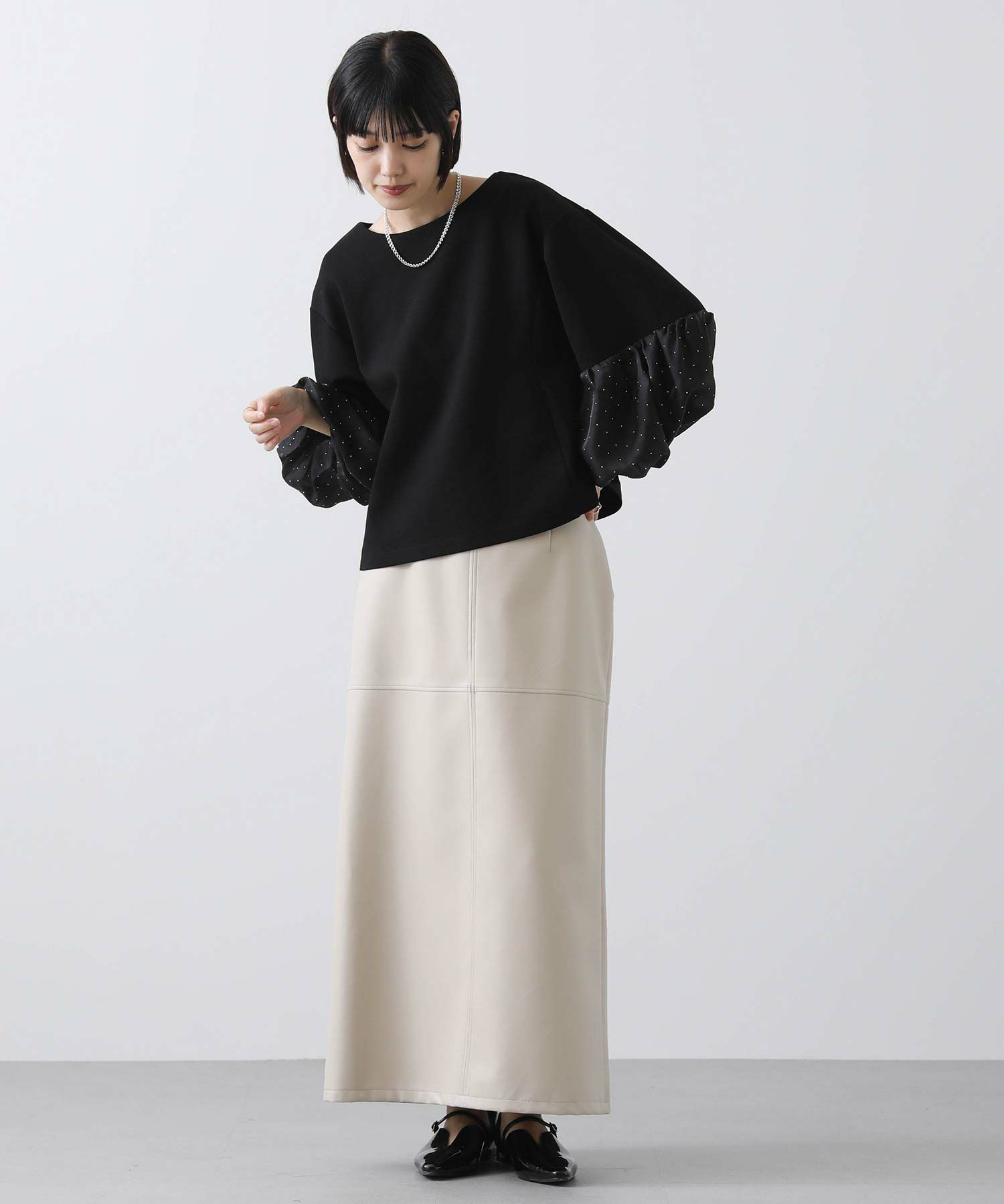 異素材のパフスリーブに、ランダムにつけられたラインストーンがキラキラと光り、コーディネートのポイントに。