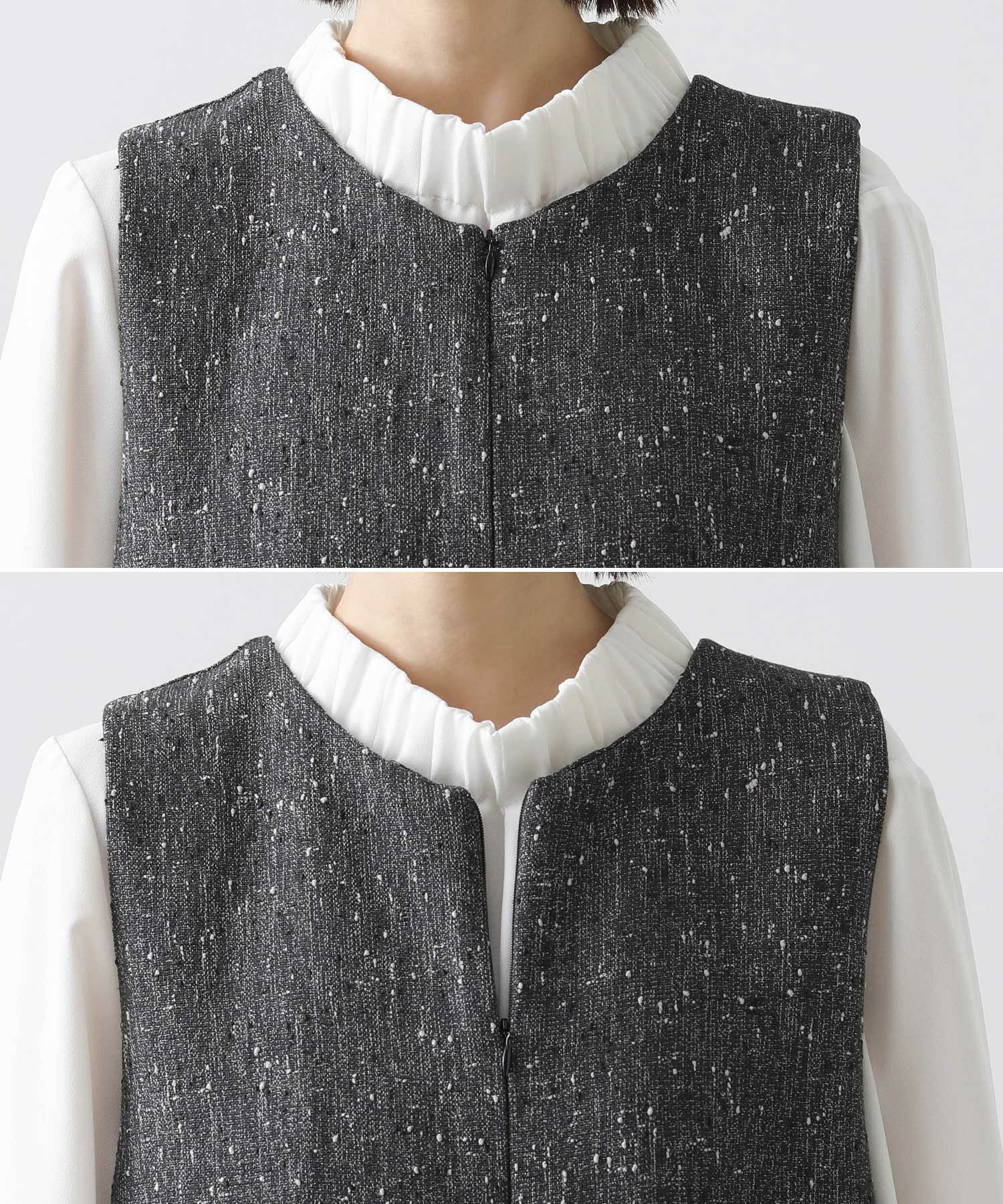 インナーのデザインに合わせてファスナーの開き具合を調節可能。スリットを前にすることで縦のラインをさらに強調し、スタイリッシュな着こなしに。クルーネック側はインナーの衿デザインを選ばないのでコーデを迷わないのが嬉しいポイント。よりきちんと感のあるコーデに仕上がります。