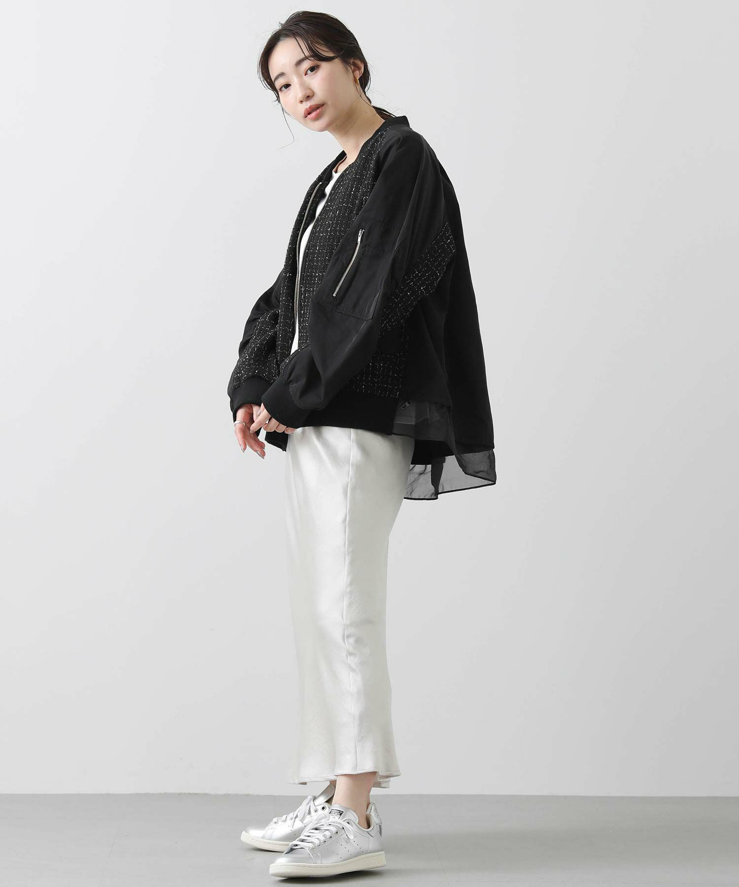 春物のアウターを探してこちらのアイボリーを購入。前側はツイード、後側はフワッとした見た目がMA-1なのに大人っぽく着れます。デニムにもロングスカートにも相性抜群。ゆったり着たい人向け。