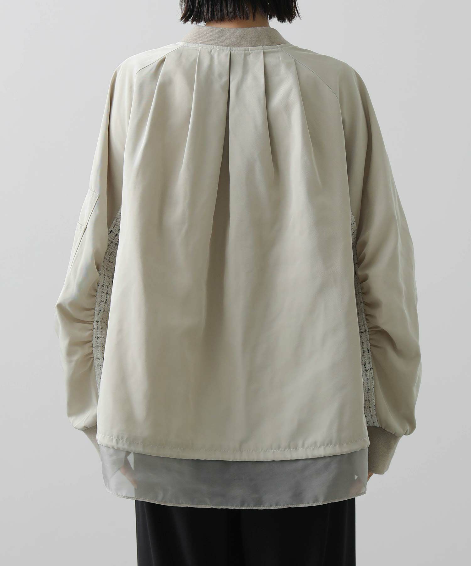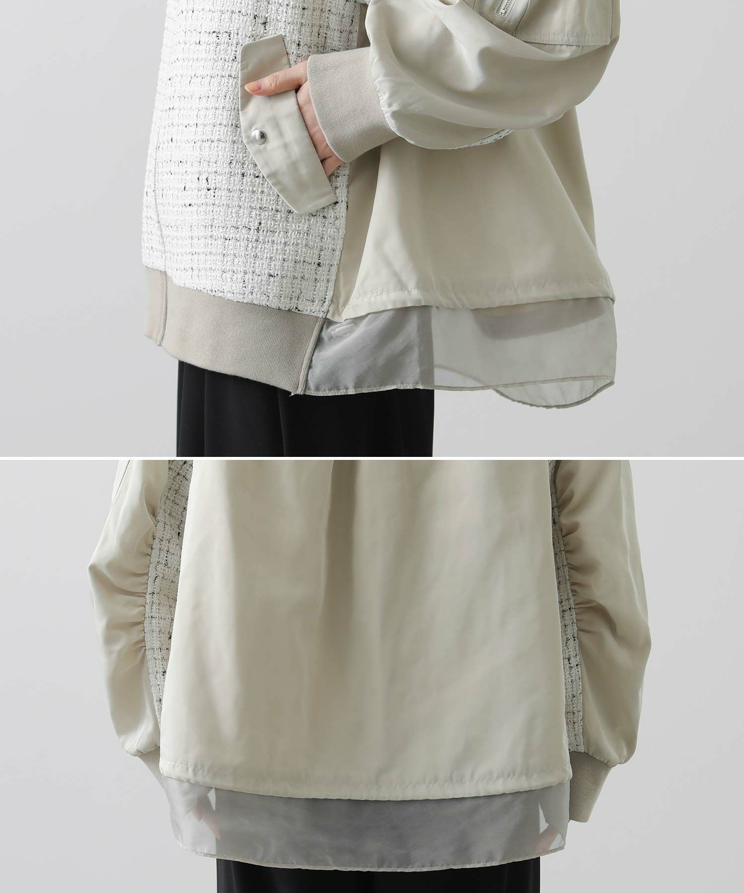 カジュアルなディティールとツイードの上品さのアンバランスさが絶妙◎ツィードと袖のシャーリングに加え、後身頃をツイル素材にしてタックでボリュームをもたせたフェミニンライクなミリタリーブルゾンに仕上げました。