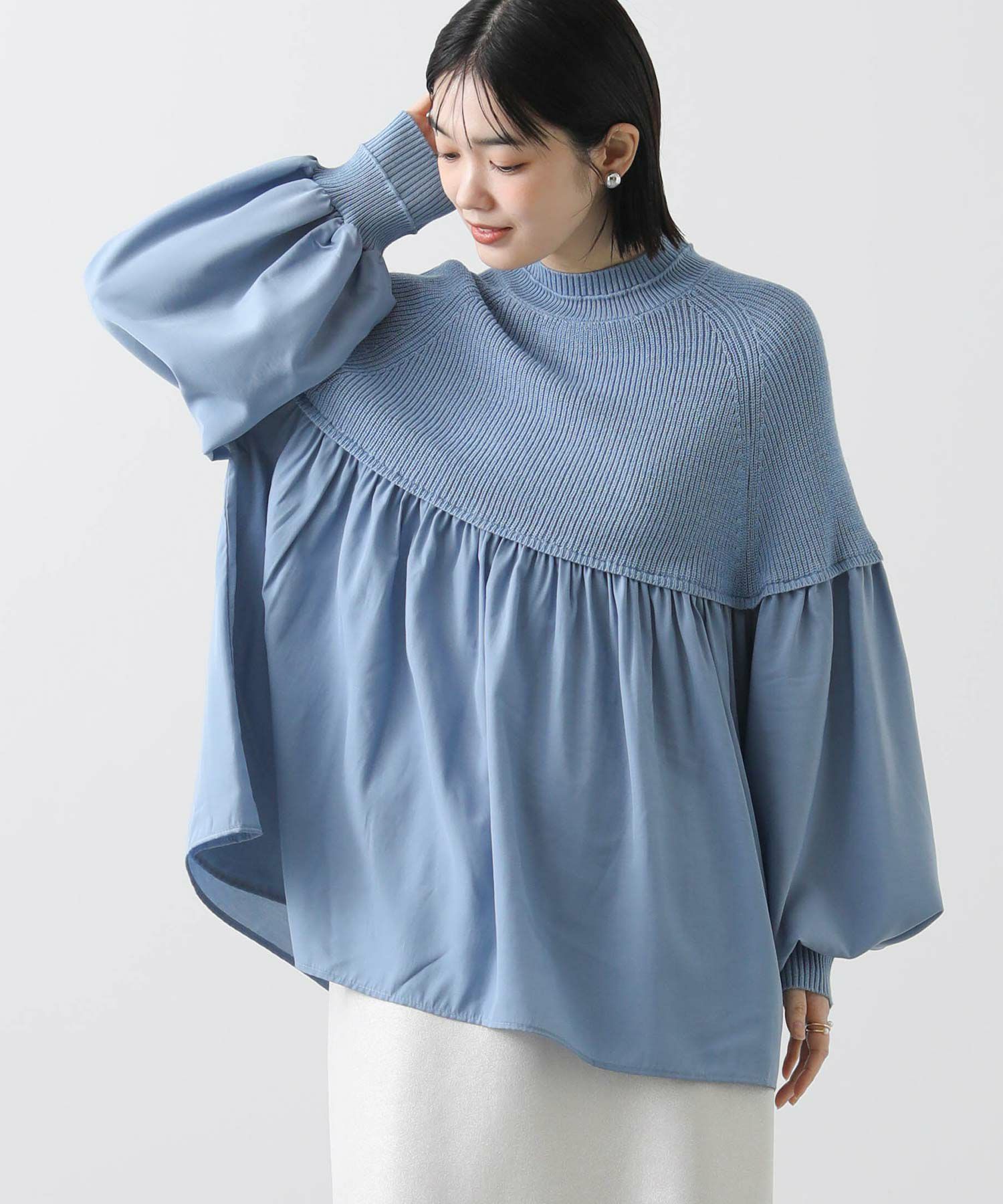 柔らかいニットとブラウス生地のドッキングニットは、どちらも柔らかく肌触りの良い素材で着心地も◎合わせるボトム次第でキレイ目にもカジュアルにも着回せる1枚で、シンプルながら存在感のあるアイテムです。