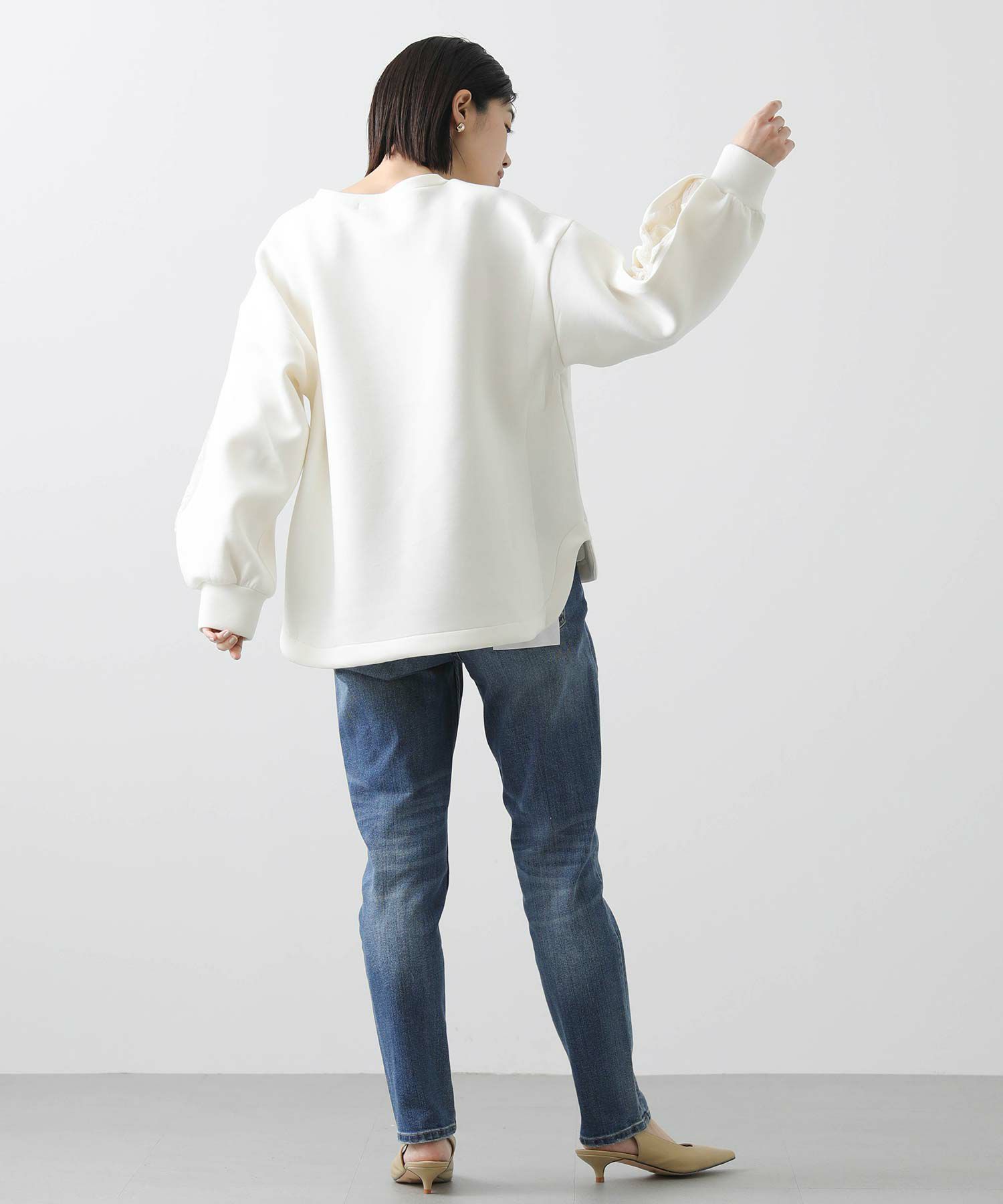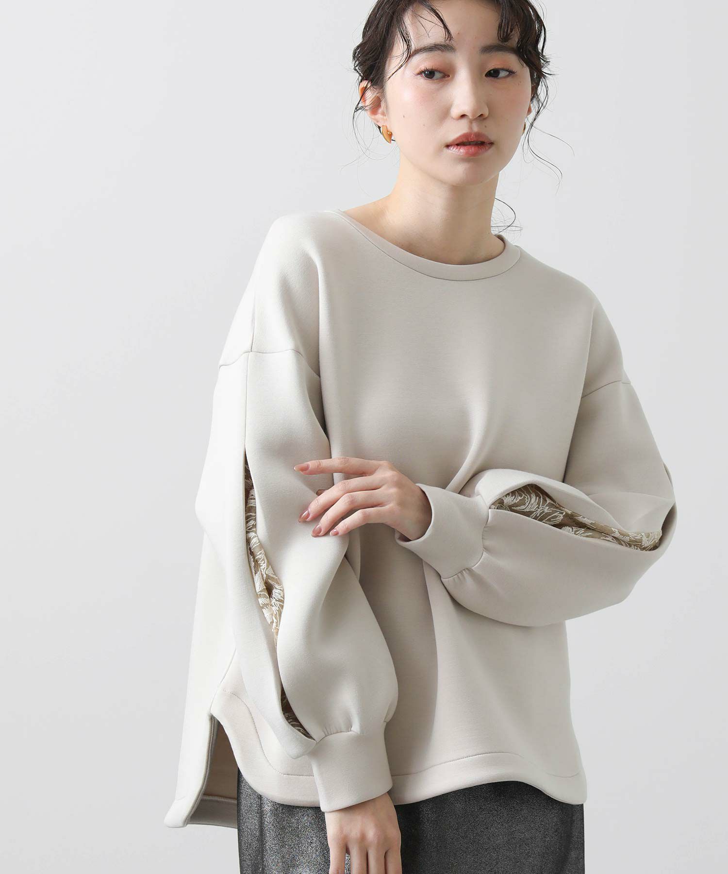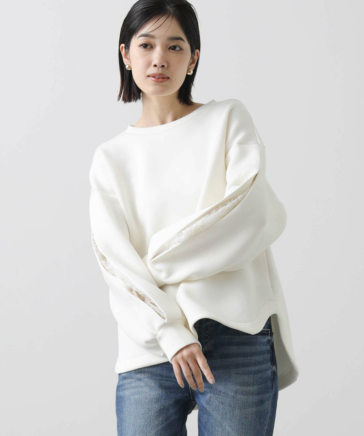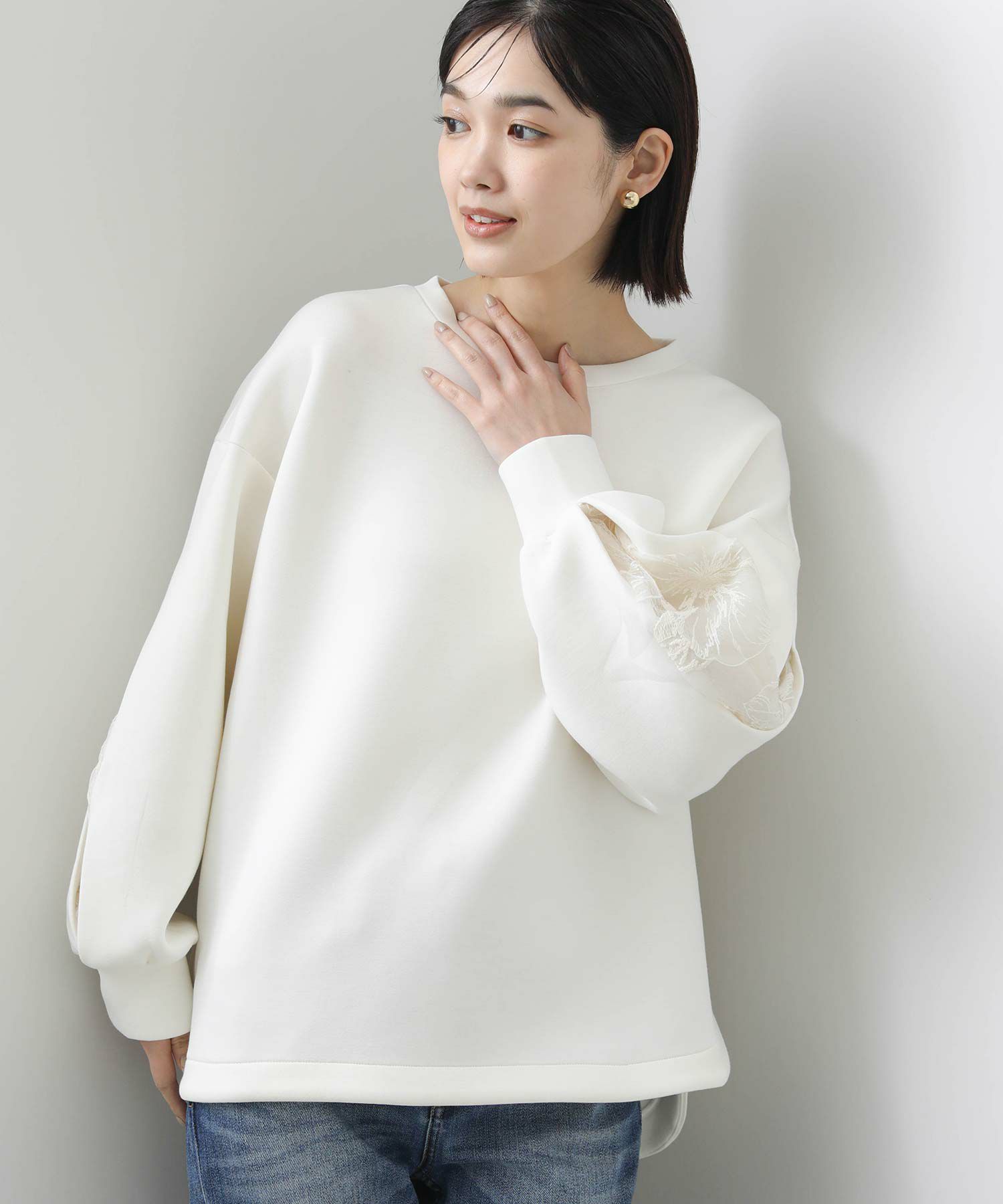 お袖をたくし上げるとタックが開き、レースとオーガンジーが覗き一気に華やかな印象に。さり気ない異素材使いが上品な1枚です。