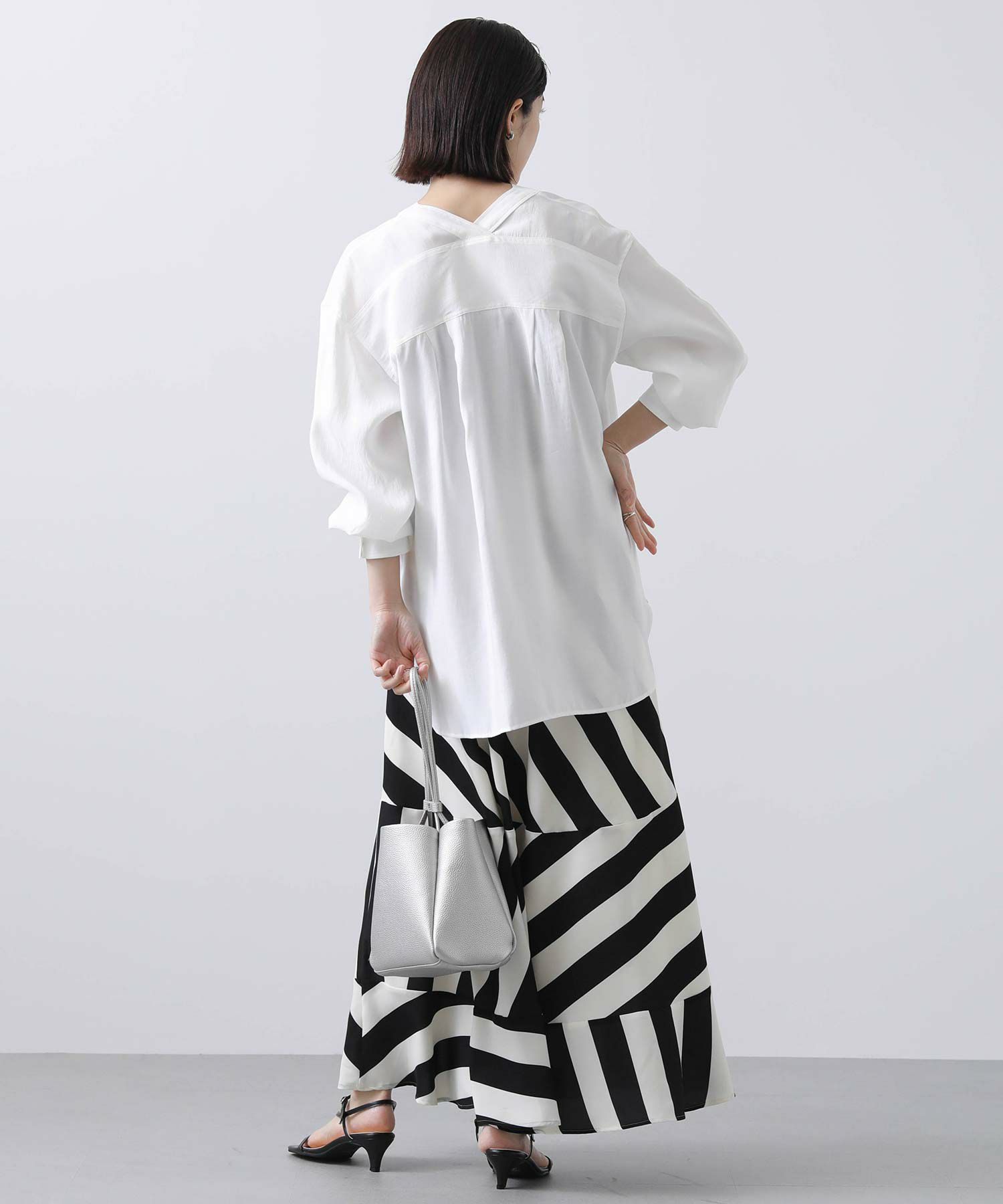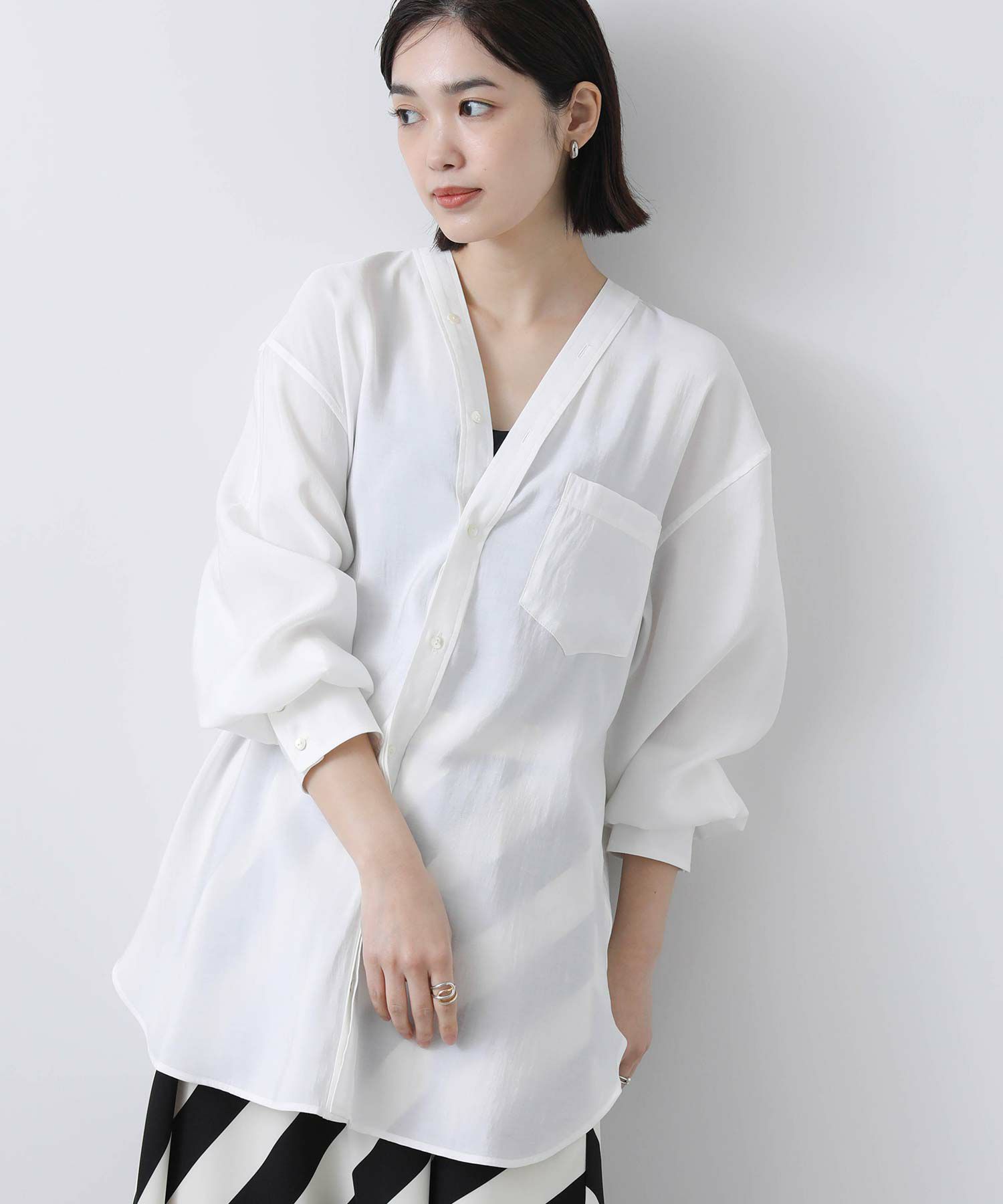 Vネックがデコルテや肌見せを叶えつつ、開き過ぎない計算されたバランスに。 しています。