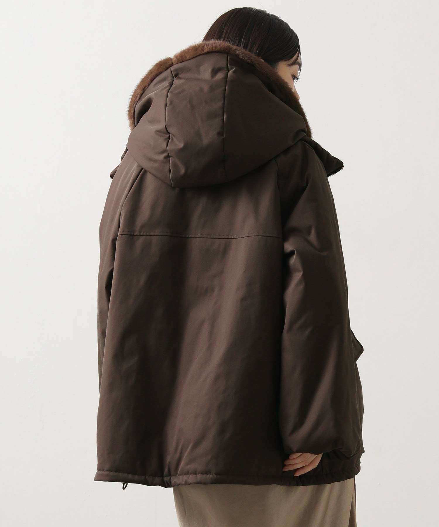 ファーを外すとシンプルなスタンドネックデザインの中綿コート。