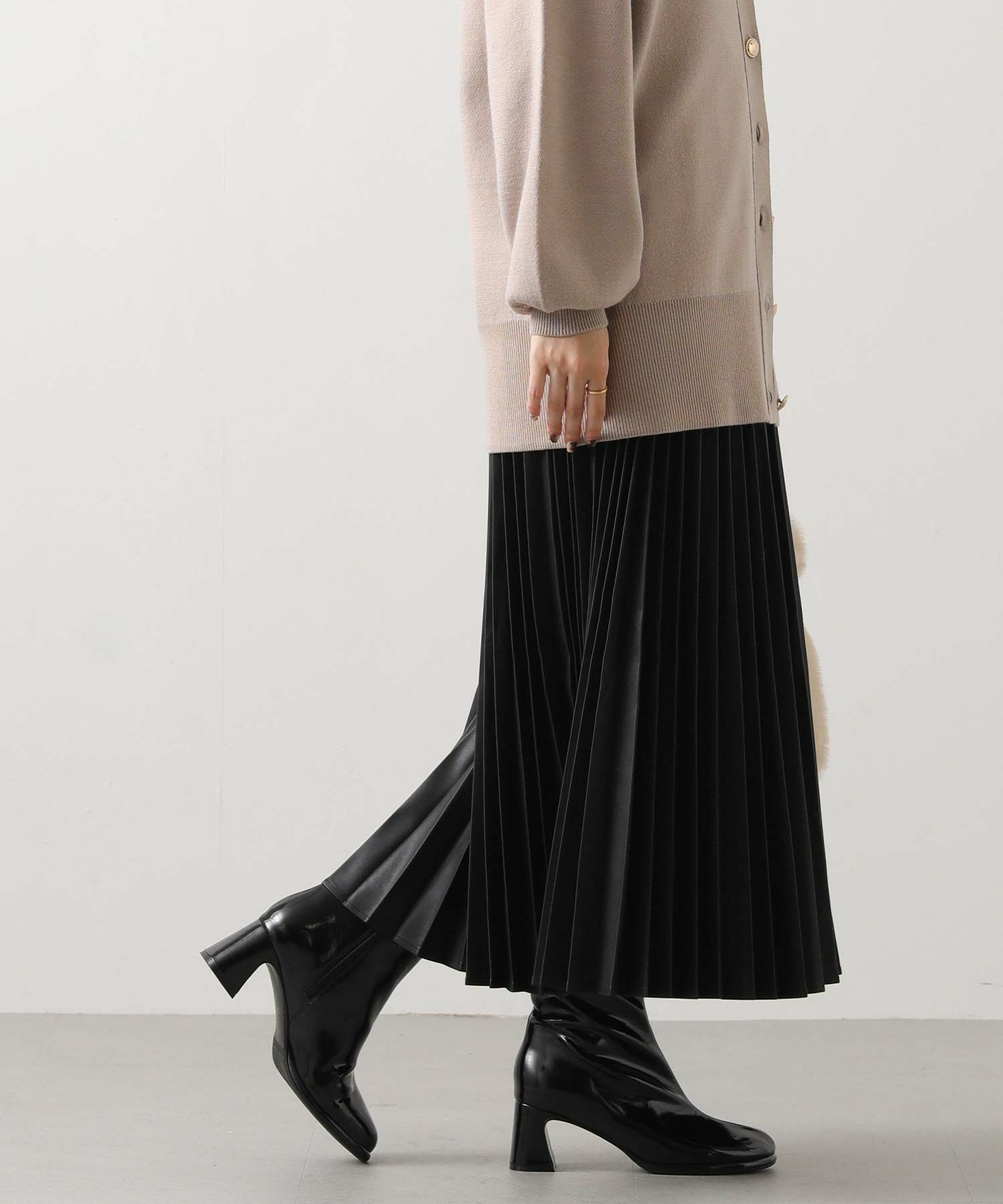 さり気ないツヤ感のあるフェクレザーのモードな雰囲気とプリーツの掛け合わせで、甘くなりがちなプリーツスカートをマニッシュにアップデート。