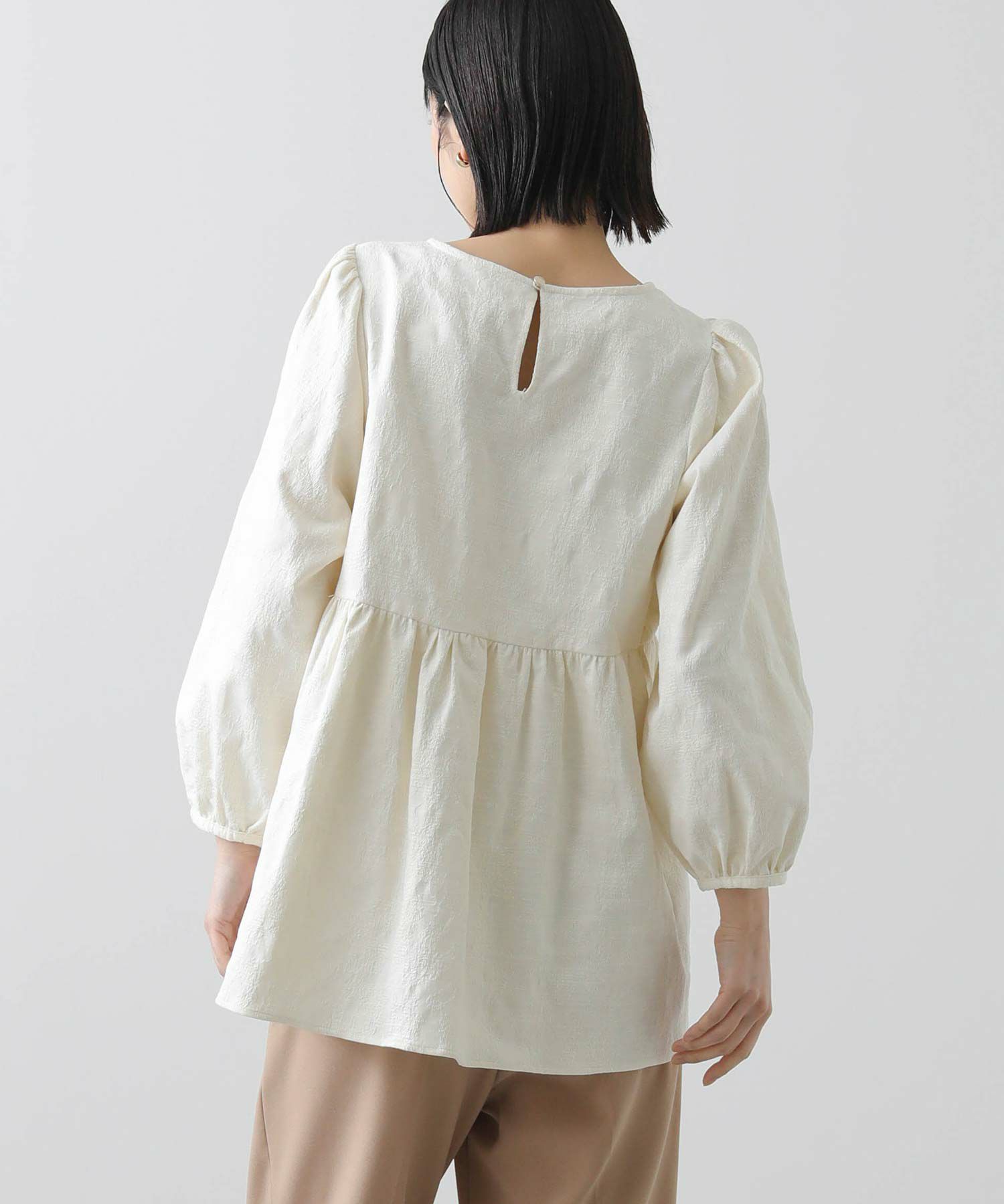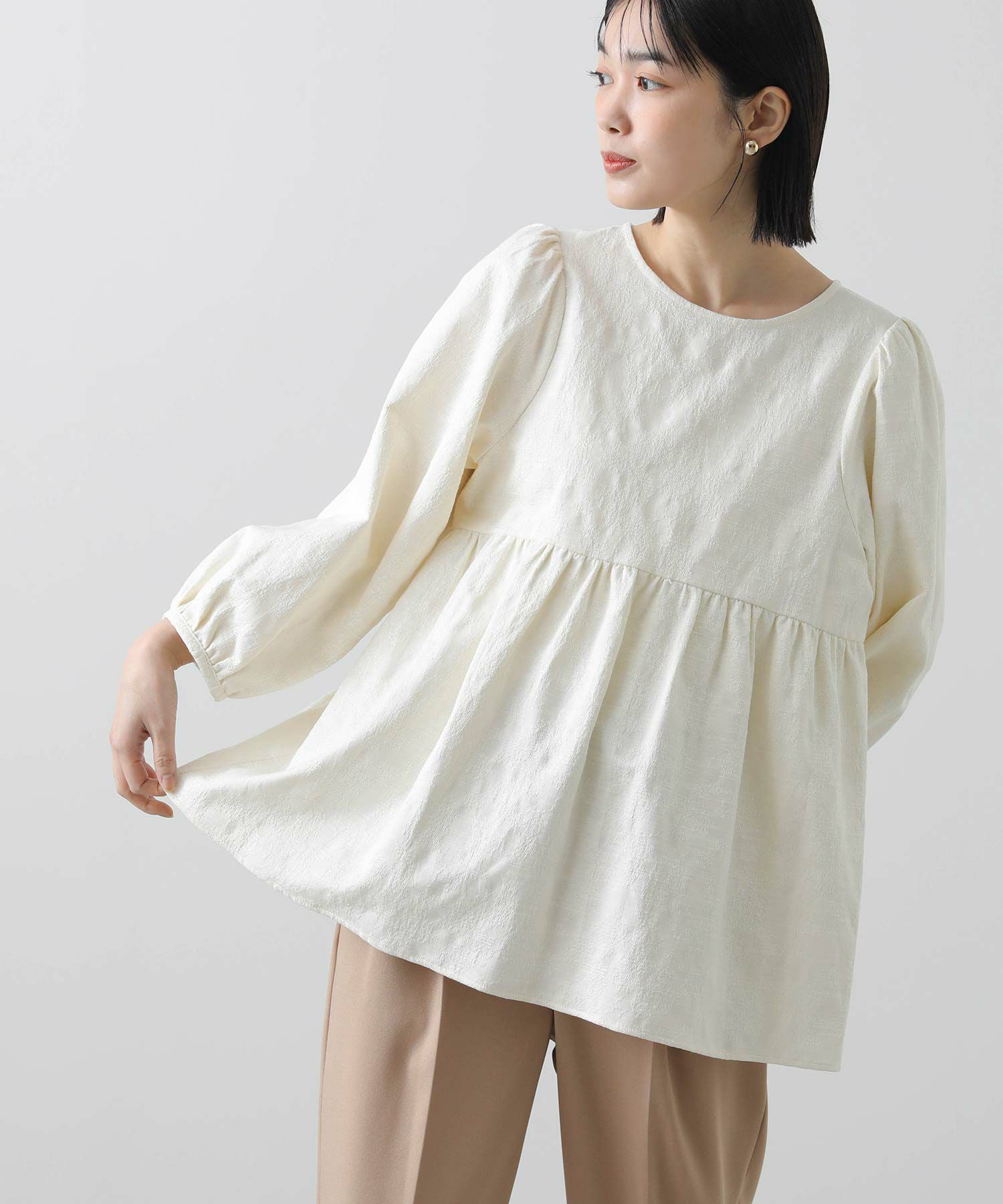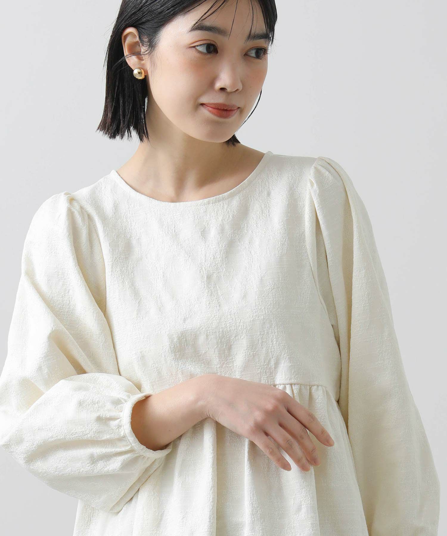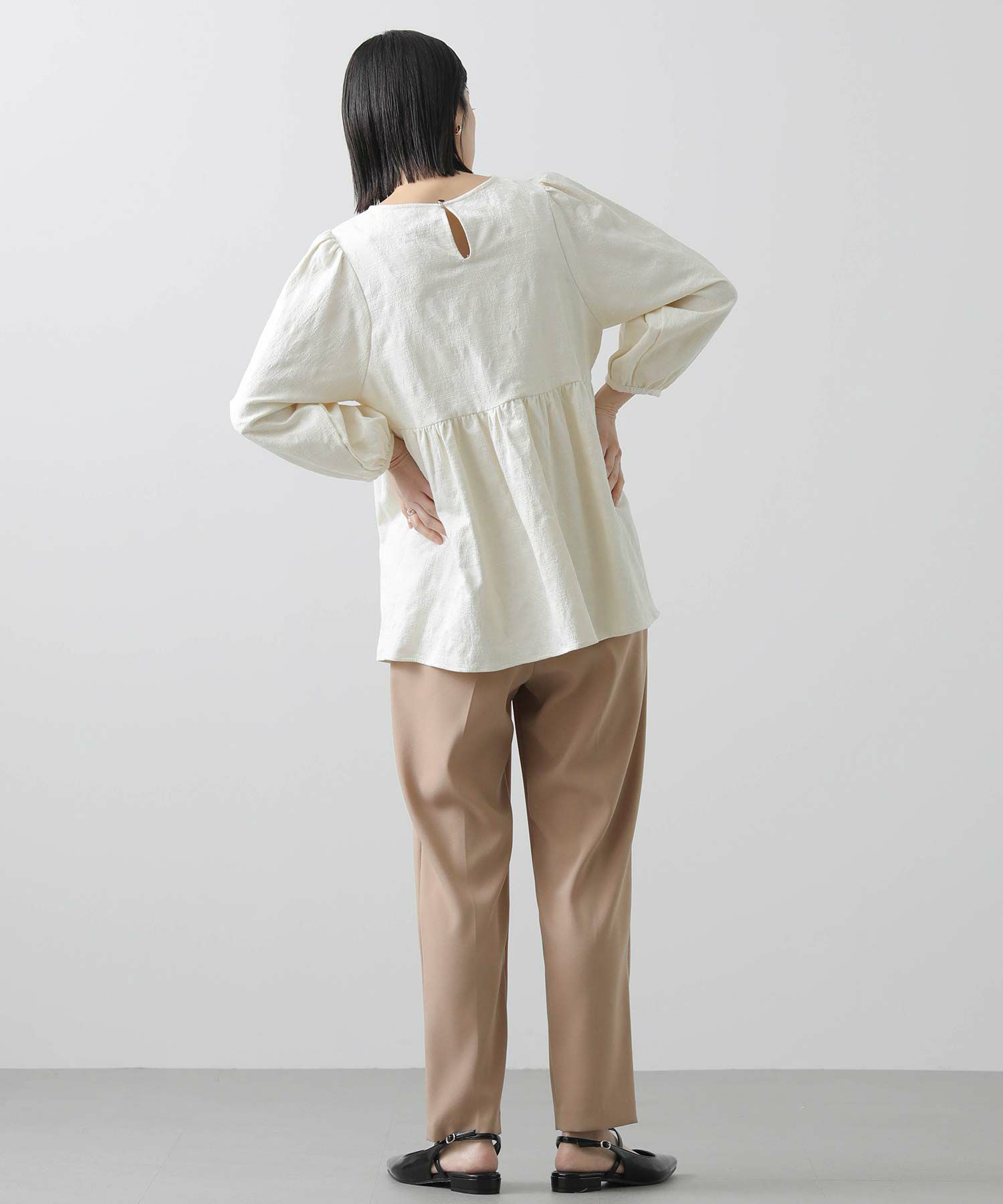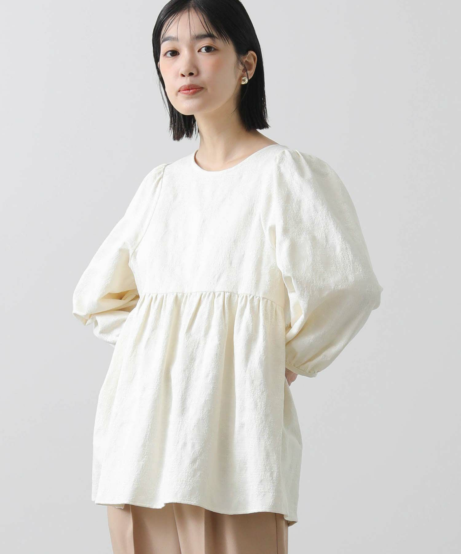 ウエスト切り替えは自然と腰の位置を高く、ウエストが細く見えるようなシルエットに。腰周りをカバーする着丈も◎おおげさ過ぎないボリューム感を出したパフスリーブで肩回りも華奢な印象になります。