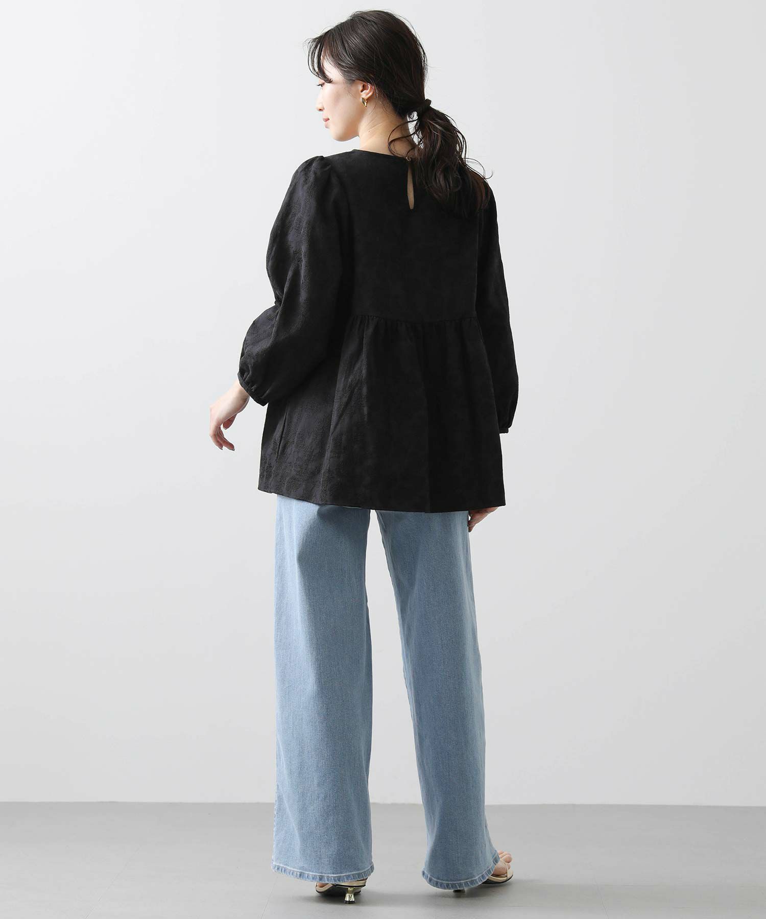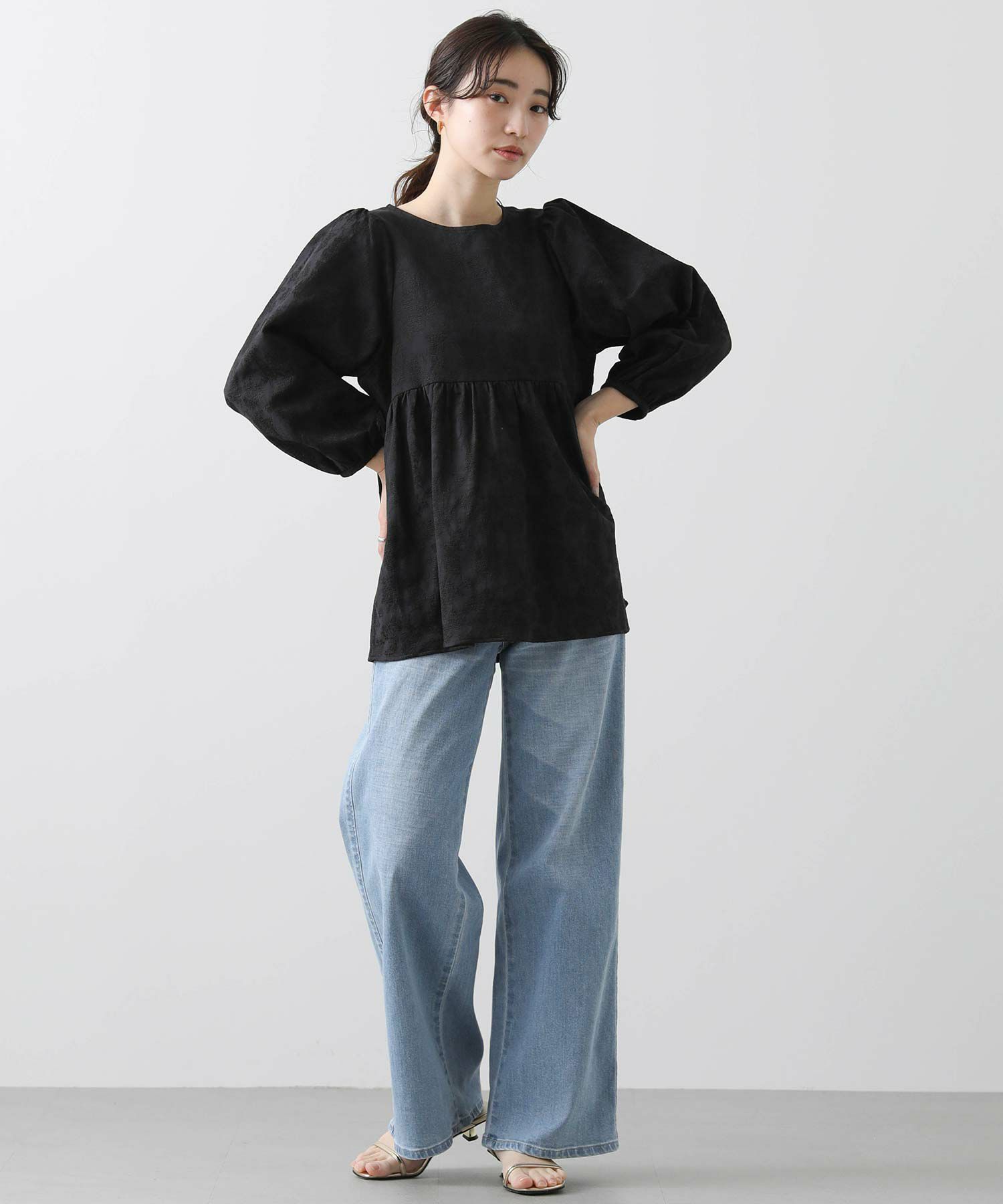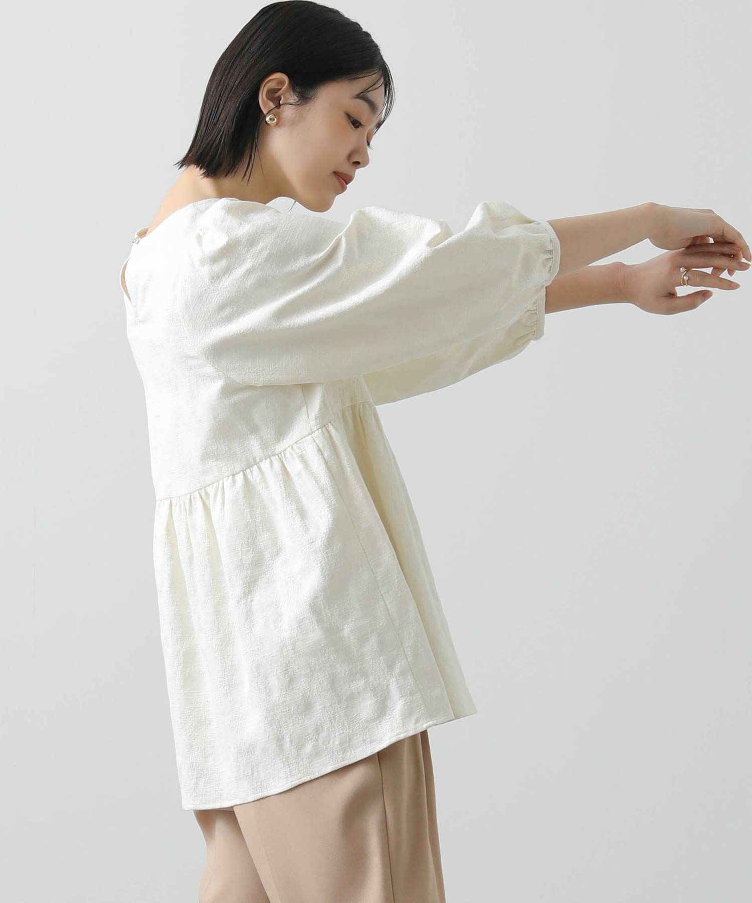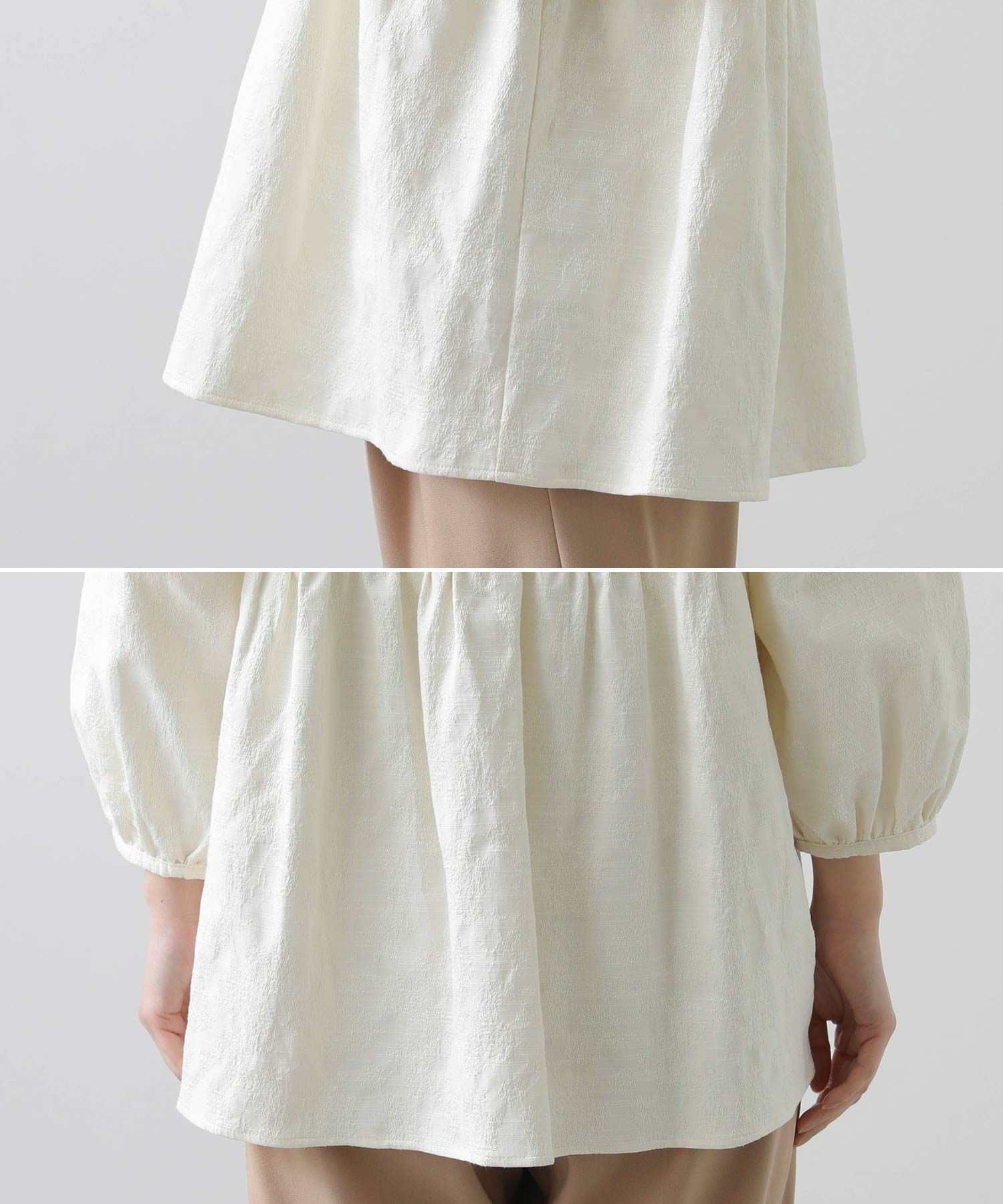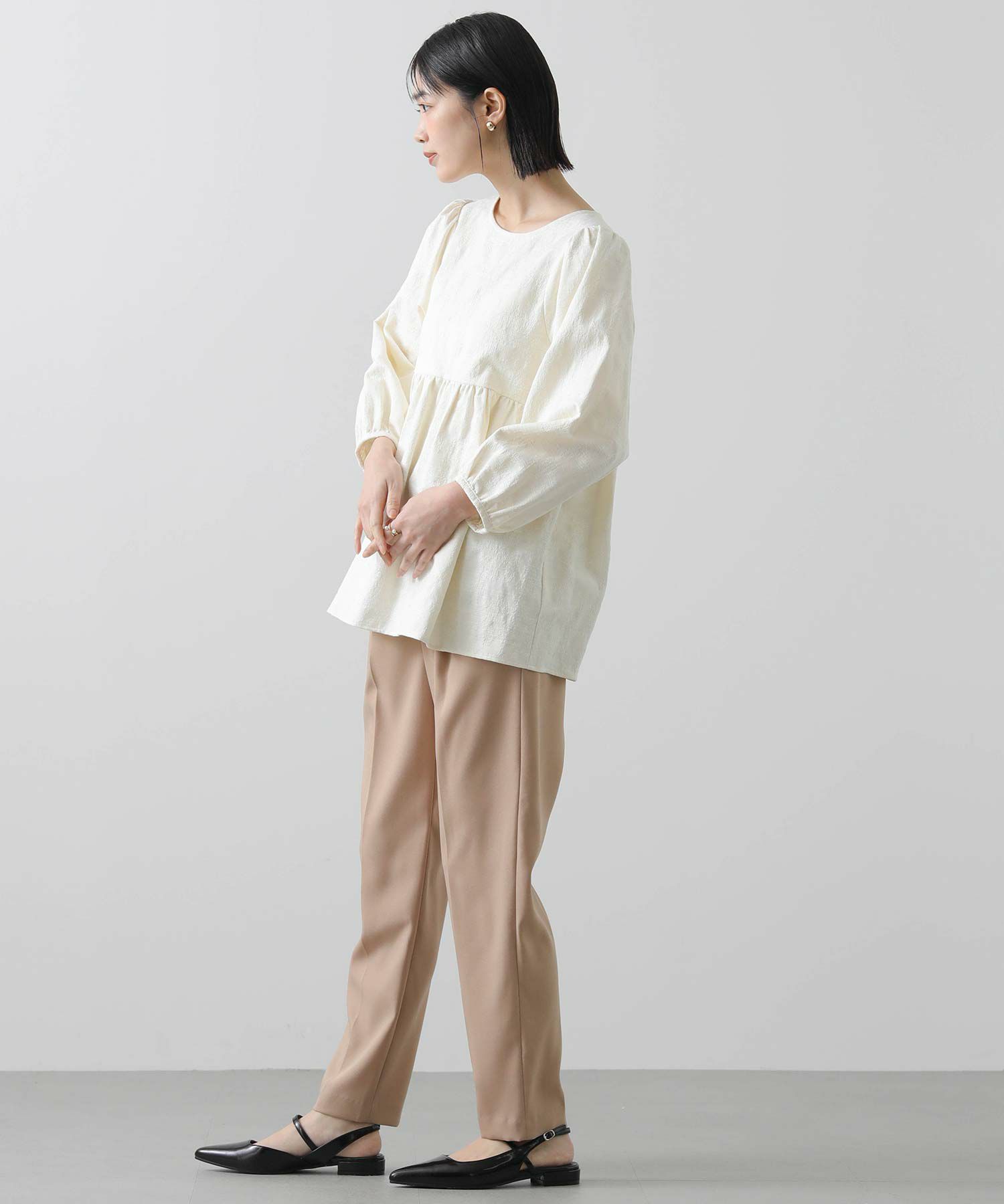 ウエスト切り替えは自然と腰の位置を高く、ウエストが細く見えるようなシルエットに。腰周りをカバーする着丈も◎おおげさ過ぎないボリューム感を出したパフスリーブで肩回りも華奢な印象になります。