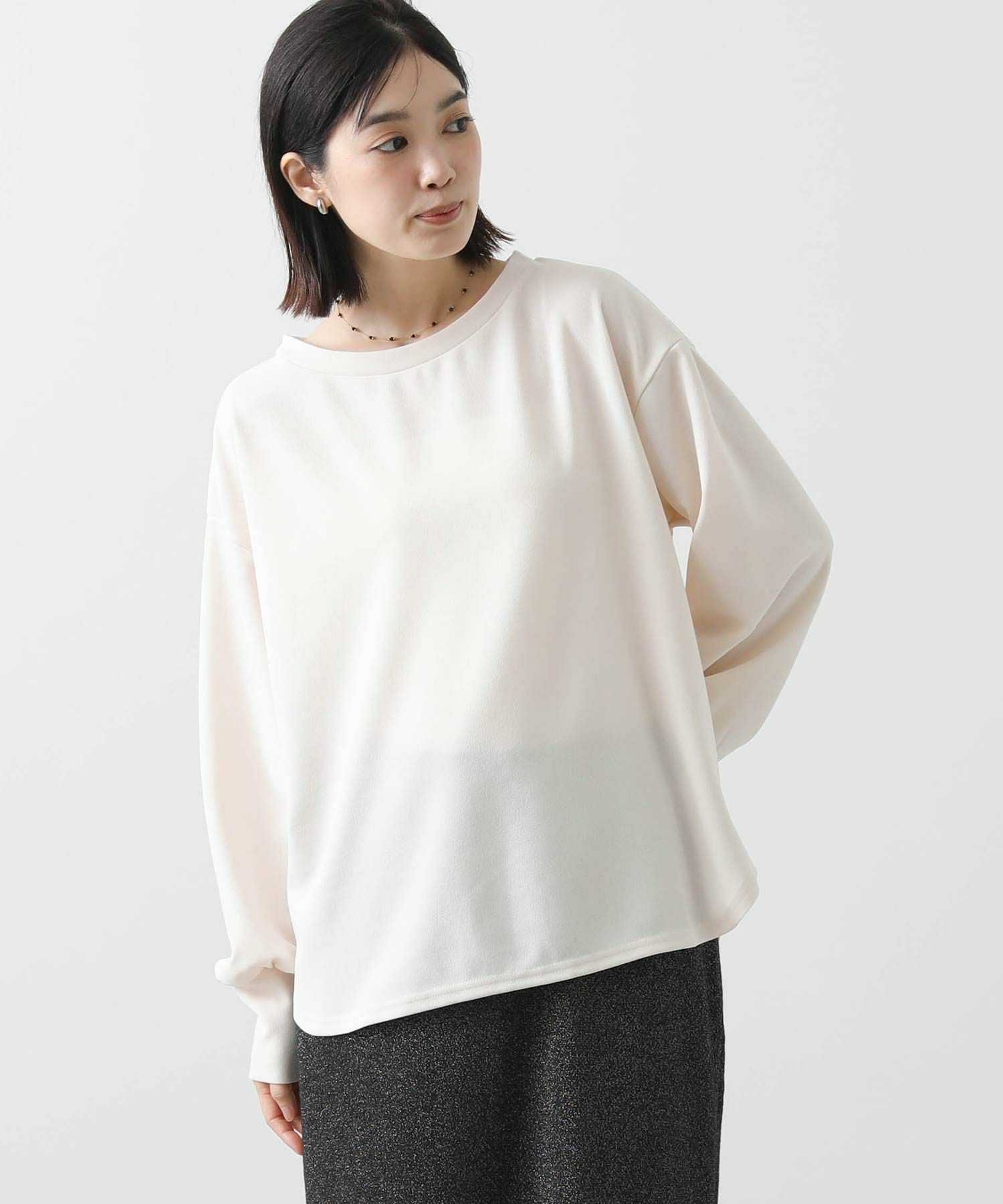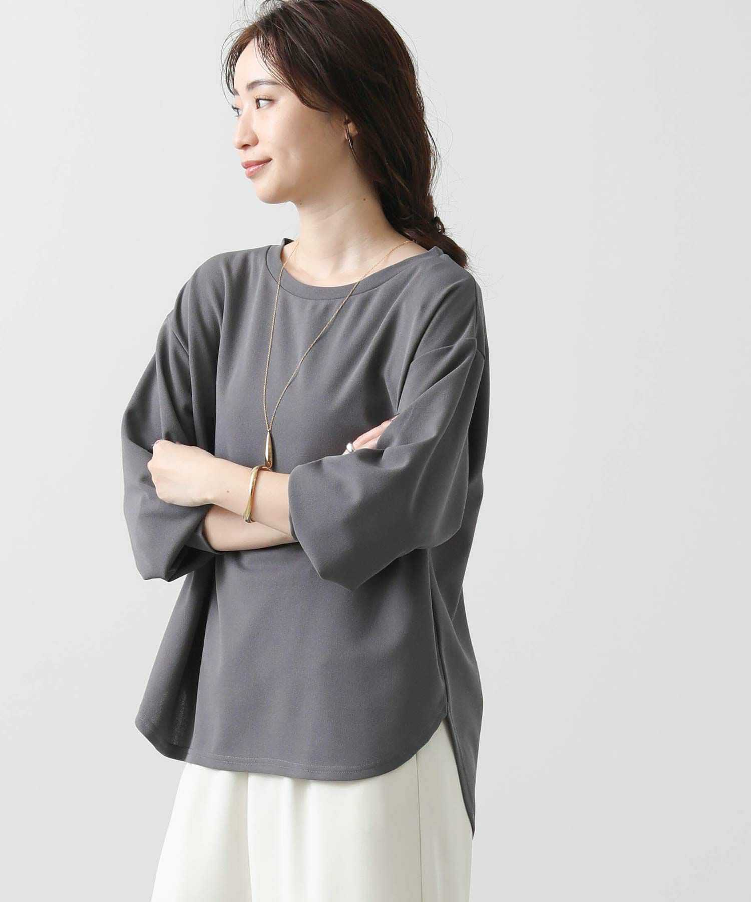 伸縮性のある着心地なので、堅苦しくなく着ていただけます。ボートネックで首回りがキレイに見えるように、裾はラウンドヘムにしてインしなくてもサマになるようにしています。