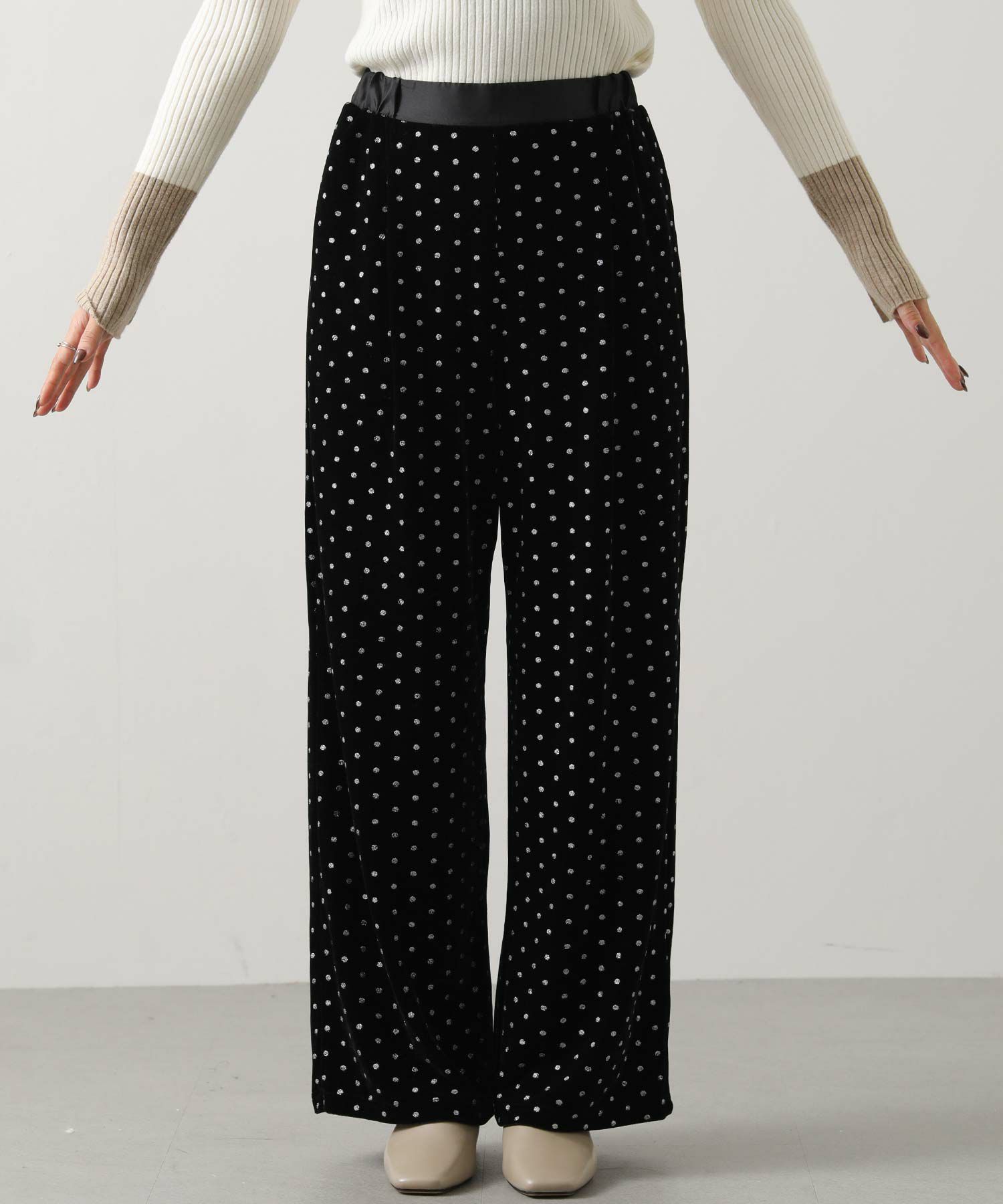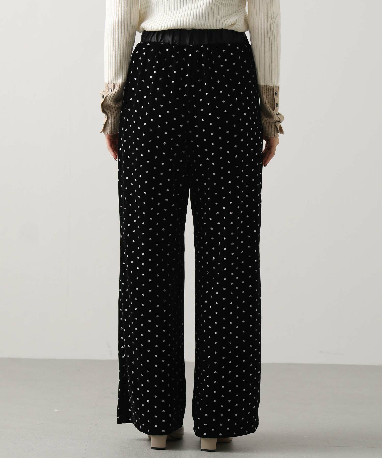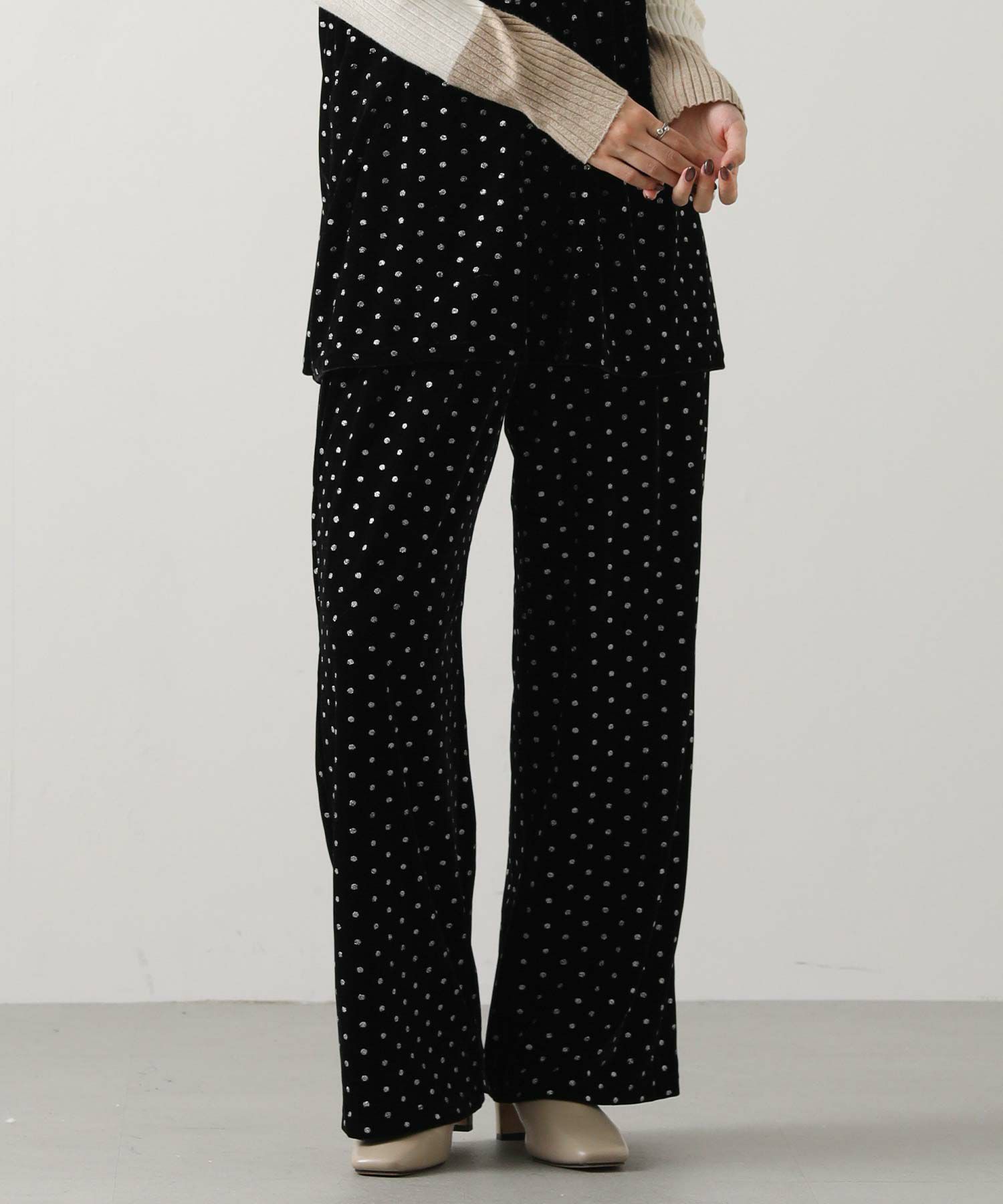 一気に旬顔になれるキラっとドット柄が華やかなベロアパンツ。
