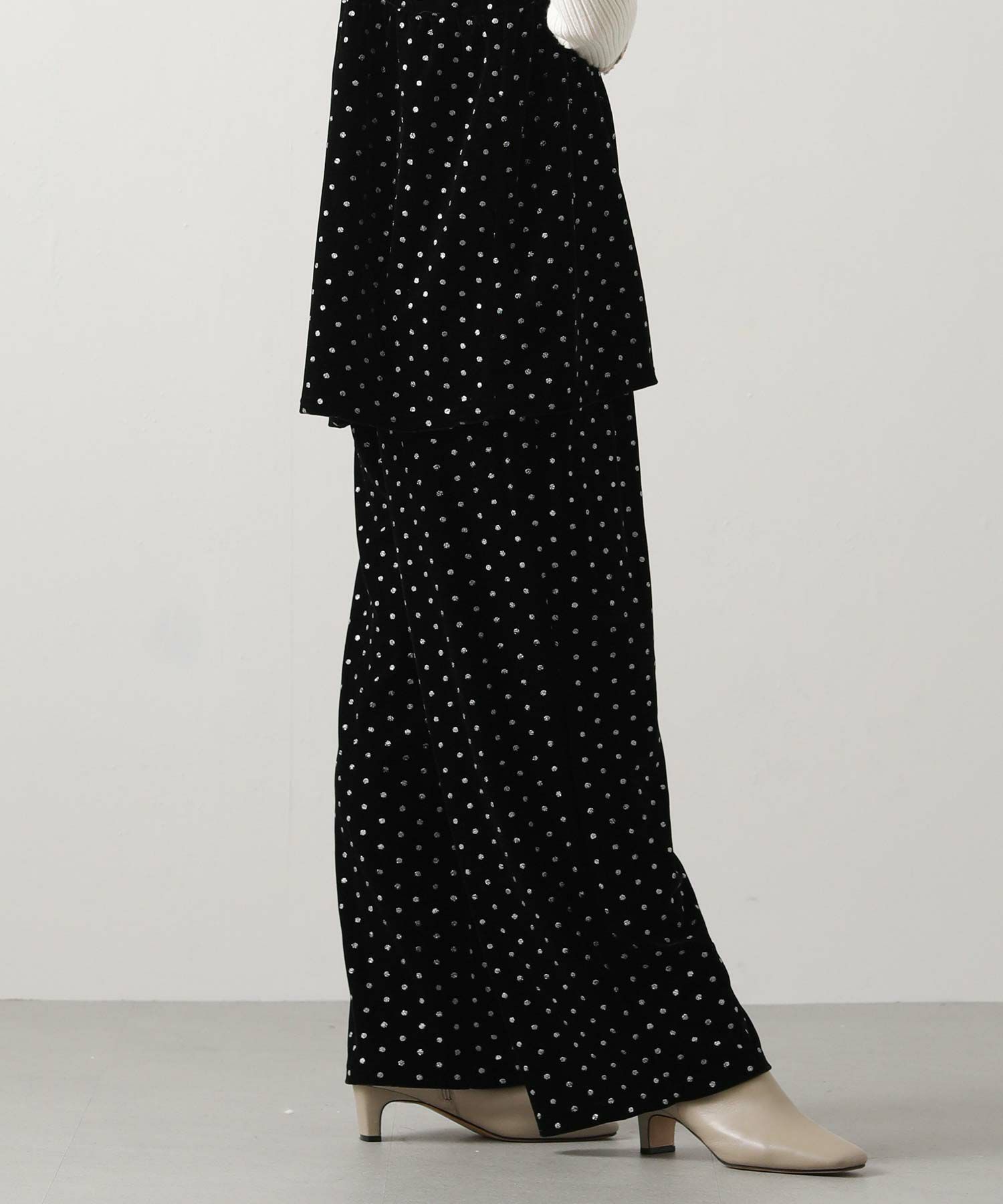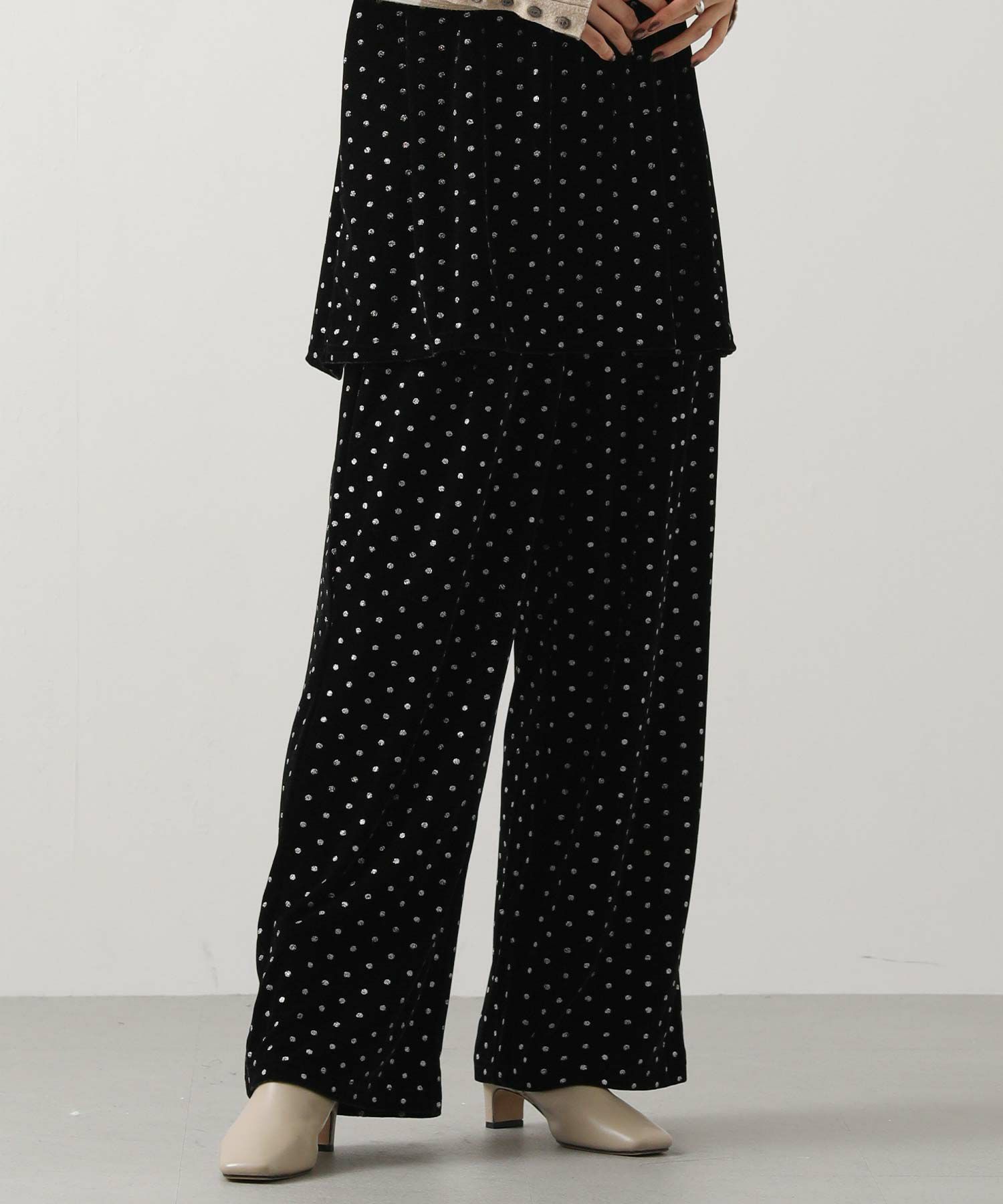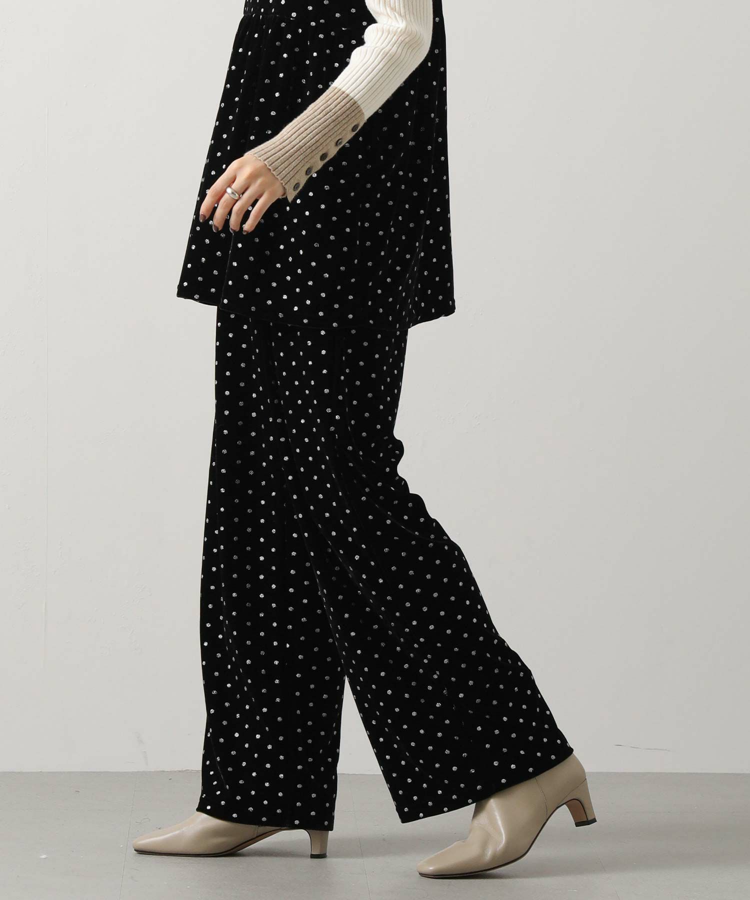 一気に旬顔になれるキラっとドット柄が華やかなベロアパンツ。