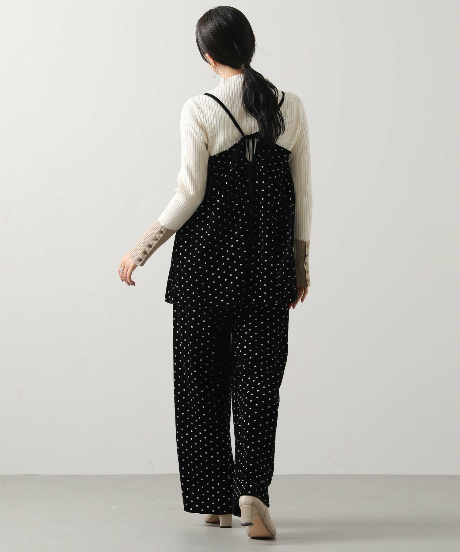 同素材のラメドットベロアキャミ(OD266418001)とセットアップで着るのもオススメ。