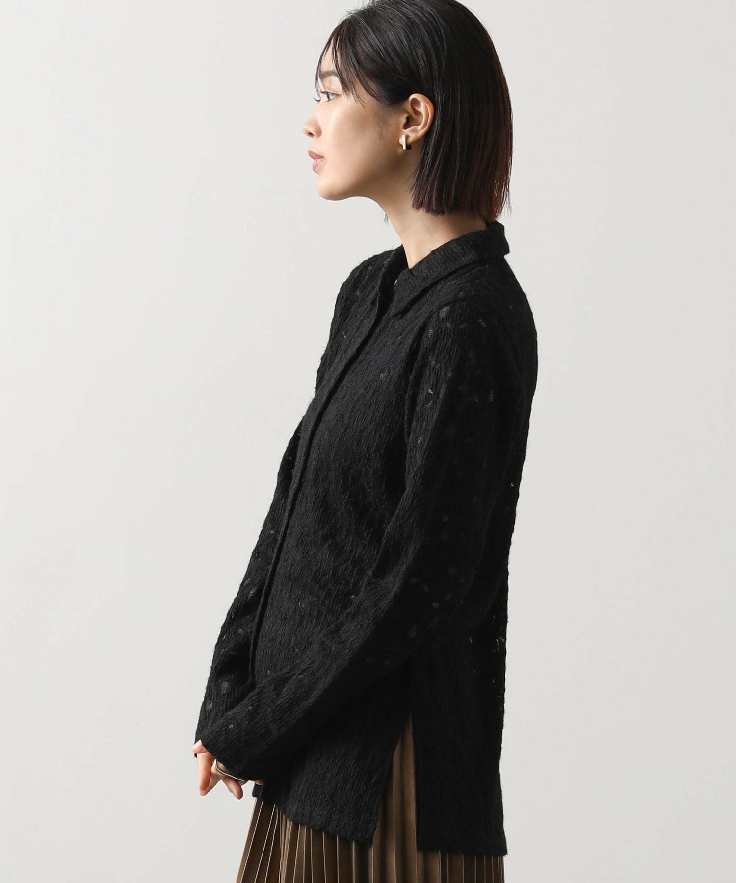 起毛したストレッチレース素材が柔らかく女性らしい印象を与え、インナーやボトム次第でさまざまなカジュアルスタイルに合わせやすいアイテム。