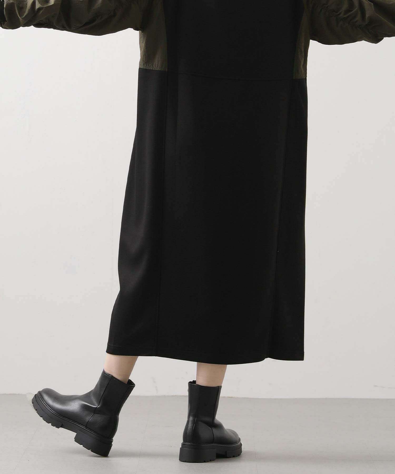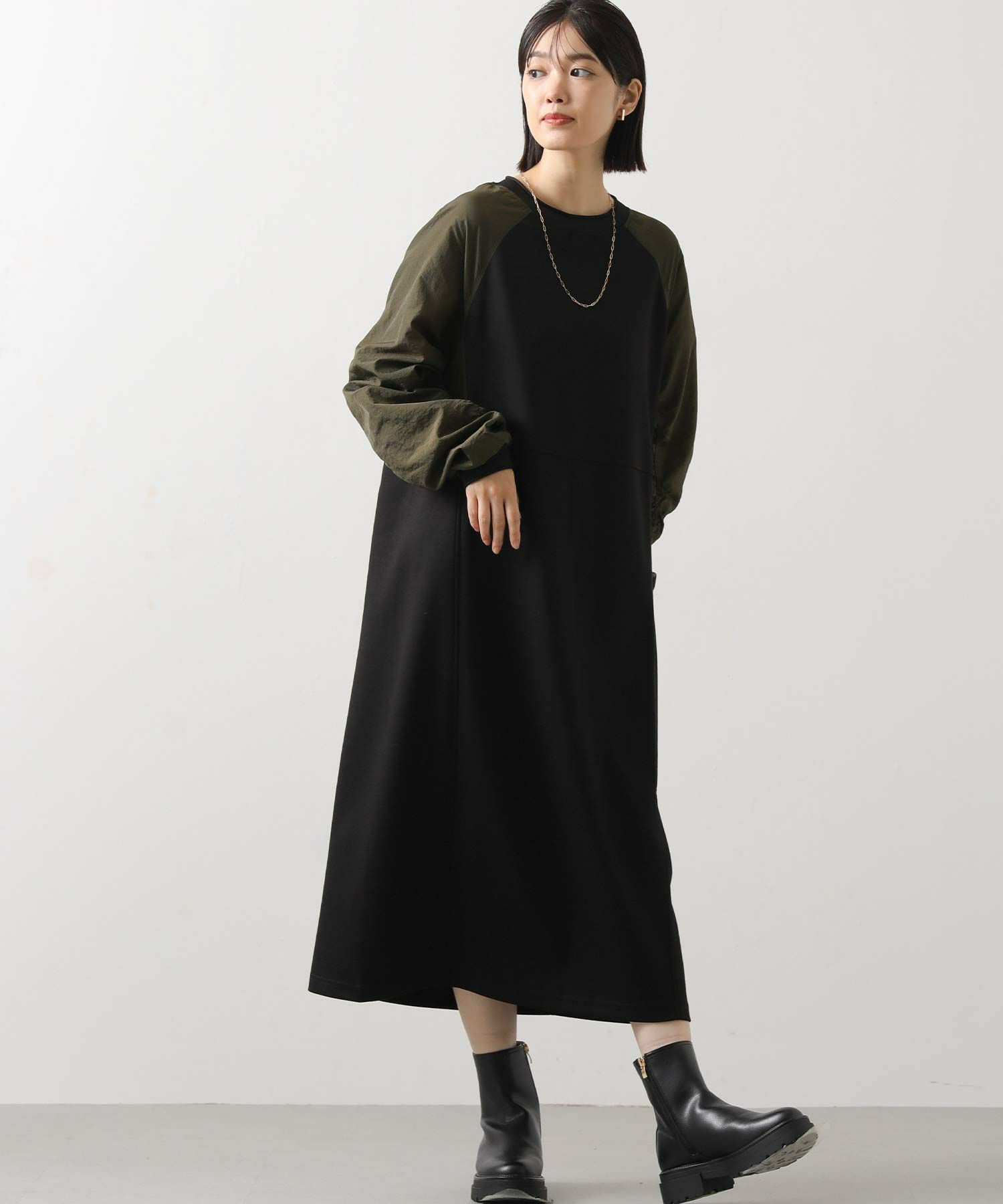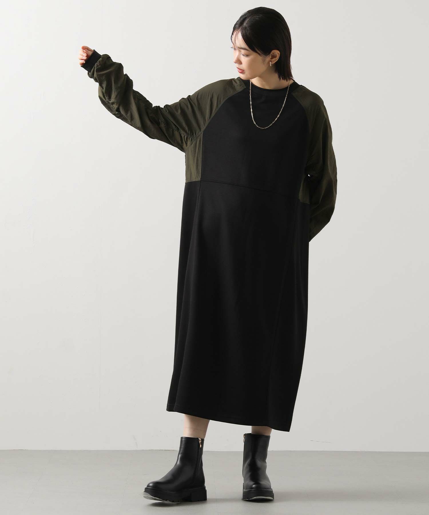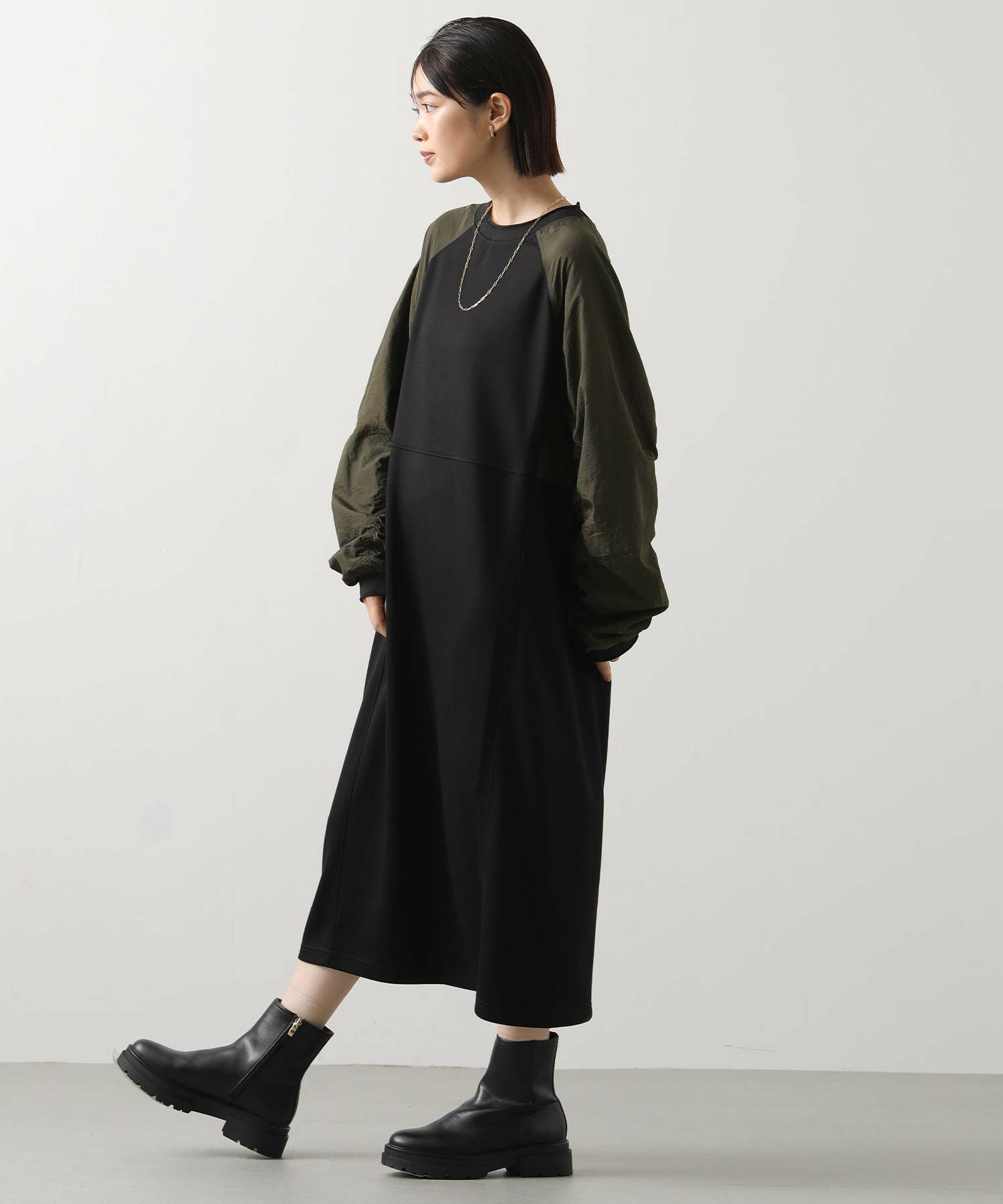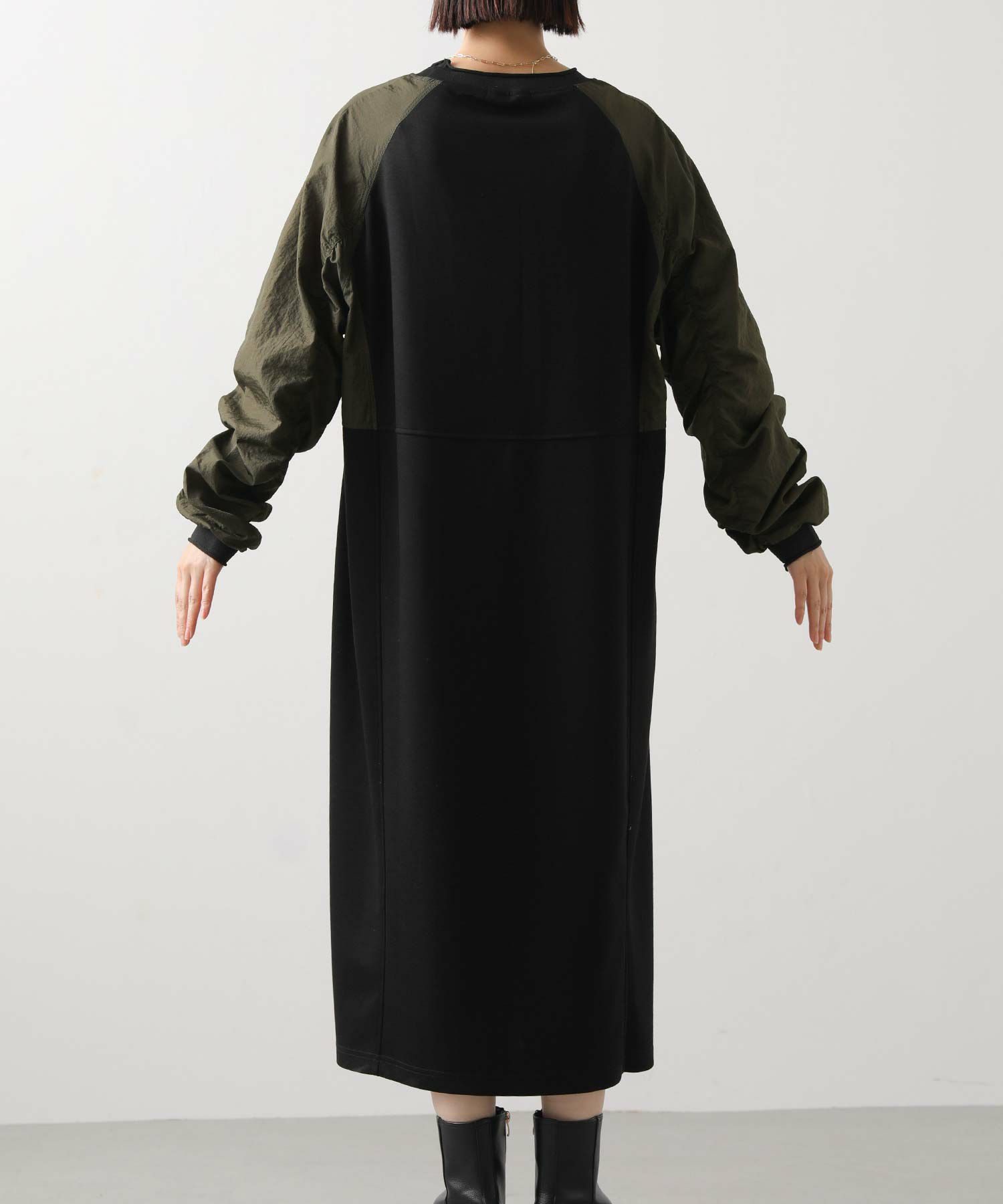 ワッシャーの軽やかな質感と、柔らかなカットソー素材を組み合わせたドッキングワンピース。