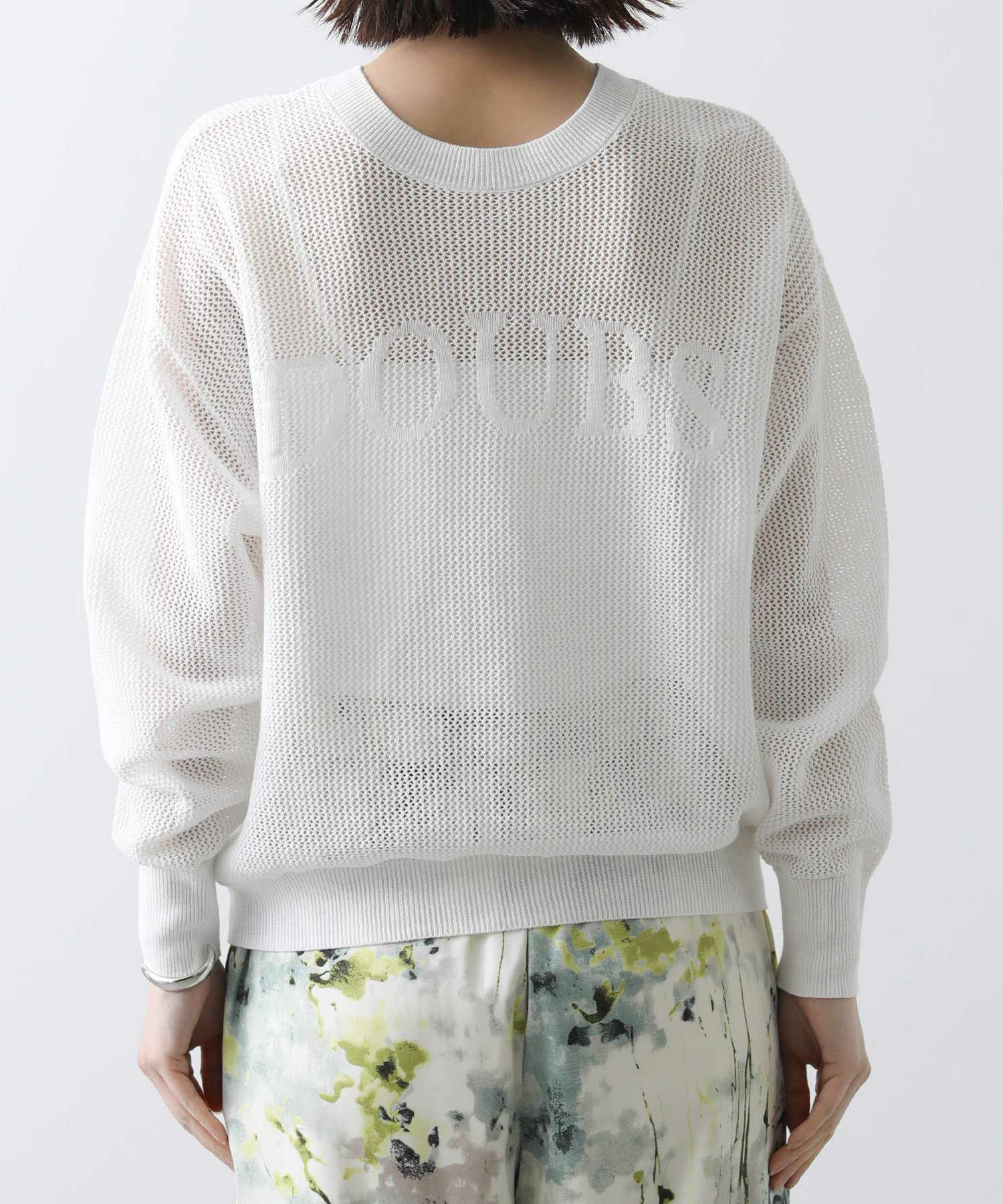 さりげなくロゴが入ったメッシュの編み地が軽やかなニット。