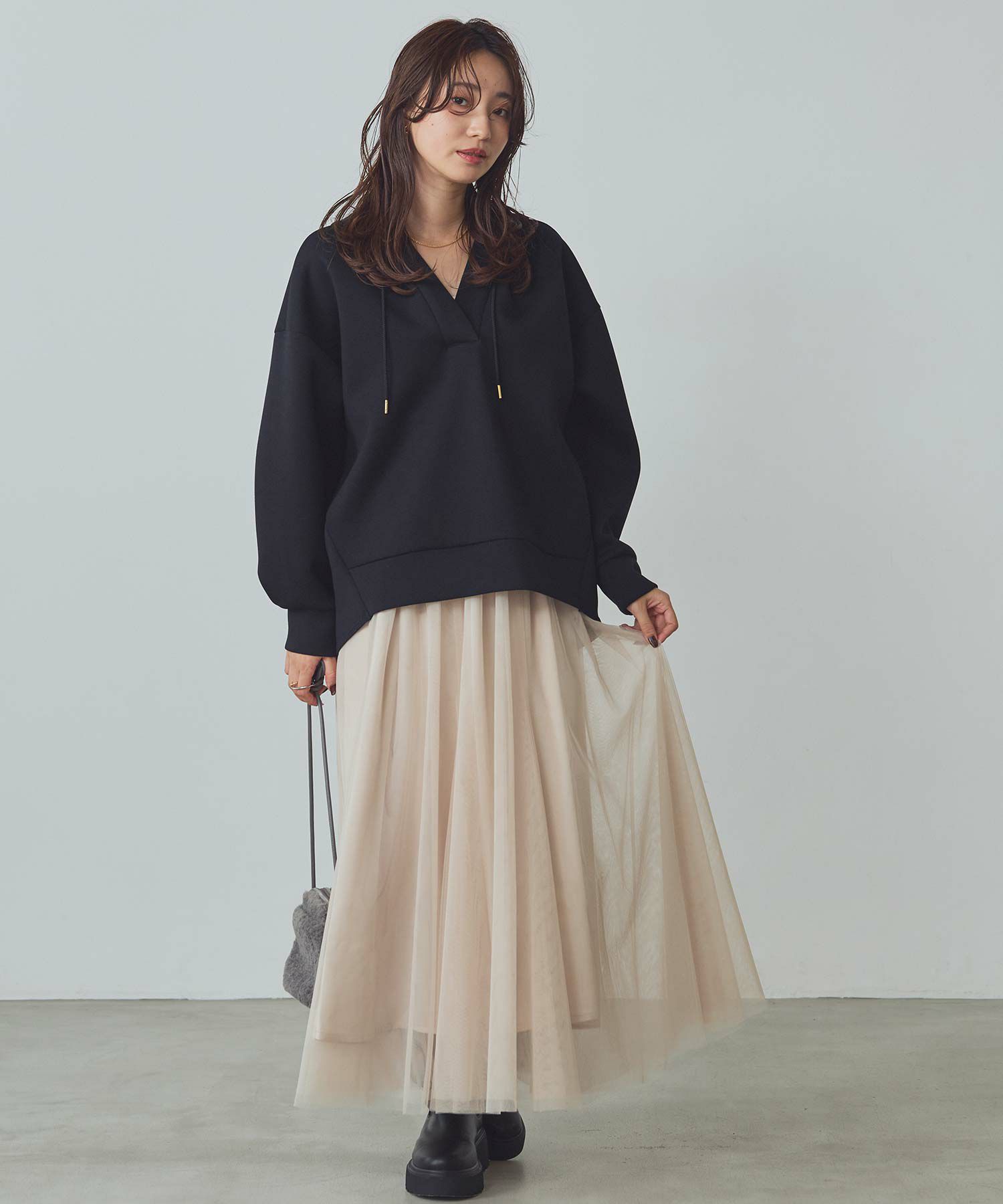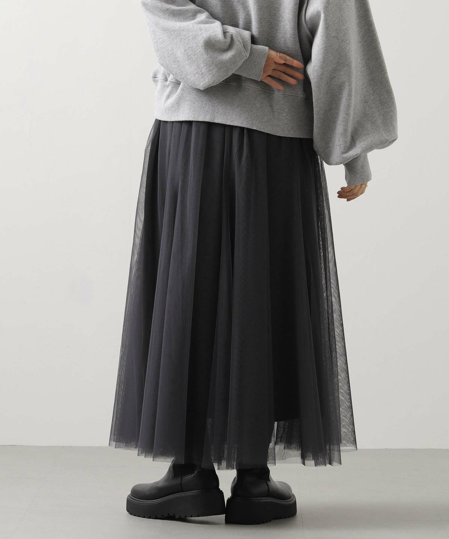 ふうわりと程よく広がるチュール素材を使用したボリュームのあるスカート。