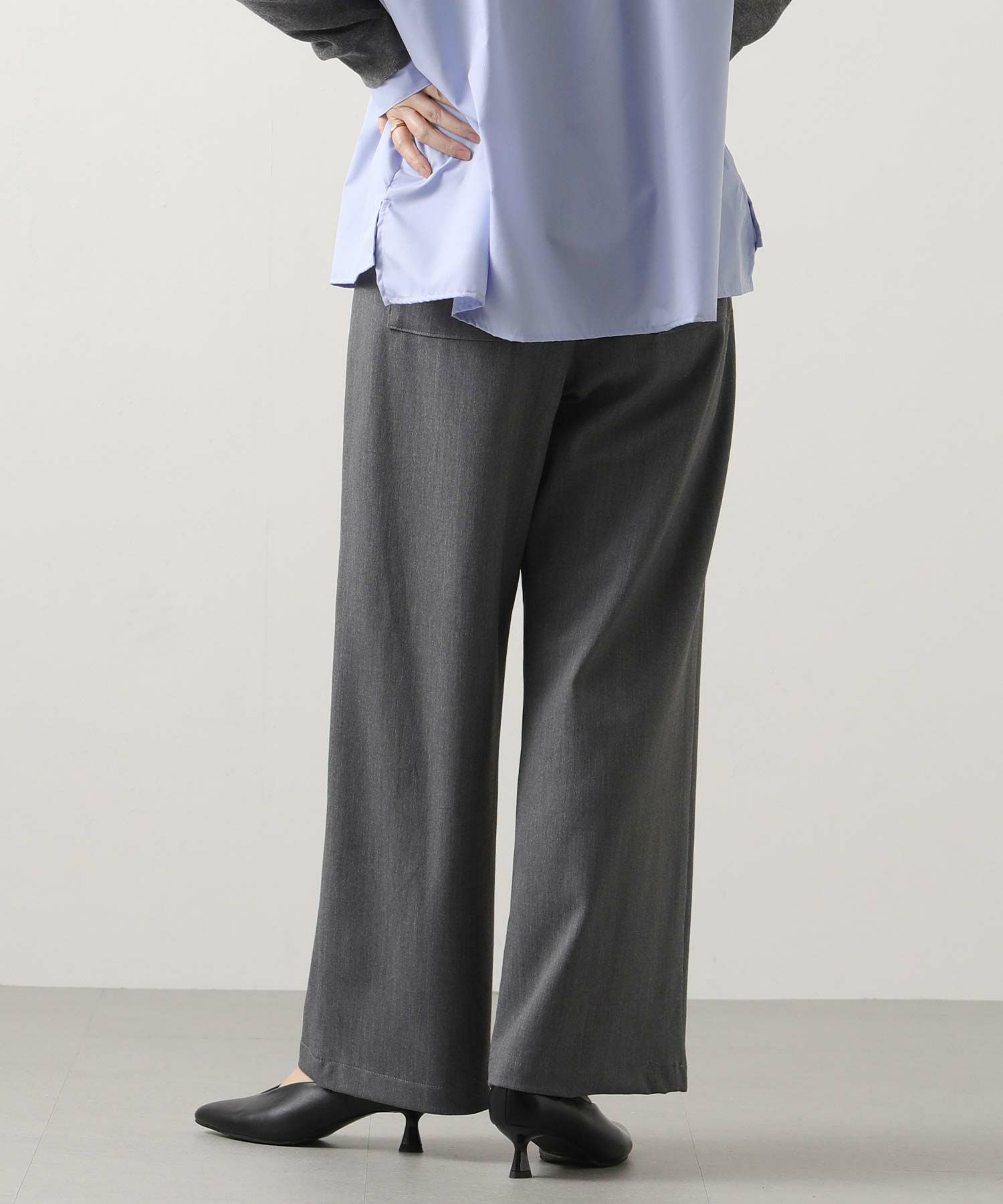 ウエスト総ゴムのイージーパンツながらきちんと見えする素材感なので、普段使いからオフィスでも着られるアイテム。